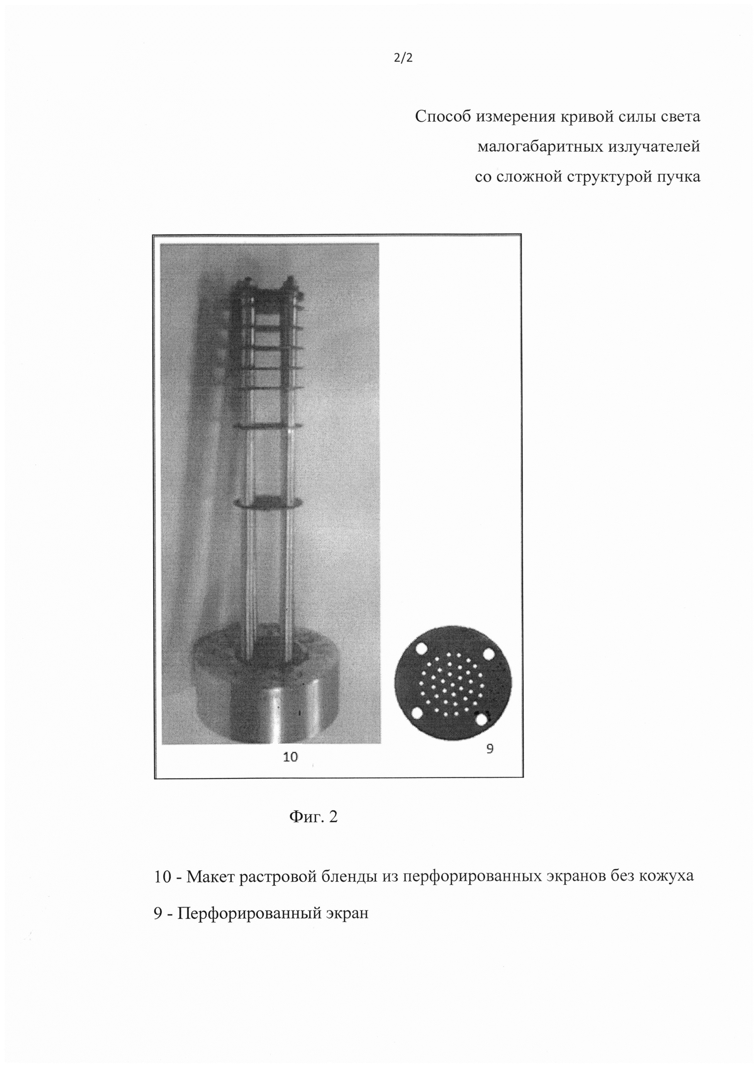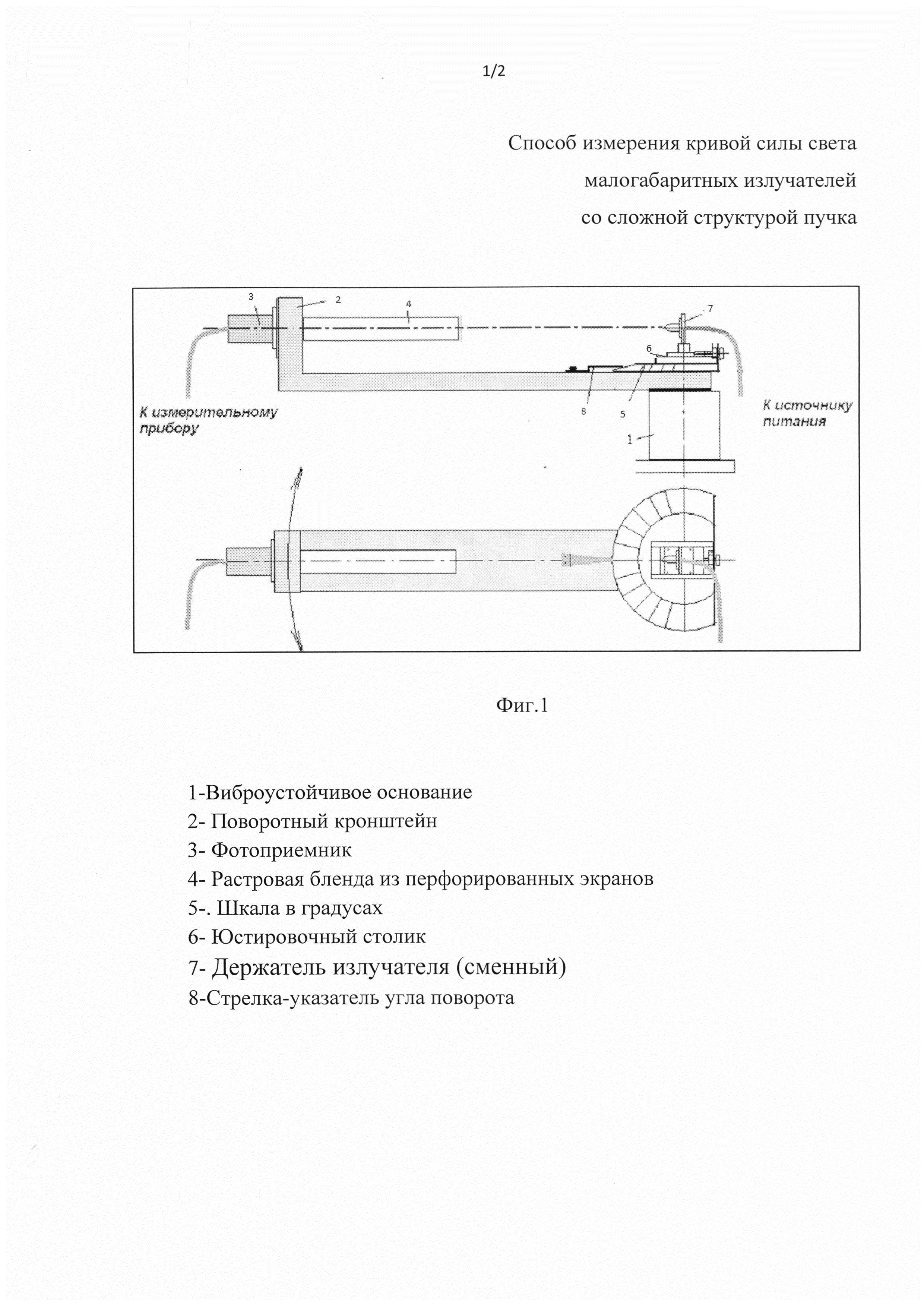 Изобретение относится к области светотехники и касается способа измерения кривой силы света малогабаритных излучателей со сложной структурой пучка. Способ включает в себя пространственную селекцию излучения с ограничением угла поля зрения фотоприемника до малых углов растровой блендой, установленной перед его чувствительной площадкой. При проведении измерений на посадочное место поворотного кронштейна закрепляют бленду из перфорированных экранов, а в растровую бленду устанавливают фотоприемник. Излучатель устанавливают в держателе источника излучения. К контактам излучателя подключают источник питания, а фотоприемник подключают к измерительному прибору. Фотоприемник поворачивают на поворотном кронштейне относительно излучателя на угол ±90с нужным шагом и регистрируют значение сигнала фотоприемника в каждой точке. Технический результат заключается в обеспечении возможности измерения относительной кривой силы излучения на малых расстояниях от излучателей, имеющих сложную структуру пучка. 1 з.п. ф-лы, 2 ил.