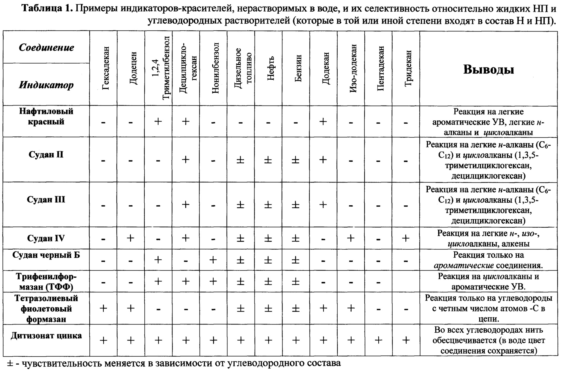 Изобретение относится к области обнаружения, идентификации и дистанционного мониторинга углеводородных загрязнителей водных сред и может быть использовано для экспрессного визуального обнаружения разливов и утечек жидких углеводородных топлив. Известны бортовые воздушные комплексы технических средств обнаружения и экологического мониторинга разливов нефти и нефтепродуктов на акваториях. Бортовой воздушный комплекс технических средств обнаружения и измерения разливов содержит радиометрический СВЧ датчик для обнаружения нефтеразливов, дополнительный пассивный датчик, приемник GPS и анализатор данных (RU 2411539, 2006). Известны плавающие или погружные комплексы обнаружения и экологического мониторинга разливов нефти и нефтепродуктов на акваториях, содержащие находящийся в погружном, в частности, в подледном положении измерительный буй с набором контактирующих с водой датчиков регистрации нефтегенных загрязнений, радионуклидов и металлов нефтегенного происхождения, размещенные внутри герметичного буя компактный флуоресцентный лидар, программируемый контроллер с системами сбора, предварительной обработки и передачи данных, генерируемых контактирующими с водой датчиками и лидаром, на удаленные интерфейсы информационной системы (RU 2587109, 2006, RU 2521246, 2013). Известно использование тепловизоров, устанавливаемых на беспилотный летательный аппарат, располагаемый в зависшем состоянии над зоной разлива. Тепловизор проводит съемку в виде ряда цифровых изображений, которые через приемно-передающее устройство беспилотного летательного аппарата в режиме реального времени передаются на пункт круглосуточного дистанционного наблюдения, где оцениваются параметры разливов нефти и нефтепродуктов. На основании полученных данных строятся прогнозные карты распространения разливов нефти и нефтепродуктов, которые в виде телеметрической информации передаются на экипажные или безэкипажные катера, осуществляющие развертывание в районе загрязнений боновых заграждений и последующий сбор нефти и нефтепродуктов (RU 2622721, 2006). Недостатками известных технических решений являются большие затраты на проведение исследований, неоперативность и периодичность мониторинга. Запаздывание получения результата от момента отбора проб составляет в среднем 5-6 ч. При такой системе отсутствует постоянная достоверная информация о состоянии акваторий, а также промышленных сточных вод. Из экспресс-тестов для обнаружения разливов нефтепродуктов известны индикаторные полоски MACHEREY-NAGEL (Water analysis. Rapid tests. Catalog MACHEREY-NAGEL. 2012. 162 p.), C.I. Agent (C.I. Agent solutions. Secondary containment & oil filtration solutions. CIAS-Catalog. 2017. 8 p.), позволяющие оперативно проводить обнаружение нефтяных загрязнений воды и почвы. Однако чувствительность этих тестов сильно зависит от природы соответствующих углеводородов, а в случае наличия летучих углеводородов результат необходимо считывать немедленно. К недостаткам этих индикаторных полосок следует отнести также низкую чувствительность, а также отсутствие возможности идентификации нефтепродуктов и отдельных классов углеводородов при смене окраски со светло-синего на темно-синий. Из известных технических решений наиболее близким к предлагаемому по технической сущности и достигаемому результату является индикаторный элемент, состоящий из подложки, 