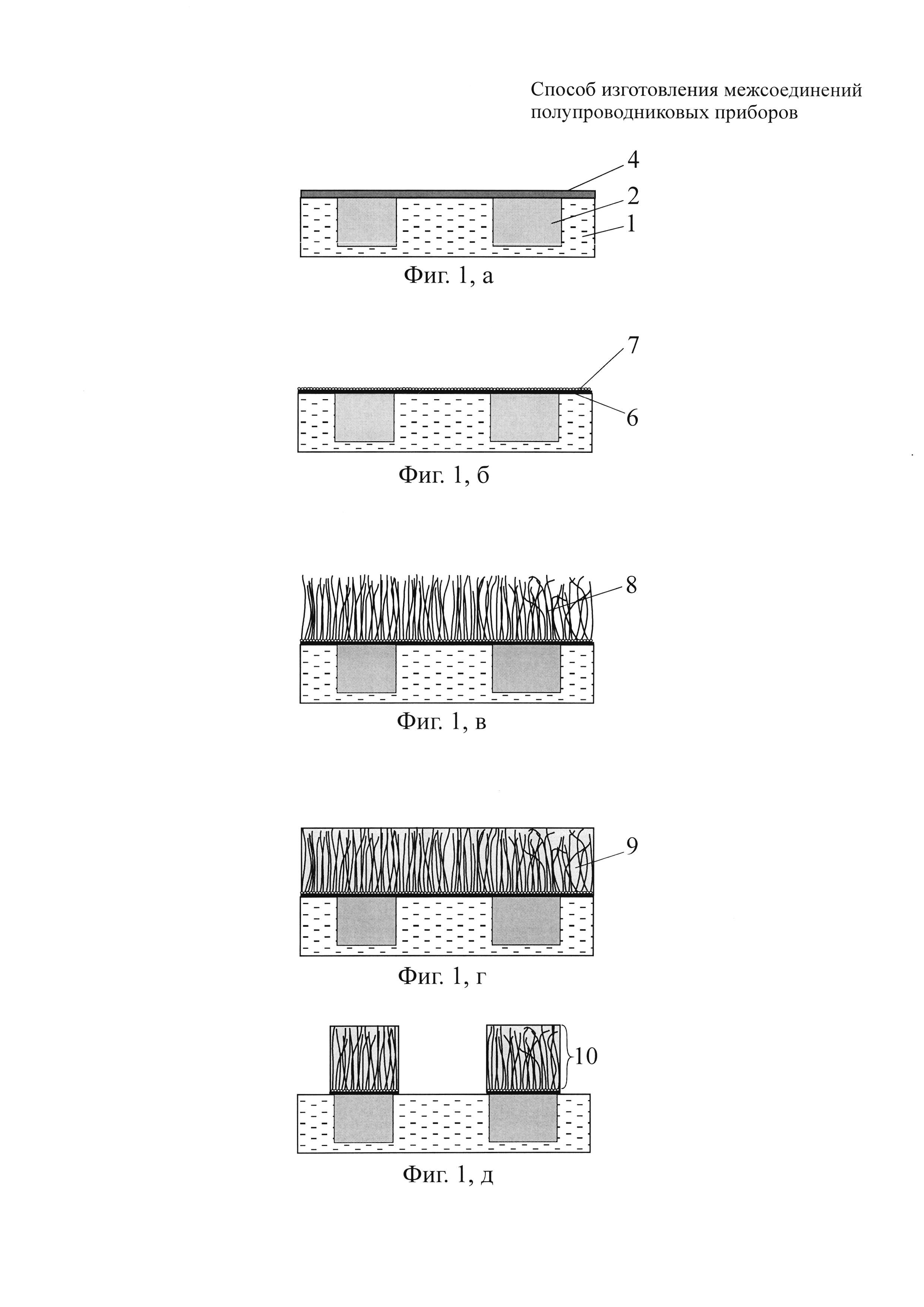 Использование: для изготовления многоуровневой системы межсоединений кремниевой интегральной схемы. Сущность изобретения заключается в том, что способ изготовления межсоединений полупроводниковых приборов, включающий формирование частиц нанометрового размера на поверхности, выращивание наноматериала на указанных частицах нанометрового размера, осаждение на подложку проводящего материала, формирование композитного материала из наноматериала и проводящего материала, формирование изолированных друг от друга межсоединений, перед формированием частиц нанометрового размера производится нанесение слоя сплава, который содержит компонент для формирования частиц нанометрового размера, представляющий собой элемент или комбинацию элементов из I и/или VIII группы, и компонент для формирования диффузионно-барьерного слоя, представляющий собой переходный металл или комбинацию переходных металлов из IV-VI групп Периодической таблицы элементов, и термическое воздействие на него. Технический результат: обеспечение возможности упрощения технологии формирования межсоединений прибора, повышения стойкости к электромиграции при высоких плотностях тока, повышения термической стабильности межсоединений. 6 з.п. ф-лы, 2 ил.
