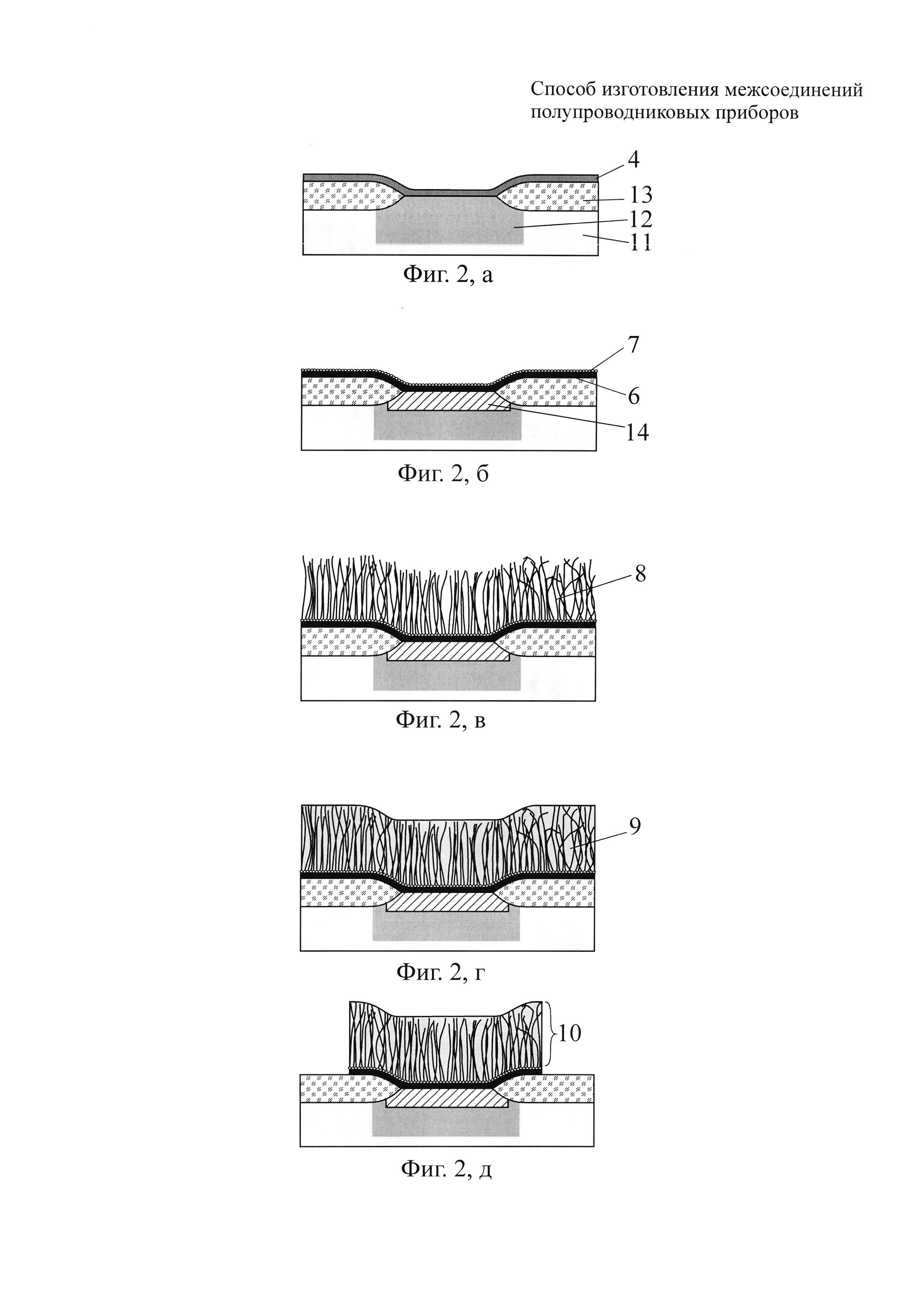 Областью применения изобретения является микро- и наноэлектроника, где используются изолированные диэлектриком проводники. В частности, изобретение может быть использовано для изготовления многоуровневой системы межсоединений кремниевой интегральной схемы (ИС), особенно в случае, если они эксплуатируются при высоких температурах. Для создания многоуровневой системы межсоединений используются два основных подхода. Первый - это формирование сплошного слоя материала межсоединений, а далее его травление через маску, в результате чего образуются межсоединения 1-го уровня, формирование межуровневого диэлектрического слоя, заполняющего, в том числе, пространство между межсоединениями, формирование контактных колодцев и их заполнение проводящим материалом, в результате чего формируются межуровневые межсоединения и далее повторение операций для формирования следующего уровня межсоединений. Второй - это так называемая технология «damascene», которая включает формирование в диэлектрическом слое углублений, являющихся переходными колодцами и траншеями, осаждение диффузионно-барьерного слоя на поверхности диэлектрика, дне и боковых стенках углублений, заполнение углублений проводящим материалом, химико-механическую полировку для удаления проводящего материала с поверхности диэлектрика и планаризации рельефа, не затрагивая проводящего материала в углублениях [1, 2]. Уменьшение размеров элементов, обусловленное стремлением повысить быстродействие интегральных схем, приводит к уменьшению поперечного сечения межсоединений, увеличению их общей длины, повышению степени интеграции элементов и увеличению плотностей токов, протекающих через них. В настоящее время промышленностью освоены или осваиваются технологические нормы размеров 45, 32, 22, 16, 11 нм, таким образом, размеры сечения межсоединения на нижнем уровне относится к нанометровому диапазону. При этом в таких межсоединениях возникают плотности тока порядка 106-107 А/см2. Одновременно с этим на верхнем последнем уровне разводки размеры сечения межсоединений составляют единицы микрон. В свою очередь, повышение плотностей токов и возрастание степени интеграции элементов вызывает увеличение выделения количество тепла с единицы площади поверхности ИС. Это тепло должно эффективно отводиться от кристалла. В случае перегрева кристалла в локальной области может начаться процесс быстрой деградации свойств элементов разводки. Данная проблема усложняется тем, что при повышении температуры межсоединения повышается его удельное сопротивление и, как следствие, выделение тепла возрастает еще больше, что приводит к возникновению процесса электромиграции и деградации элементов разводки, вплоть до разрыва контакта. Известны ИС, работающие при повышенных температурах [3], в которых все отмеченные проблемы усугубляются еще более с добавлением проблем увеличения удельного сопротивления из-за наличия у проводников положительного температурного коэффициента сопротивления и различия в температурных коэффициентах объемного (линейного) расширения. Известно техническое решение проблемы, в котором способ изготовления межсоединений полупроводникового прибора включает в себя формирование углублений в виде контактных колодцев в изоляторе, процесс осаждения каталитического м
