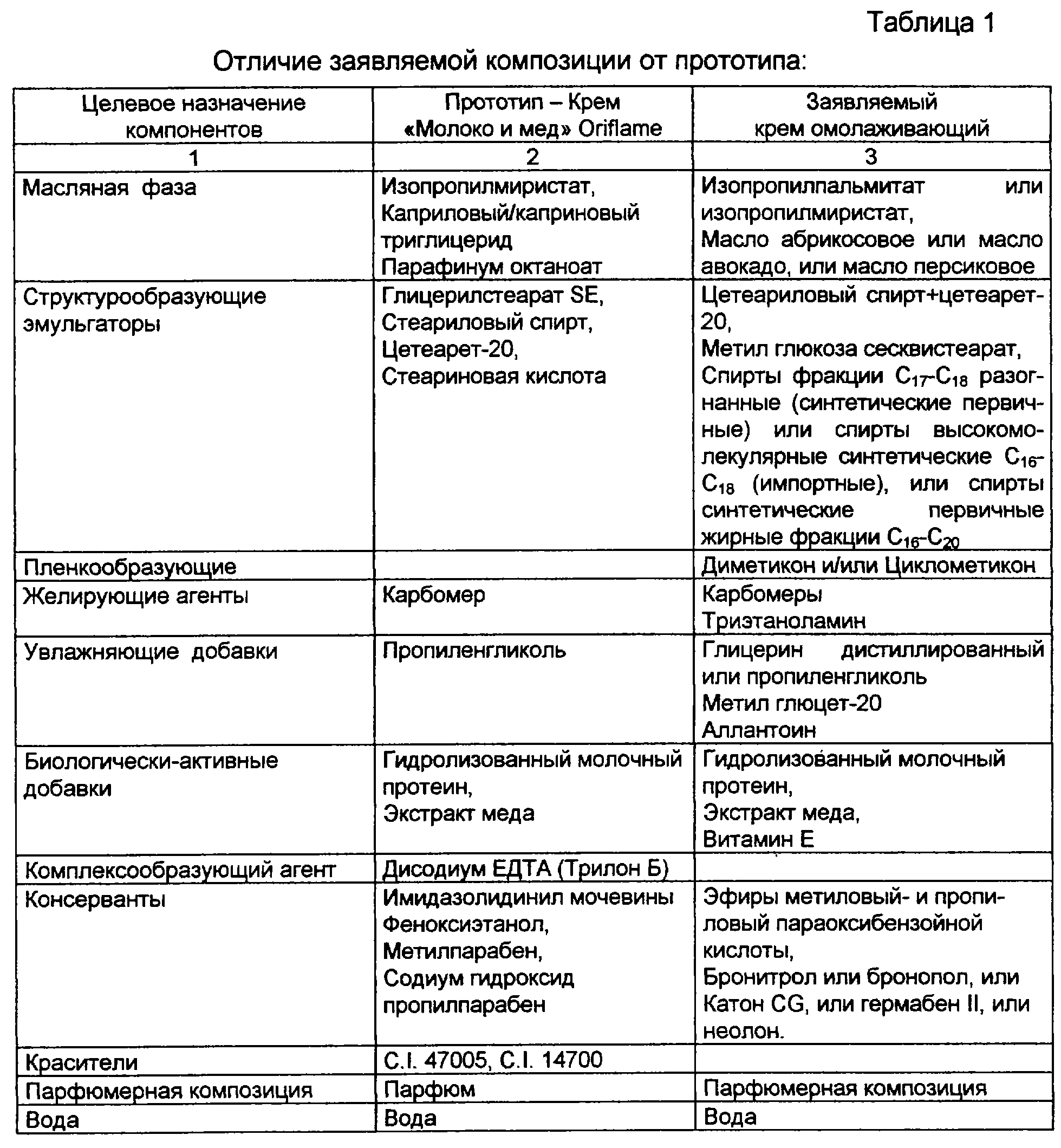 омолаживающий, молочко для тела, крем для рук, крем-маска питательная. Отличие заявляемой композиции от прототипа представлено в табл. 1. Крем-прототип содержит масляную