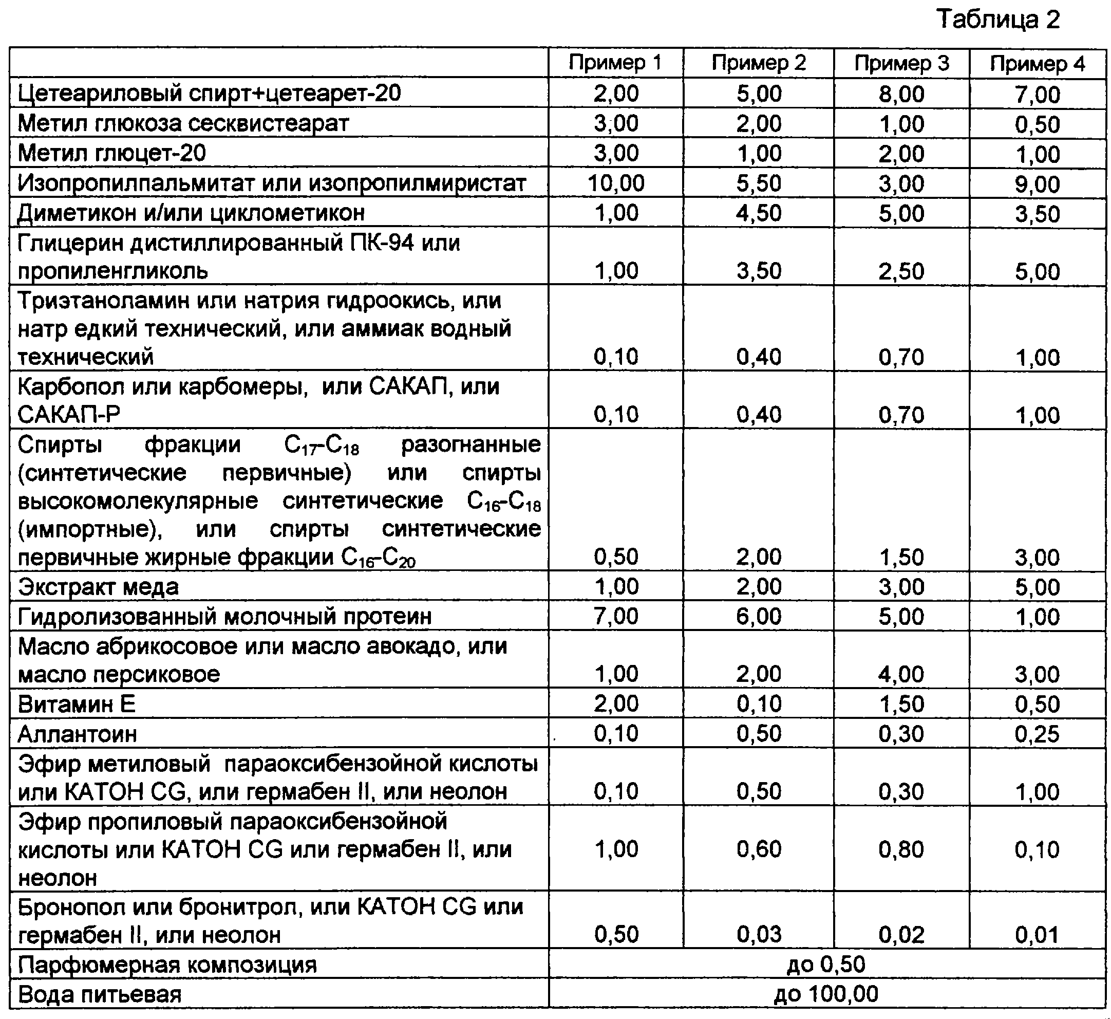 Состав крема омолаживающего "Молоко и мед", мас.%, по нескольким примерам приведен в таблице 2.