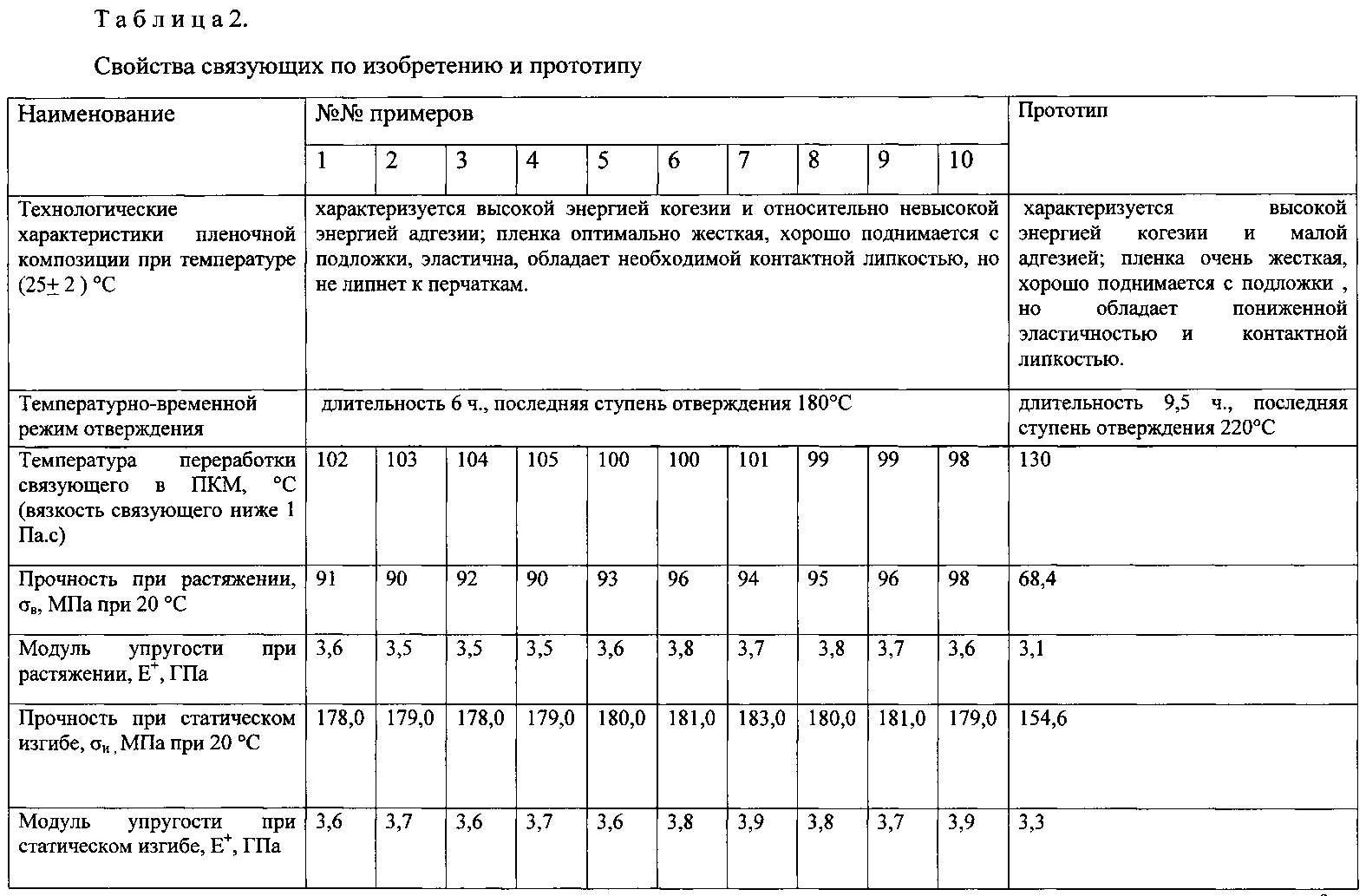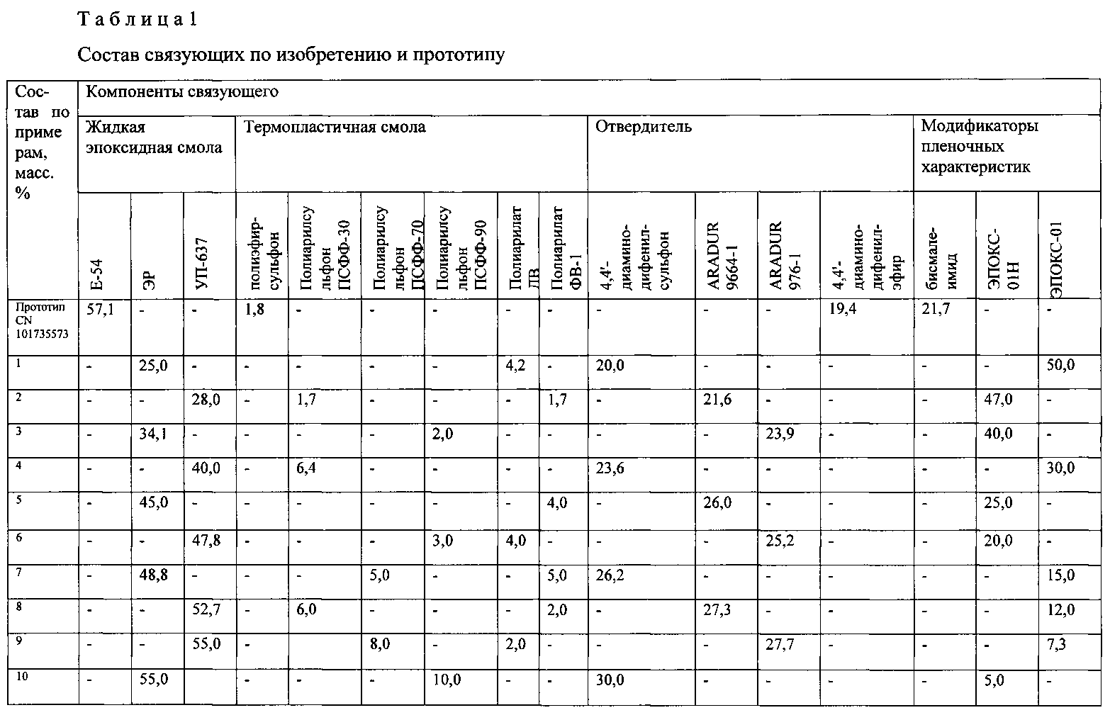 1. Эпоксидное связующее пленочного типа, включающее низковязкую эпоксидную смолу, термопластичную смолу, отвердитель ароматического амина, модификатор пленочных свойств, отличающееся тем, что в качестве низковязкой смолы используют диглицидиловый эфир резорцина, в качестве термопластичной смолы используют полиарилсульфон, полиарилат или их смеси, в качестве отвердителя ароматического амина - отвердитель 4,4′-диаминодифенилсульфон, а в качестве модификатора пленочных свойств - эпоксиимидную смолу при следующем соотношении компонентов, мас.%: 2. Эпоксидное связующее пленочного типа по п. 1, отличающееся тем, что используют эпоксиимидную смолу, представляющую собой смесь эпоксидной смолы с имидным олигомером.диглицидиловый эфир резорцина 25,0-55,0 полиарилсульфон, полиарилат или их смеси 2,0-10,0 4,4′-диаминодифенилсульфон 20,0-30,0 эпоксиимидная смола 5,0-50,0
