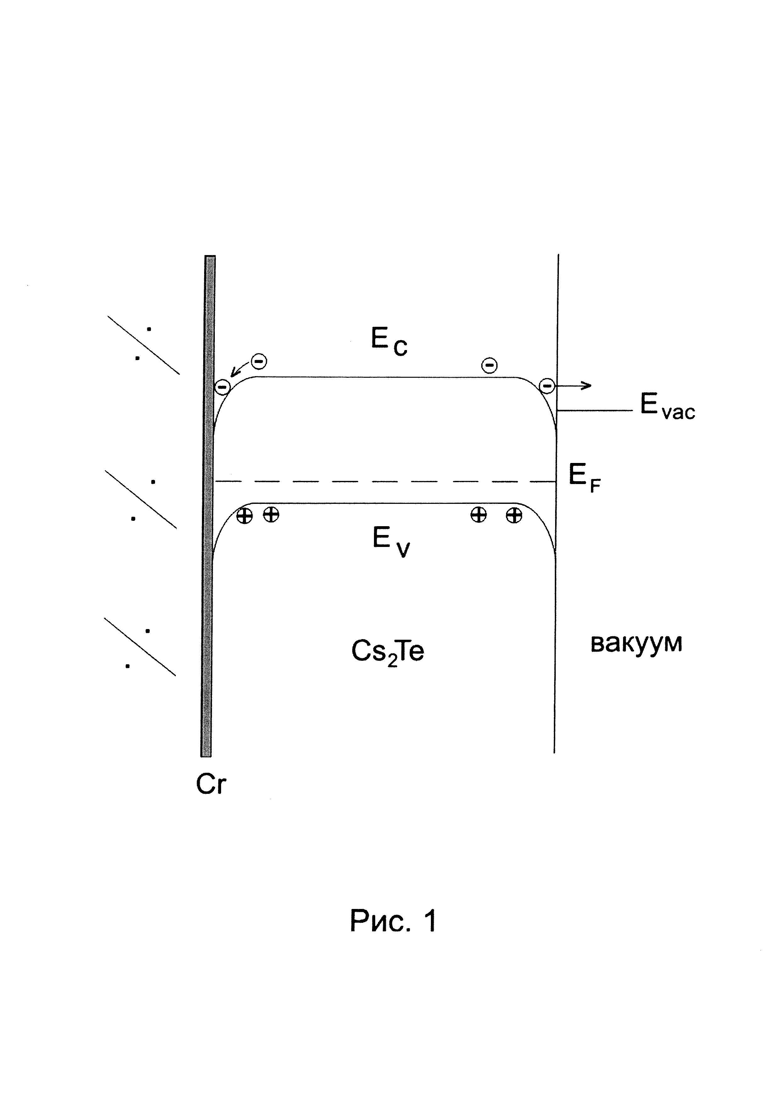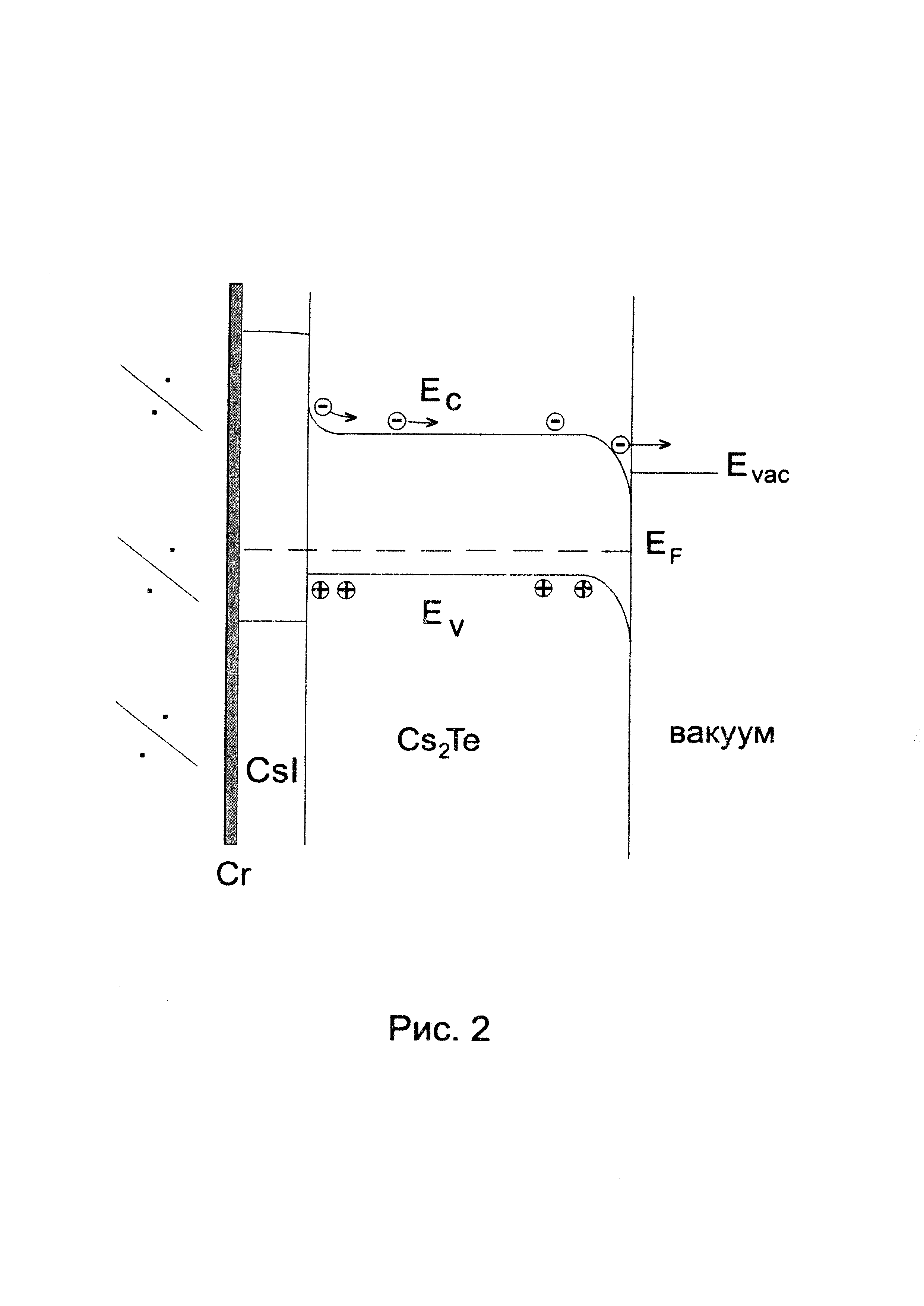 1. Фотокатод повышенной чувствительности, состоящий из подложки, фотоэмиссионного слоя и промежуточного слоя для увеличения потенциального барьера между подложкой и фотоэмиссионным слоем, отличается тем, что фотоэмиссионный слой выполнен из теллурида цезия - Cs2Te, а промежуточный слой для увеличения потенциального барьера между подложкой и фотоэмиссионным слоем выполнен на основе йодида цезия - CsI. 2. Способ изготовления фотокатода повышенной чувствительности заключается в нанесении на подложку проводящего материала (Cr, Mo, W), нанесении на поверхность Те, обработке этой поверхности парами Cs для получения Cs2Te фотокатода, отличается тем, что между проводящим материалом и фотокатодом наносят слой щелочного металла и обрабатывают его парами йода I для получения промежуточного слоя йодистого цезия CsI, обеспечивающего создание потенциального барьера между подложкой и фотокатодом.