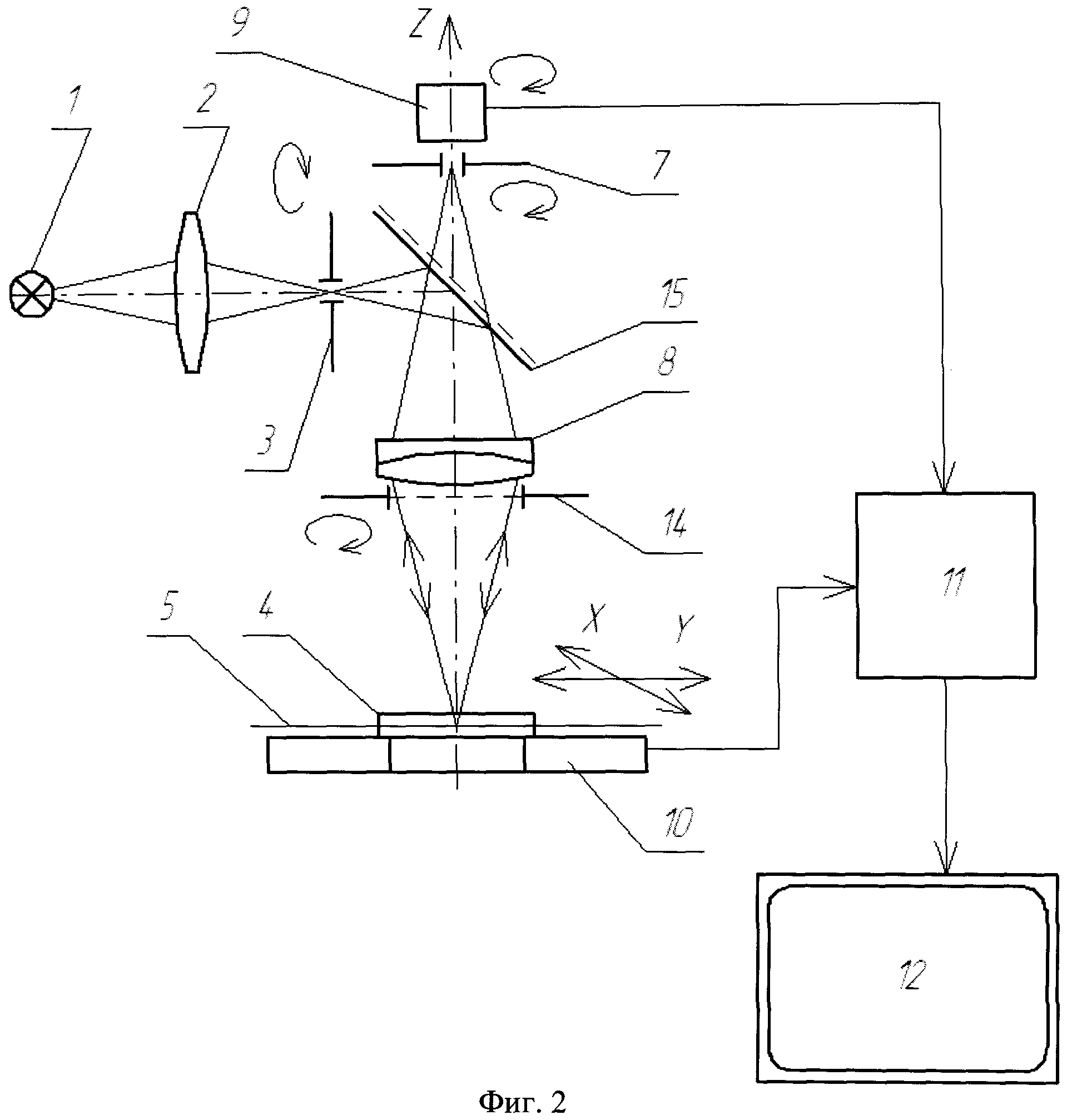 Область техники, к которой относится изобретение Группа изобретений относится к микроскопии, а именно к способам формирования изображения микрообъектов и к устройству конфокальных сканирующих микроскопов, и может быть использовано при исследовании различных микрообъектов, в том числе живых биологических структур. Уровень техники Известно устройство (патент США №3013467, опубликован 19.12.1961), реализующее способ формирования изображения микрообъекта, согласно которому свет через осветительную диафрагму направляют на исследуемый микрообъект, фокусируют свет в выбранной плоскости исследования в области исследуемого микрообъекта, оптически сопрягая плоскость осветительной диафрагмы с плоскостью исследования; фокусируют свет, прошедший через исследуемый микрообъект, на приемной диафрагме, оптически сопрягая плоскость приемной диафрагмы с плоскостью исследования, после прохождения светом приемной диафрагмы осуществляют его фотоэлектрическую регистрацию, получая фотоэлектрический сигнал; сканируют исследуемый объект, перемещая его по двум координатам в плоскости, перпендикулярной оптической оси системы; регистрируют координаты перемещения исследуемого микрообъекта в каждый момент времени сканирования; фотоэлектрический сигнал согласуют с координатами микрообъекта и направляют на отображающее устройство, на котором получают изображение исследуемого микрообъекта. Устройство согласно патенту США №3013467 включает последовательно и соосно расположенные источник света с конденсором, осветительную диафрагму, идентичные осветительный и приемный объективы сопряжения, приемную диафрагму и фотоприемник, причем объективы сопряжения расположены симметрично относительно плоскости исследования так, что плоскость осветительной диафрагмы, плоскость исследования, плоскость приемной диафрагмы являются взаимно оптически сопряженными, сканирующую платформу для перемещения исследуемого микрообъекта; устройство регистрации и обработки сигналов фотоприемника и координат перемещения микрообъекта; отображающее устройство, в качестве которого в указанном патенте используется электронный осциллограф. Известен вариант устройства (патент США №3013467, опубликован 19.12.1961), реализующего способ формирования изображения микрообъекта, согласно которому свет через осветительную диафрагму направляют на исследуемый микрообъект, фокусируют свет в выбранной плоскости исследования в области исследуемого микрообъекта, оптически сопрягая плоскость осветительной диафрагмы с плоскостью исследования; направляют свет, отраженный или излученный исследуемым микрообъектом, на приемную диафрагму, оптически сопрягая плоскость приемной диафрагмы с плоскостью исследования, после прохождения светом приемной диафрагмы осуществляют его фотоэлектрическую регистрацию, получая фотоэлектрический сигнал; сканируют исследуемый объект, перемещая его по двум координатам в плоскости, перпендикулярной оптической оси системы; регистрируют координаты перемещения исследуемого микрообъекта в каждый момент времени сканирования; фотоэлектрический сигнал согласуют с координатами микрообъекта и направляют на отображающее устройство, на котором получают изображение исследуемого микрообъекта. Данный вариант устройства согласно патенту 