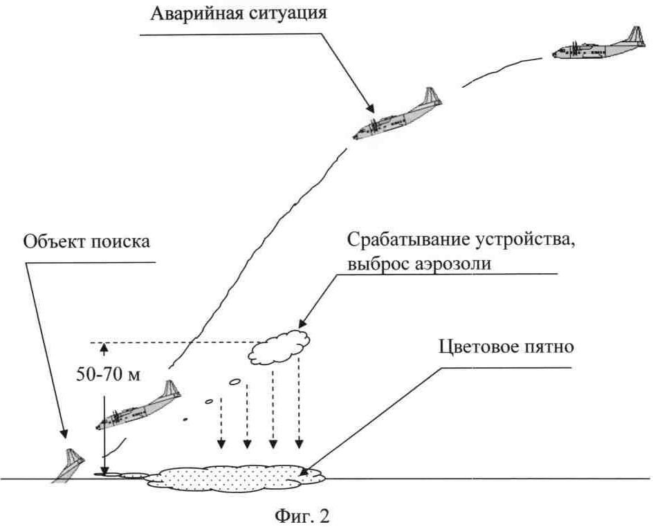 Изобретение относится к средствам и способам обозначения места нахождения (падения, вынужденной посадки) потерпевшего бедствие воздушного судна, его экипажа и пассажиров, нуждающихся в экстренной помощи, обеспечивающим сокращение сроков их поиска и своевременное оказание необходимой помощи. Преимущественной областью применения изобретения является авиастроение (оснащение воздушных судов устройствами аэрозольного маркирования места авиационного происшествия) и сфера авиационного поиска и спасания (поиска потерпевших бедствие воздушных судов, их экипажей и пассажиров при применении предлагаемого устройства и способа). Возможной областью применения изобретения также может быть приборостроение в части создания средств аварийной сигнализации для морских судов и отдельных лиц, занимающихся экстремальными видами спорта: альпинизмом, сноубордизмом, горнолыжным спортом, горным туризмом, рафтингом, парапланеризмом, воздухоплаванием и др. Известны средство и способ оповещения о чрезвычайной ситуации (1), отличающиеся тем, что данное изобретение основано на установке на месте аварии объекта аварийного знака на базе привязного шара-зонда, оснащенного набором сигнальных сообщений в виде графических символов или звуковым устройством, или радиоустройством. Недостатками данного средства и способа являются ограниченные их возможности по сферам применения, в частности, они малопригодны для обозначения места падения потерпевшего бедствие воздушного судна, которое часто во время этого события полностью разрушается, или на месте происшествия возникает пожар. Для других аварийных ситуаций обозначение места происшествия набором сигнальных сообщений в виде графических символов, размещаемых на привязном шаре-зонде, или подачей звуковых сигналов с него может не дать существенного эффекта в силу малой дальности его визуального обнаружения (из-за незначительных размеров) и фиксирования звуковых сигналов. Размещение на шаре-зонде радиопередающего устройства мало влияет на дальность его обнаружения поисковыми силами и средствами, но существенно усложняет всю конструкцию по сравнению с известными аварийными радиомаяками (2). Известны различные конструкции аварийных радиомаяков (2), предназначенные для обозначения места авиационного происшествия и отличающиеся тем, что их применение основано на распространении в пространстве радиоволн на строго определенных, фиксируемых и прослушиваемых постоянно или эпизодически (при проведении поисково-спасательных работ) аварийных радиочастотах. Применение таких средств в сфере авиационного поиска и спасания, в практике работы других поисково- и аварийно-спасательных служб довольно эффективно, но недостаточно для всестороннего решения проблемы поиска людей, оказавшихся в аварийной ситуации и нуждающихся в экстренной помощи. Аварийные радиомаяки и другие подобные радиосредства имеют ограниченное время работы, могут оказаться вне зон приема сигналов поисковыми средствами, а потому не исключают необходимости применения для обозначения места происшествия средств или устройств, основанных на других физических принципах. Известны устройство и способ аварийного оповещения (3), отличающиеся тем, что они основаны на применении радиосредств (радиопередающих и радиоприемных ус
