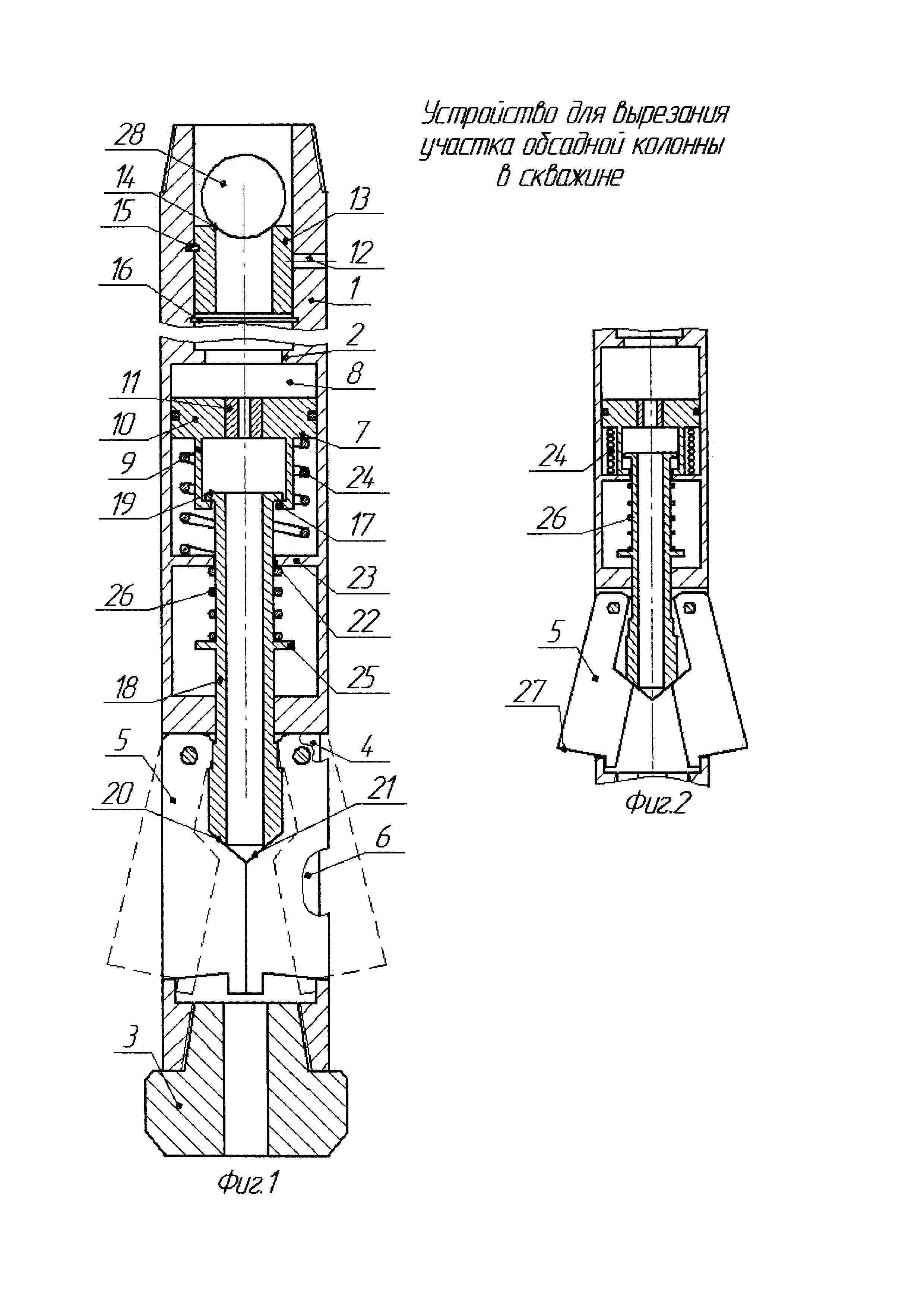 Изобретение относится к области нефтяной и горной промышленности и может быть использовано для вырезания участка обсадной колонны в скважине. Устройство содержит корпус с ограничителем в виде кольцевого выступа, центратором и пазами, шарнирно закрепленные в пазах выдвижные резцы. Радиальные каналы выполнены в корпусе в плоскости выдвижения резцов и направлены в зону вырезания. Гидравлический привод размещен в кольцевой полости корпуса над резцами и выполнен в виде полого поршня с буртом наверху и оснащен штуцером. В корпусе над ограничителем выполнены три радиальных канала, герметично перекрытых полой втулкой, выполненной с седлом под шар и с возможностью осевого перемещения вниз под действием избыточного гидравлического давления в полости устройства и фиксации в корпусе. На нижнем конце внутренней стенки полого поршня имеется кольцевой выступ. В полости поршня с возможностью осевого перемещения и фиксации от перемещения вниз находится верхний конец полого цилиндра. Внутренний диаметр цилиндра больше внутреннего диаметра штуцера. Нижний конец цилиндра выполнен с коническим торцом, взаимодействующим с резцами. Цилиндр проходит через отверстие кольцевой перегородки на внутренней боковой стенке кольцевой полости корпуса. Над перегородкой находится пружина сжатия, удерживающая поршень с цилиндром в крайнем верхнем положении. Под перегородкой на наружной боковой стенке цилиндра имеется кольцевой выступ. Цилиндр подпружинен пружиной сжатия. Пружина сжатия, расположенная над перегородкой корпуса, имеет упругую силу, которая больше упругой силы пружины сжатия, расположенной под перегородкой. Расширяются технологические возможности устройства за счет его применения для резки труб на разных глубинах. 2 ил.