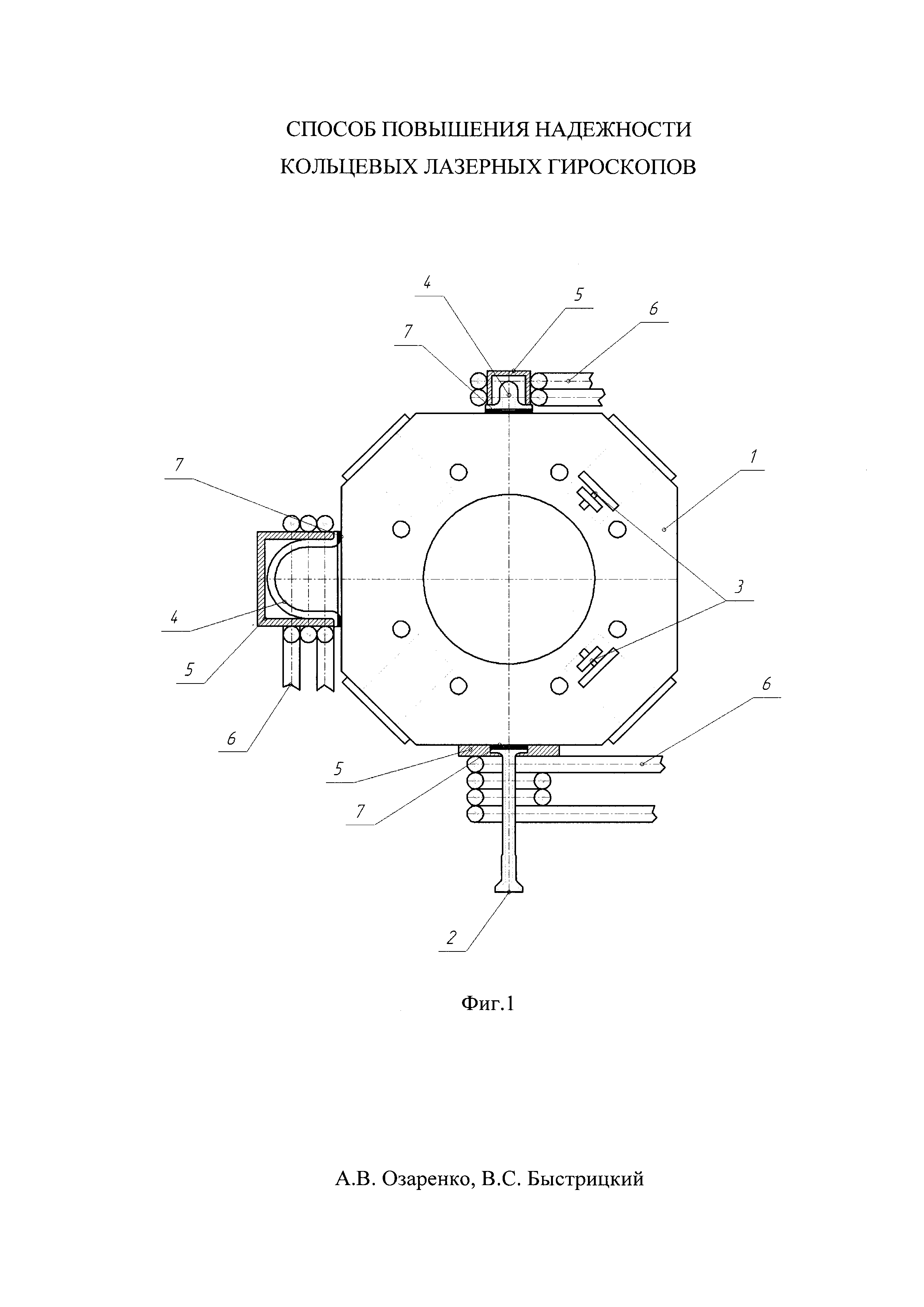 Предлагаемое изобретение относится к области лазерной техники, а именно к кольцевым моноблочным лазерным гироскопам, предназначенным для измерения угловой скорости вращения. Известно уплотнение стекла или керамики с металлом, позволяющее создавать герметичное соединение между металлической поверхностью и поверхностью стекла или стеклокерамики [Патент США №4432660, кл. F19C 9/00, опубликованный 21.02.1984 г.]. Согласно изобретению герметичность данного соединения сохраняется при многократном циклическом изменении температуры в пределах от -50°C до +100°C. Для достижения указанного результата поверхность соединяемого стекла или стеклокерамики должна быть максимально чистой. Для получения сверхчистой поверхности стекла или стеклокерамики она бомбардируется плазмой, или ионами в вакууме, или ультрафиолетовым светом. Когда основным металлом является алюминий, поверхность алюминия вначале полируют, чтобы она соответствовала по качеству поверхности стекла или стеклокерамики. Затем применяется азотная кислота для травления алюминия, а ее избыток смывается, преимущественно в дистиллированной воде. Далее металл отжигают, и поверхность металла формуют, прижимая его к гладкой полированной поверхности. Для формовки предпочтительно использование стекла или стеклокерамической поверхности, поскольку алюминий не прилипает к данной поверхности и ее плоскостность сохраняется после повторных операций. Затем наносят золото на поверхность алюминия, золото может быть нанесено гальванически, но обнаружено, что предпочтительным является напыление или нанесение расплавленного золота на формованную поверхность алюминия. Чистота золота должна составлять порядка 99,5%. Типовая толщина золота после напыления, нанесения расплавленного золота или гальванического покрытия составляет менее 100 микродюймов. Заготовку индия размещают над поверхностью золота. Чистота индия, как правило, составляет 99,9%. Затем индий и золото нагревают, предпочтителен нагрев в вакууме, выше температуры плавления индия (155°C) примерно до 175°C, до тех пор, пока индий не сплавится с золотом на поверхности. Поверхность индия далее максимально очищается, например, в плазме или ионной бомбардировкой, или ультрафиолетовым излучением. После очистки индий становится очень липким, и он имеет хорошую адгезию с любой контактирующей поверхностью. Сверхчистую поверхность индия затем прижимают к сверхчистой поверхности стекла или стеклокерамики с образованием герметичного вакуумного соединения. Когда металл медь, медь не подвергают травлению азотной кислотой, а золото наносят гальванически. Поверхность не формуют, но подвергают шлифовке с помощью небольших (обычно 1200 мкм) частиц, перед тем как покрывать медь золотом. Недостатком данного изобретения является низкая надежность, вследствие низкой герметичности соединения стекла или стеклокерамики с золотом, медью через индиевое уплотнение, при термоциклических воздействиях. С повышением температуры свыше 100°C между индием и золотом или медью начинают интенсивно формироваться интерметаллические соединения этих металлов. При многократном циклическом воздействии температуры от -50°C до +100°C хрупкие интерметаллиды индия разрушаются, вследствие этого нарушается герметичность индиевого соединения. Прототипом предлагаемого и