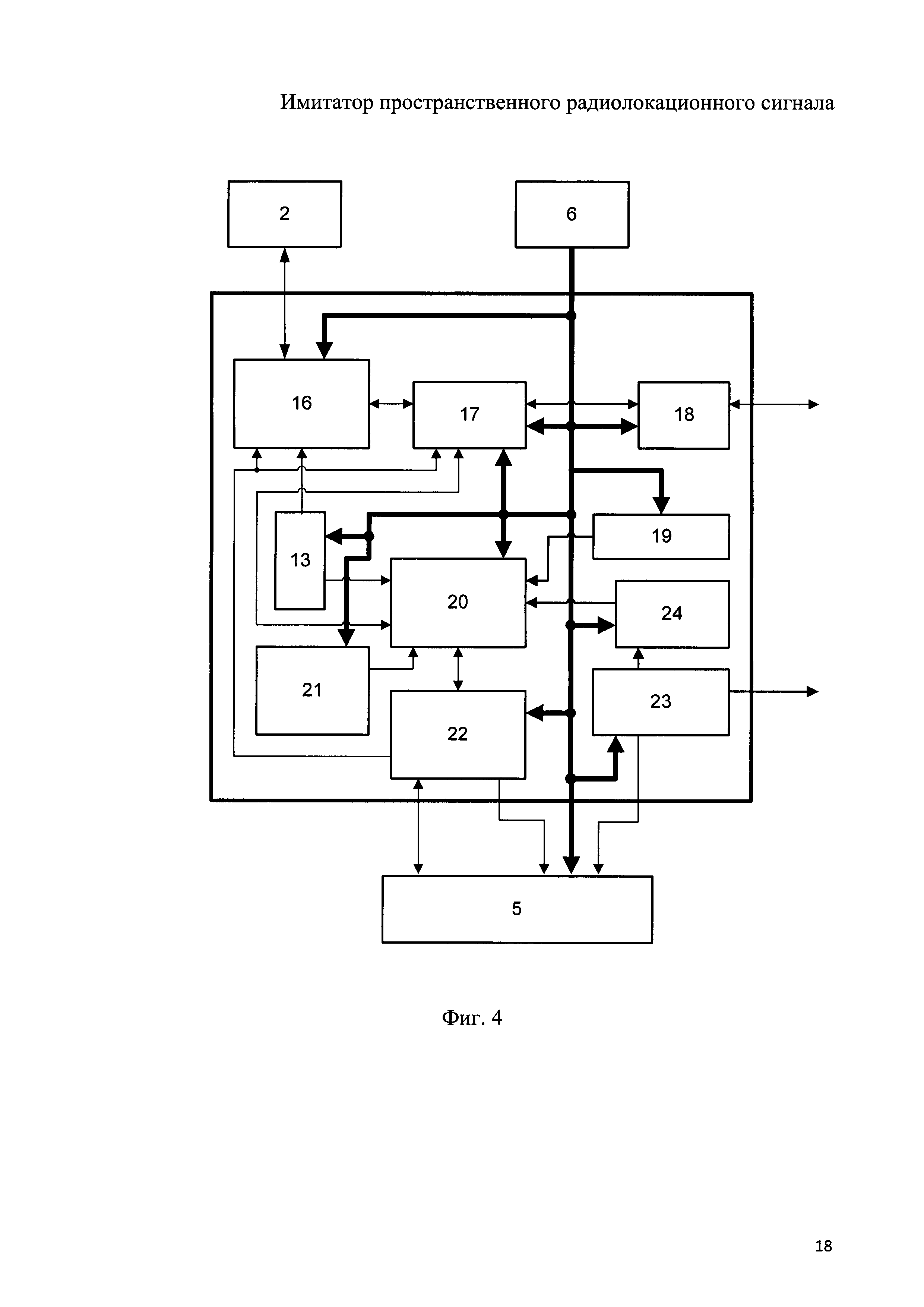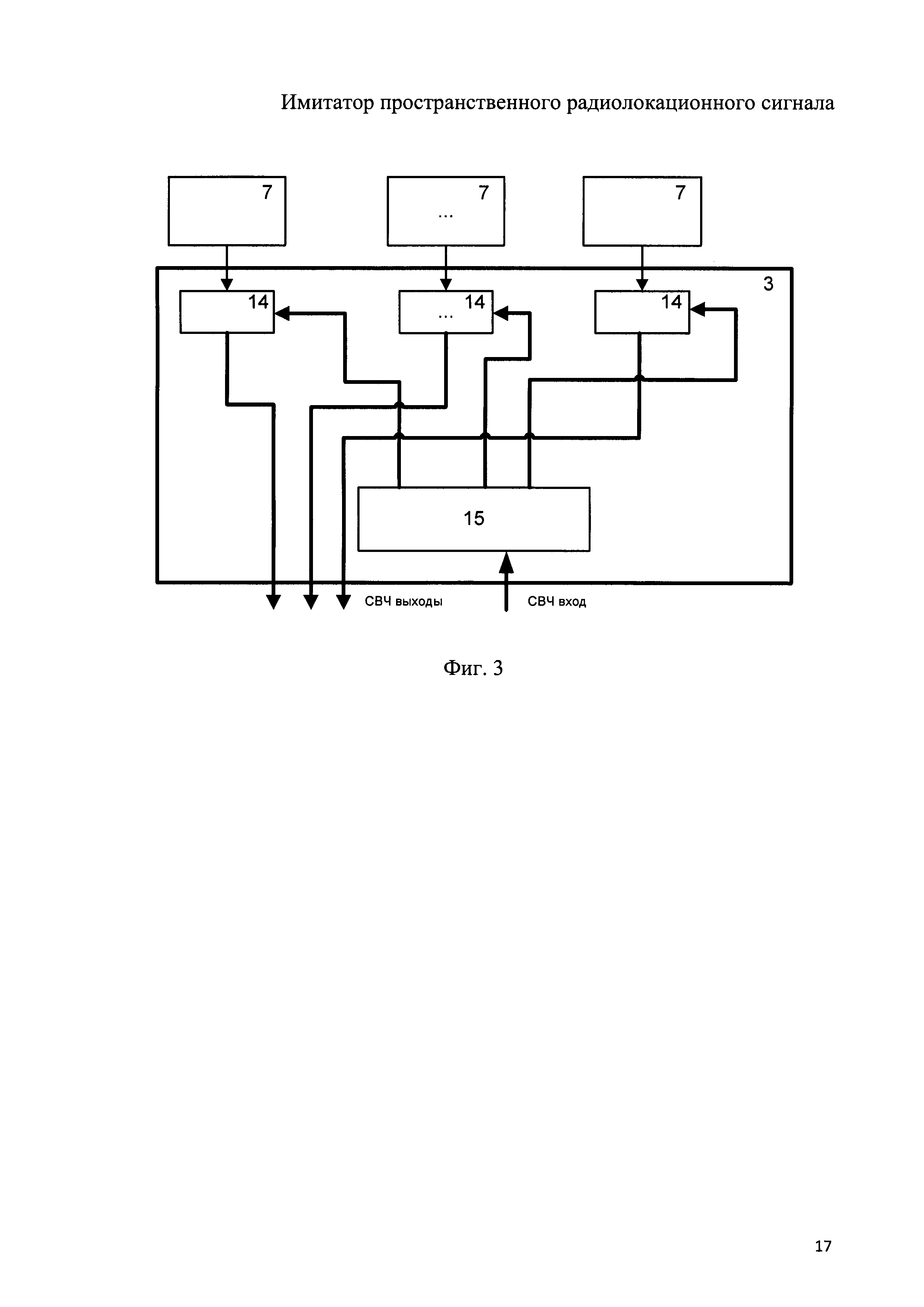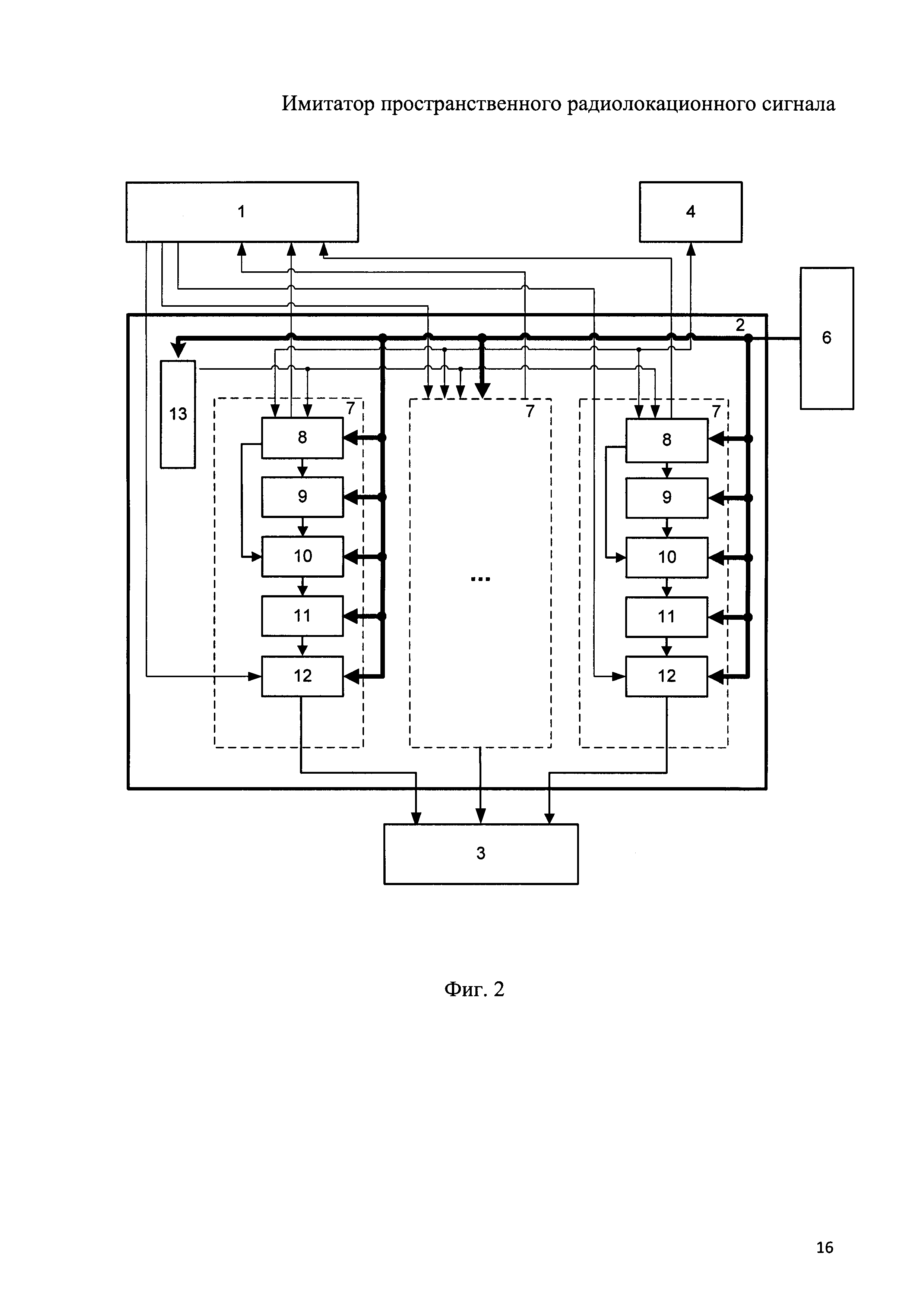 Предлагаемое техническое решение относится к области радиолокации и предназначено для интеграции в состав радиотехнических позиций, обеспечивающих отработку авиационных средств поражения с радиолокационными методами пеленгации целей, и позволяет имитировать радиолокационные отражения (более двух независимых точек, разнесенных в пространстве) от пространственно-распределенных объектов, к которым можно отнести: - групповую цель; - одиночную большеразмерную цель на этапе подлета; - облака помех в виде дипольных отражателей; - подстилающие поверхности (в т.ч. антиподы). Известен радиолокационный имитатор цели (Патент РФ №2267798), который содержит определенным образом соединенные между собой модуль сверхвысокой частоты (СВЧ), состоящий из последовательно соединенных устройства автоматической регулировки мощности и импульсного модулятора, последовательно соединенных переключателя уровня мощности и цифрового аттенюатора, вход устройства автоматической регулировки мощности является входом СВЧ, а также линию связи, рупорную антенну, группу синтезаторов доплеровских частот, группу умножающих цифроаналоговых преобразователей (ЦАП), группу ключей, первое перепрограммируемое постоянное запоминающее устройство (ППЗУ), второе ППЗУ, интерфейс мультиплексной шины и мультиплексную шину управления. Известен цифровой имитатор радиолокационной цели (Патент РФ №2412449), который содержит антенну, последовательно соединенные первый аттенюатор, первый смеситель, схему цифровой задержки сигнала, второй аттенюатор, второй смеситель, третий вентиль, последовательно соединенные синтезатор частоты, делитель мощности, в имитаторе реализуется автоматическое согласование уровня сигнала, смещаемого на промежуточную частоту, с динамическим диапазоном схемы цифровой радиочастотной памяти, ввода фиксированного затухания задержанного на промежуточной частоте сигнала в соответствии с разницей расчетного затухания сигнала в имитаторе и уровня затухания, вводимого между приемной антенной имитатора и смесителем для согласования сигнала с динамическим диапазоном схемы цифровой задержки сигнала. Известен радиолокационный имитатор цели (Патент РФ №2358279), который содержит определенным образом соединенные между собой модуль сверхвысокой частоты (СВЧ), линию связи, рупорную антенну, группу синтезаторов доплеровских частот, группу умножающих цифроаналоговых преобразователей (ЦАП), группу ключей, первое перепрограммируемое постоянное запоминающее устройство (ППЗУ), второе ППЗУ, интерфейс мультиплексной шины и мультиплексную шину управления, причем модуль СВЧ состоит из устройства автоматической регулировки мощности, импульсного модулятора, группы амплитудных модуляторов, СВЧ сумматора, переключателя уровня мощности и цифрового аттенюатора, определенным образом соединенных между собой и соответствующими элементами заявленного имитатора. К недостаткам указанных аналогов относятся: - отсутствие возможности имитации радиолокационных отражений от объектов, разнесенных в пространстве, и как следствие, отсутствие возможности формирования сигналов с различной пространственно-распределенной структурой сигнала; - управление только при помощи электронно-вычислительной машины (ЭВМ), и, как следствие, отсутствие возможности установ