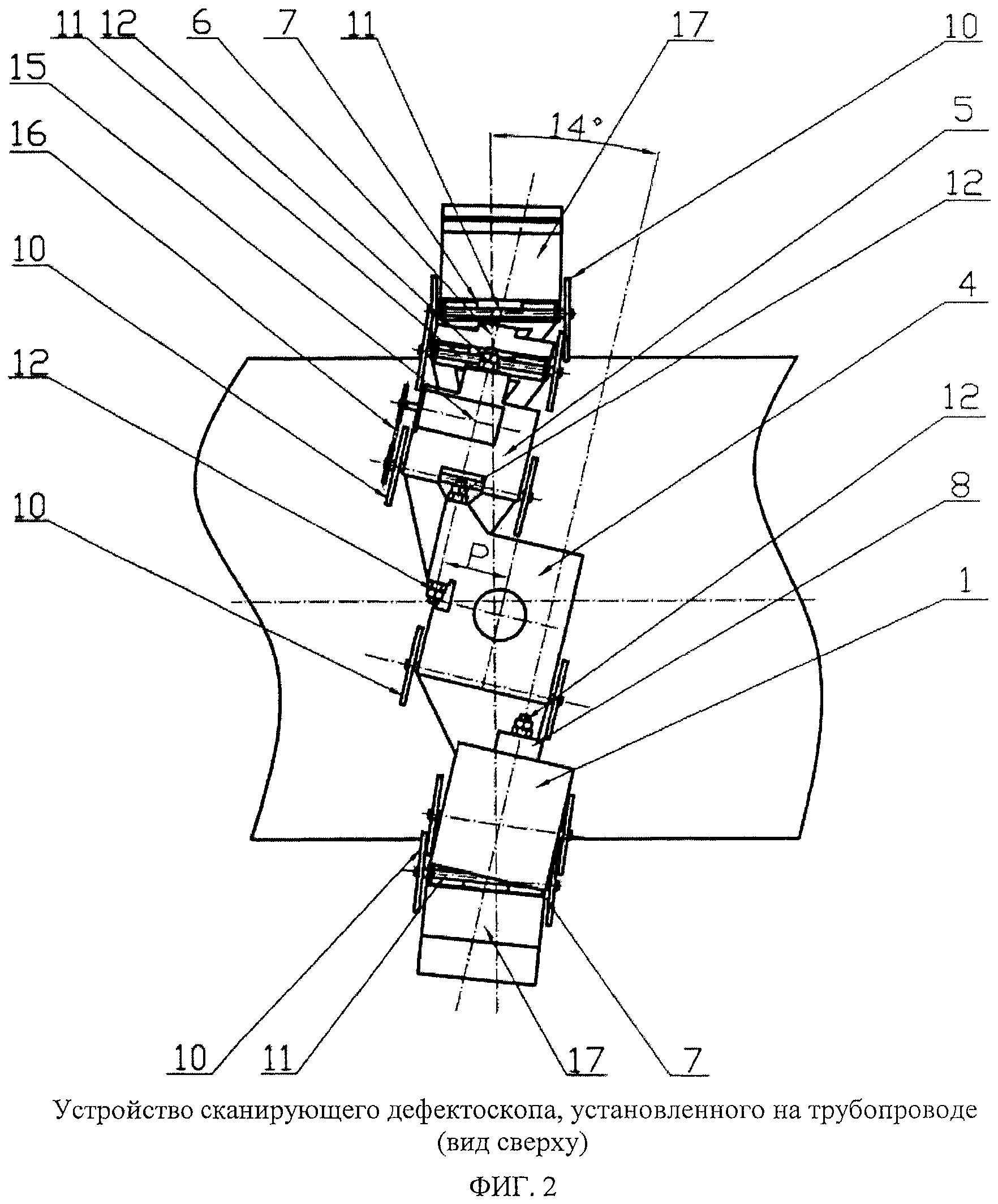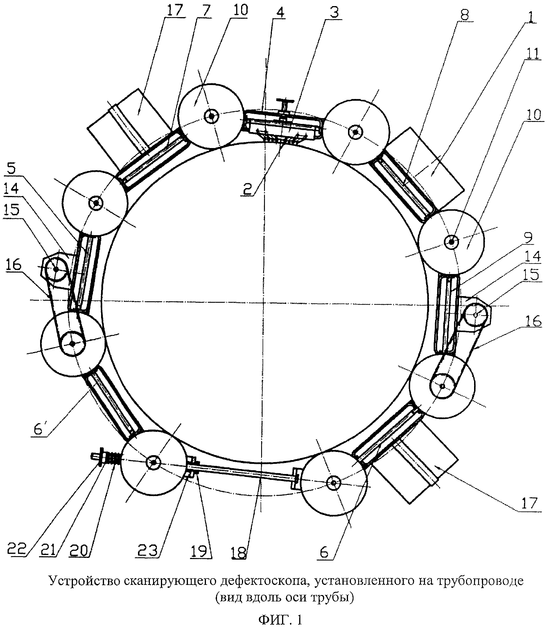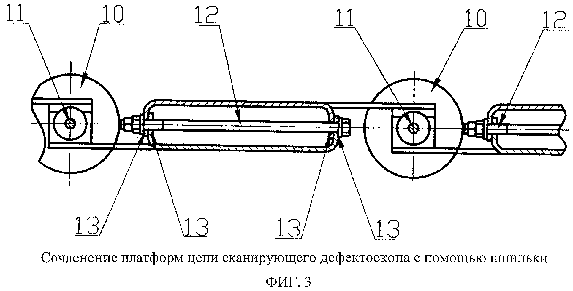 Изобретение относится к неразрушающему контролю качества неповоротных цилиндрических деталей, в частности трубопроводов. Известно устройство для сплошного сканирующего контроля качества неповоротных изделий цилиндрической формы, содержащее блок контрольно-измерительной аппаратуры, дистанционного управления и обмена данными и механизм перемещения по винтовой траектории, обеспечивающий возможность изменения направления движения (см. патент РФ на полезную модель №55141, опубл. 27.06.2006). Недостатками известного устройства является низкая скорость сканирования трубопровода, повышенные материалоемкость конструкции устройства и сложность механизма перемещения, влекущие за собой снижение надежности и увеличение трудоемкости проведения дефектоскопии. Техническим результатом предлагаемого технического решения является упрощение конструкции устройства, увеличение скорости сканирования при сохранении надежности выявления дефектов и точности определения их координат в теле неповоротного объекта контроля цилиндрической формы, например трубопровода. Технический результат достигается в результате того, что в известном устройстве для сплошного сканирующего контроля качества неповоротных изделий цилиндрической формы, содержащем блок контрольно-измерительной аппаратуры, дистанционного управления и обмена данными и механизм перемещения по винтовой траектории, обеспечивающий возможность изменения направления движения, согласно заявленному изобретению механизм перемещения выполнен в виде цепи с опорными роликами (колесами), в которой одна из пар смежных звеньев разнесена вдоль оси изделия цилиндрической формы, например трубы, и соединена посредством платформы с элементами крепления, расположенными на расстоянии, равном шагу винтовой траектории сканирования. Для обеспечения высокой стабильности величины шага сканирования и исключения заклинивания устройства звенья цепи могут быть выполнены в виде платформ, которые соединены между собой шпильками, с возможностью вращения относительно оси последних. С целью обеспечения возможности диагностирования широкого типоразмерного ряда (широкого диапазона диаметров) неповоротных объектов контроля цилиндрической формы цепной механизм перемещения может содержать различное количество платформ-звеньев. Перенастройка механизма перемещения с одного типоразмера объекта контроля на другой осуществляется изменением числа платформ-звеньев, установленных в цепи, для чего с помощью резьбового участка соединительных шпилек и гаек крепится или снимается дополнительное звено-платформа. Для обеспечения высокой стабильности шага сканирования соединительные шпильки (оси) могут быть установлены в соединяемых платформах-звеньях с помощью подшипников. Лучший результат достигается при фиксации каждой соединительной шпильки с помощью четырех подшипников, по два на каждое из соседних соединяемых звеньев. Платформы цепи механизма перемещения могут быть оснащены всего лишь одной парой опорных роликов или колес каждая, расположенными на осях, причем на двух звеньях-платформах в кронштейнах установлены двигатели, вращение от которых передается на оси опорных роликов при помощи цепной передачи. Блок контрольно-измерительной аппаратуры, дистанционного управления и обм
