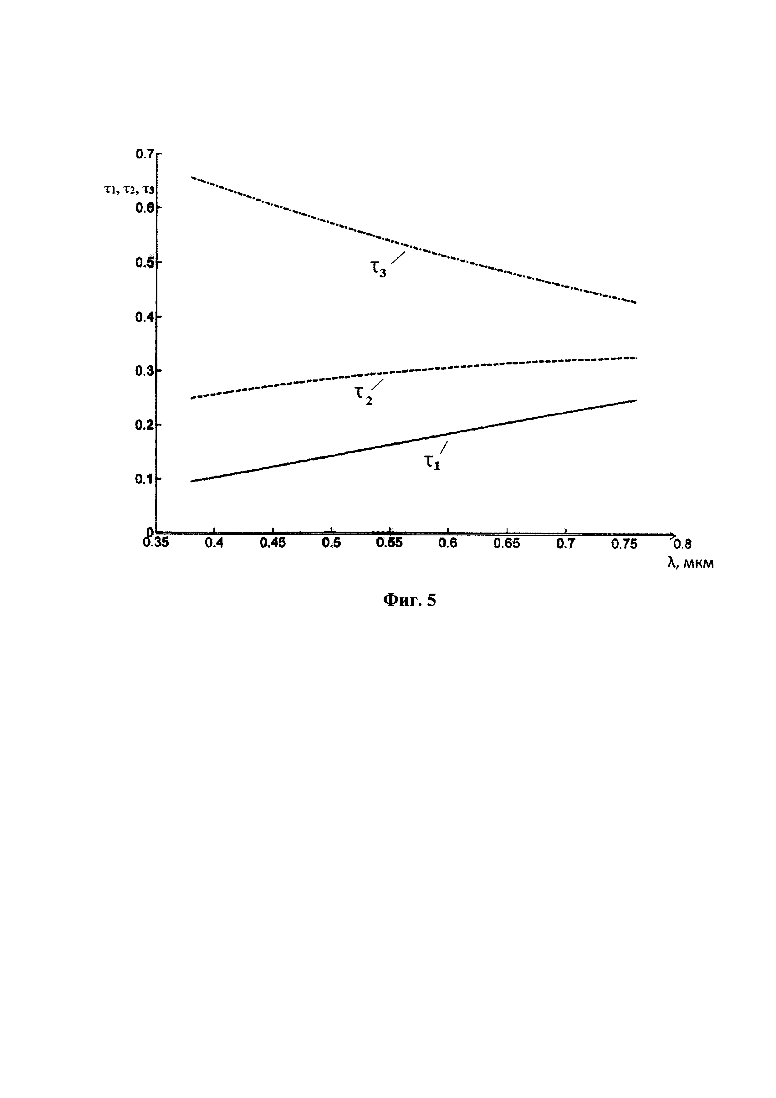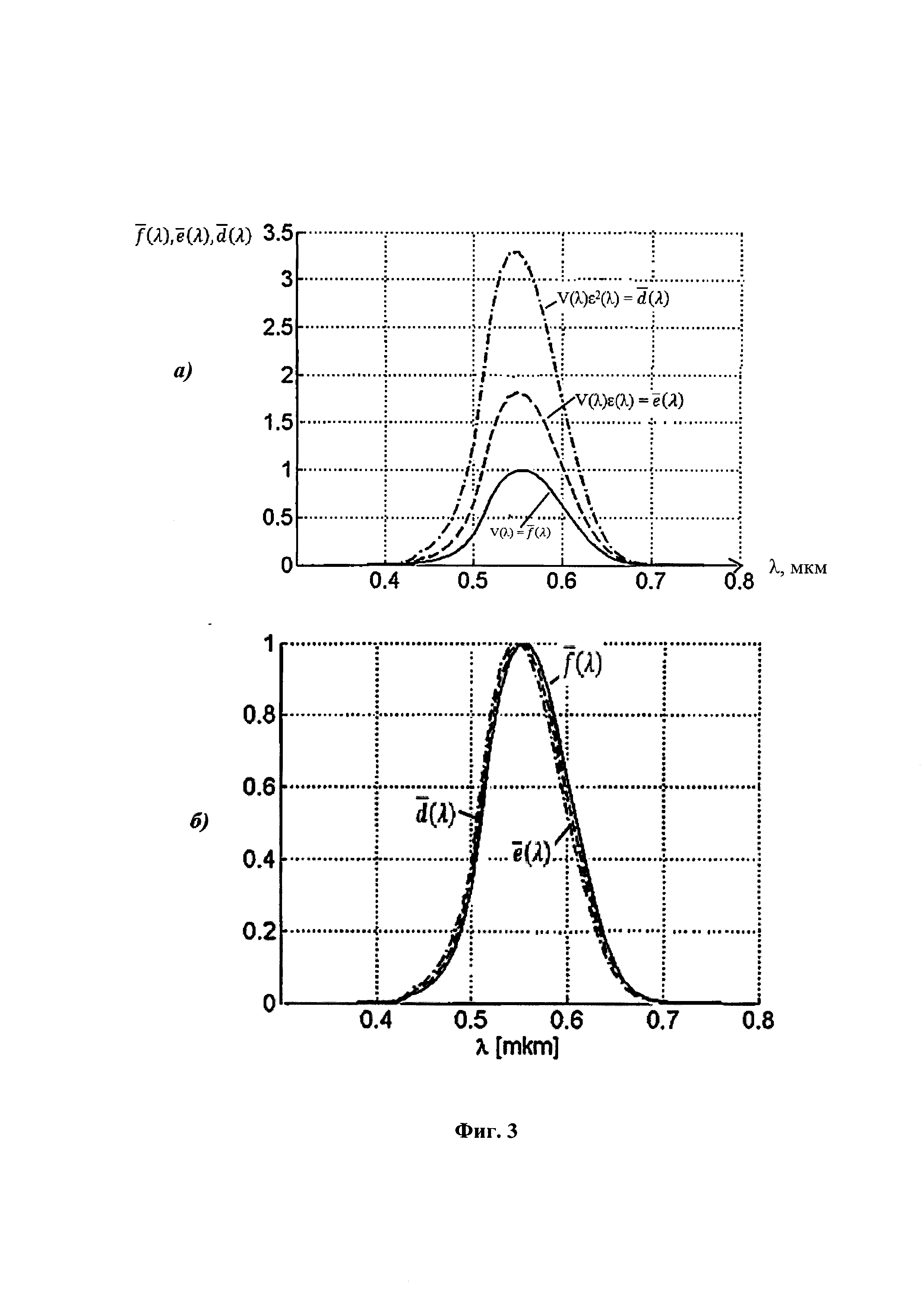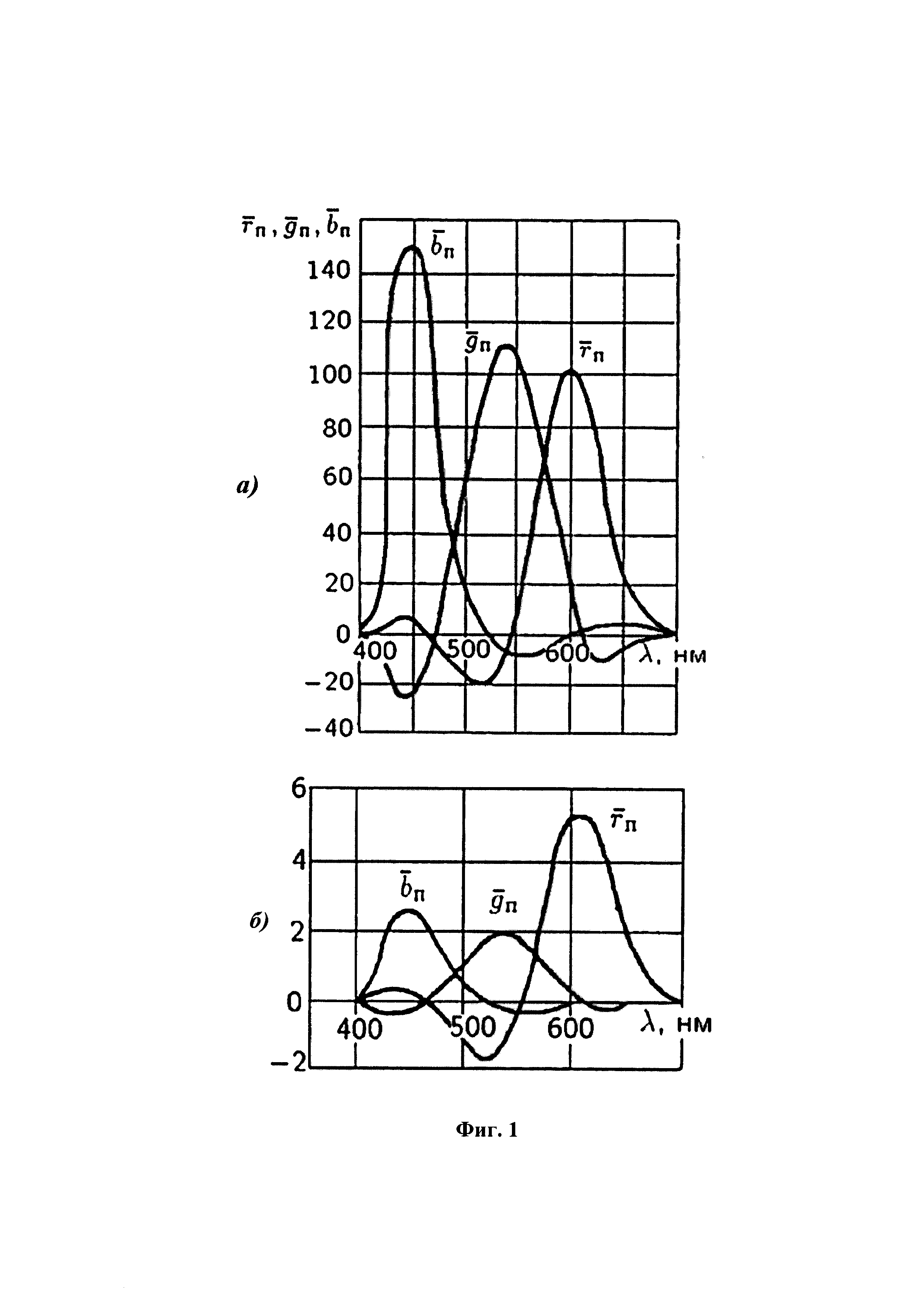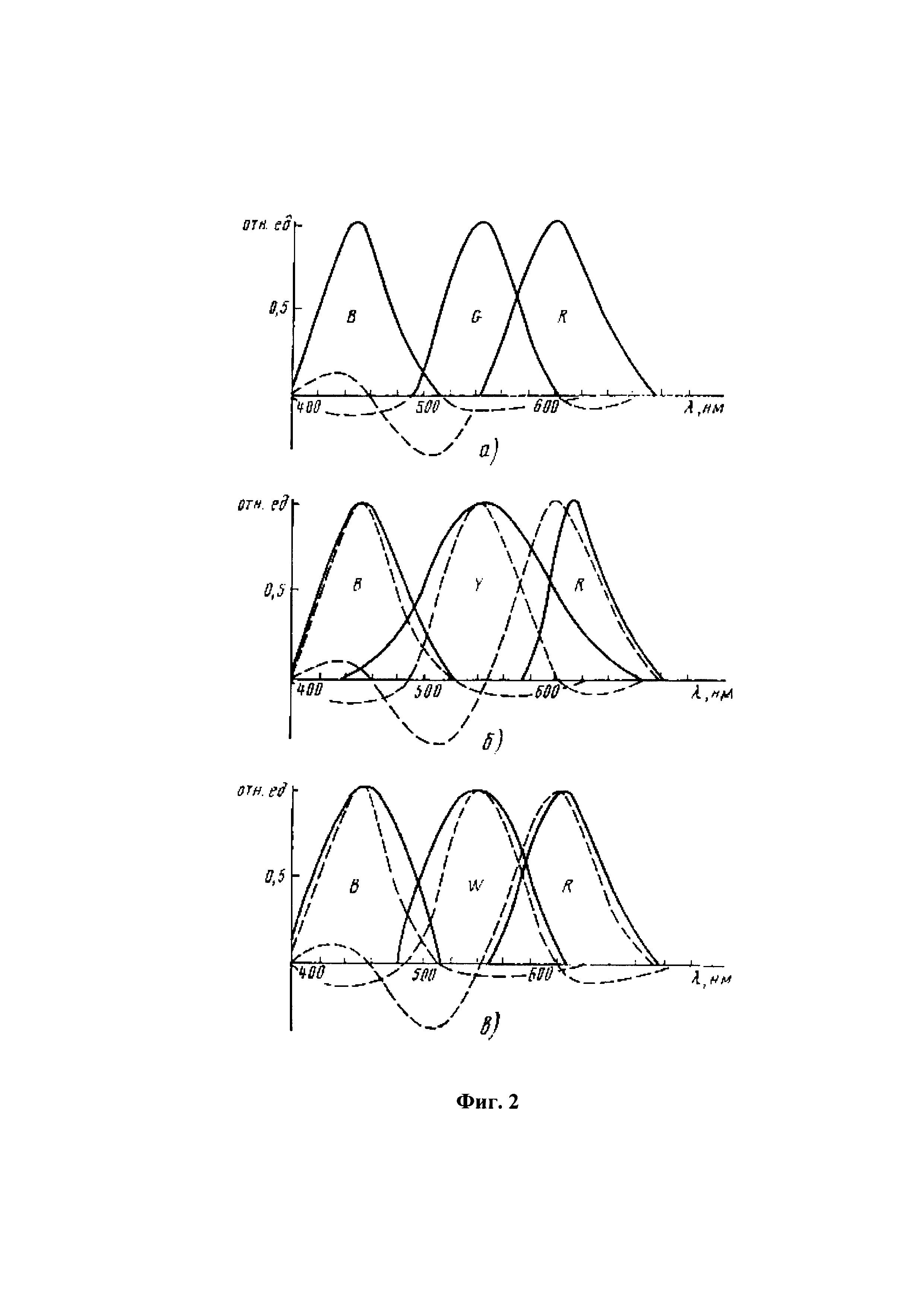 колориметрической системы приемника. Как видно из фиг. 1 эти функции имеют участки отрицательных значений ординат и вторичных максимумов. Практическая реализация трехсигнальной телевизионной камеры с такими характеристиками спектральной чувствительности невозможна. Поэтому на практике используют спектрально несогласованные характеристики чувствительности камеры. Например, в трехсигнальных камерах RGB, RYB и RWB используют спектральные характеристики, представленные на фиг. 2 [Телевизионные передающие камеры / В.А. Петропавловский и др. - М.: Радио и связь, 1988. - 304 с. (см. с. 41)]. Эти спектральные характеристики отличаются от удельных координат колориметрической системы приемника отсутствием отрицательных участков и вторичных максимумов и, выбраны из условий компромисса между ухудшением качества передачи цвета и увеличением чувствительности при условии дополнительной матричной цветокоррекции. Принцип цветокоррекции основан на том, что побочные отрицательные и положительные ветви функций удельных координат