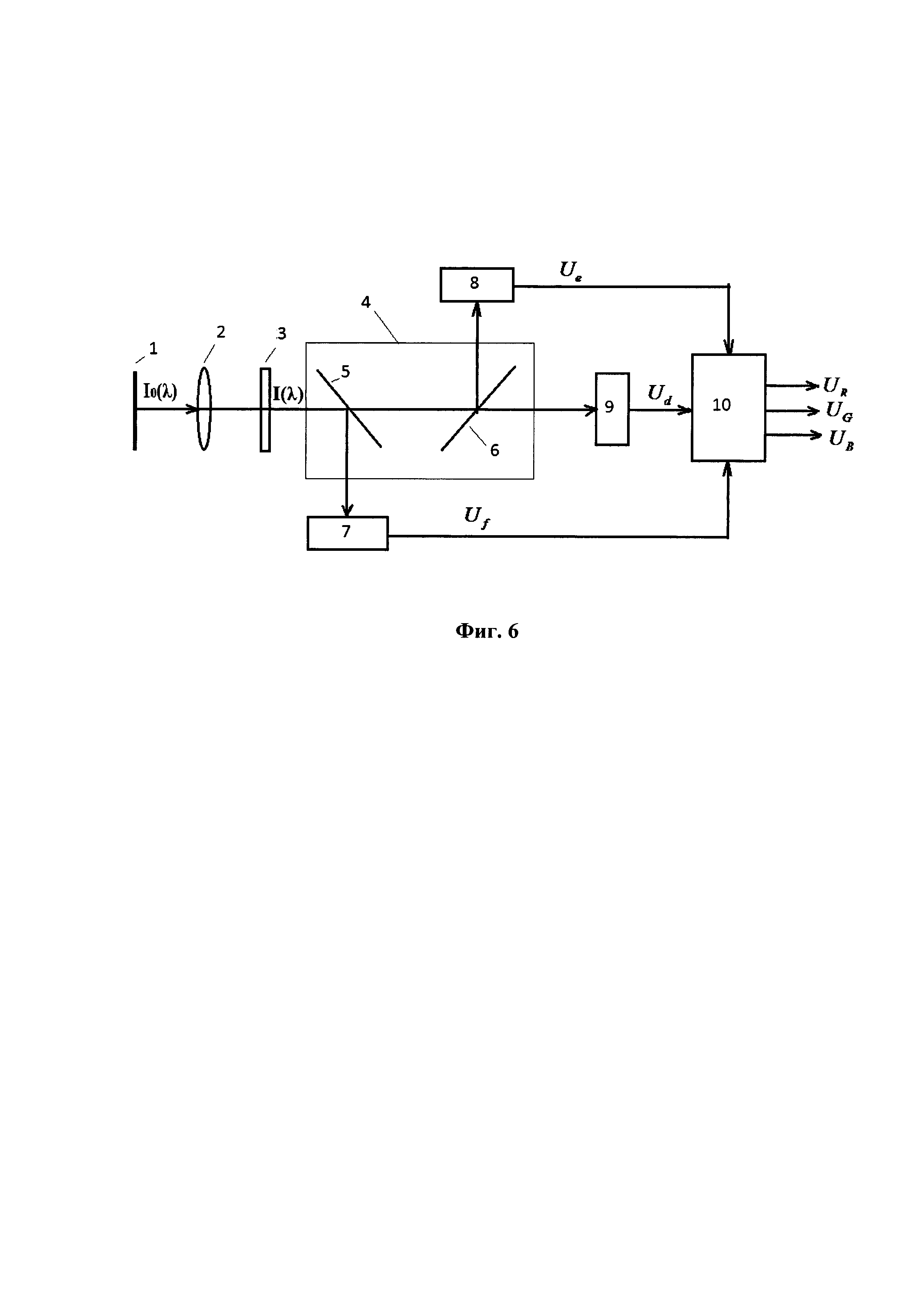 поступают на фоточувствительные поверхности преобразователей «свет-сигнал» 7, 8, 9 с одинаковыми спектральными характеристиками V(λ), которые преобразуют каждый элемент передаваемой сцены в видеосигналы UF, UE, UD.