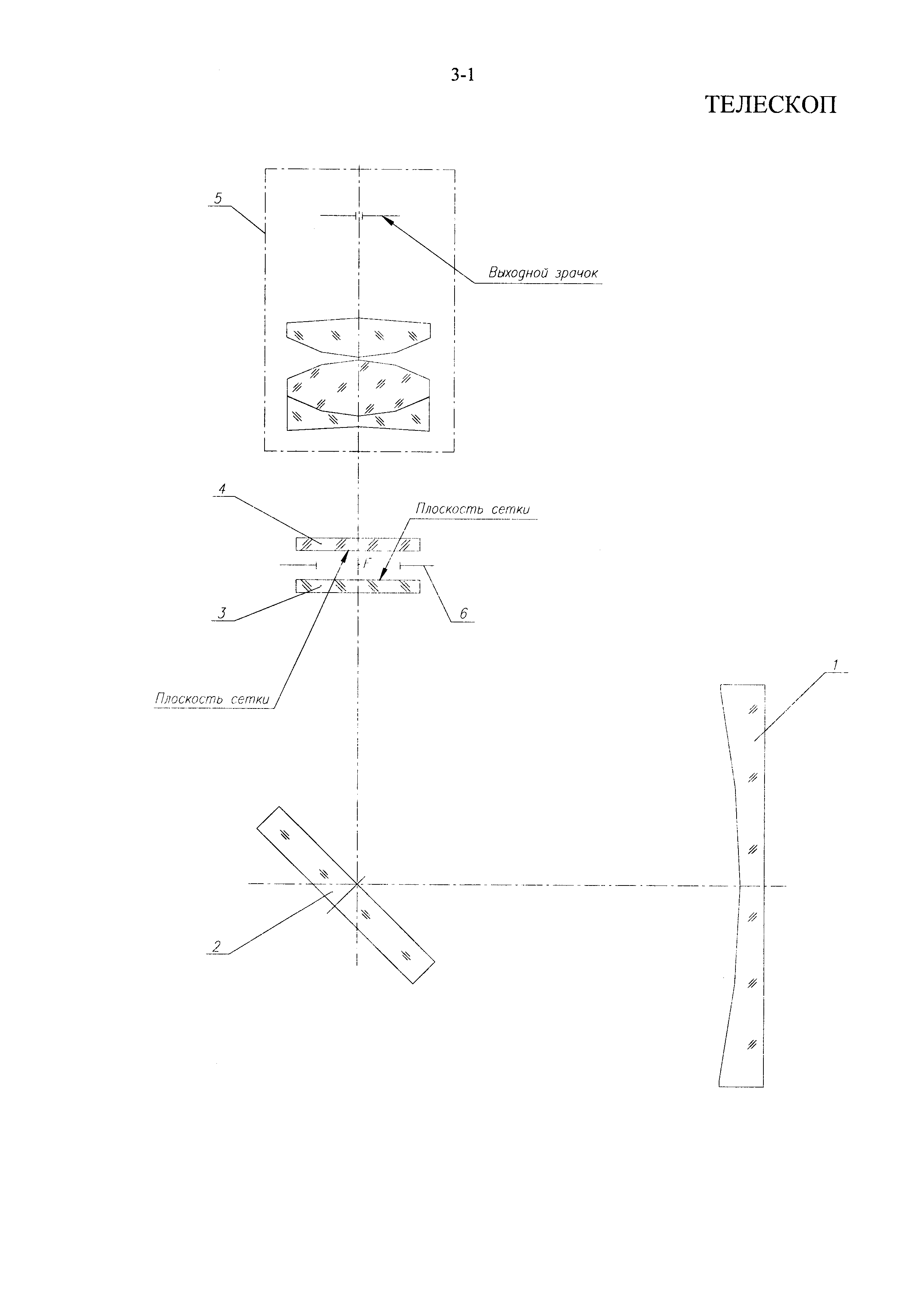 Изобретение относится к области контрольно-измерительной техники, а именно к телескопическим оптическим системам, используемым преимущественно для измерения параллельности визирных осей двух или более контролируемых оптических систем в видимом диапазоне спектра. Известна зрительная труба, описанная в авторском свидетельстве СССР №1674046, МПК G02B 23/00, опубликованном 30.08.1991 г. Зрительная труба состоит из двухлинзового склеенного объектива, двухлинзового окуляра и перекрестия, нанесенного па тонкую стеклянную плоскопараллельную пластину, закрепленную посредством котировочных винтов в передней фокальной плоскости окуляра. Окуляр установлен с возможностью перемещения вдоль оптической оси прибора. Однако данная зрительная труба имеет сложную конструкцию объектива, который состоит из двух линз и сетки, закрепленной без возможности ее перемещения в перпендикулярном к оптической оси направлении. Кроме того, окуляр состоит из двух положительных линз и, следовательно, он имеет большую погрешность в связи с отсутствием ахроматизации. Наиболее близким аналогом к предлагаемому техническому решению является телескоп-рефлектор, описанный в авторском свидетельстве СССР №1764019, МПК G02B 23/00, опубликованном 23.09.1992 г. Телескоп-рефлектор состоит из сферического вогнутого зеркала и окуляра. Кроме того, данный телескоп содержит дополнительный двухлинзовый объектив искателя, установленный на оси сферического вогнутого зеркала. Также в телескоп-рефлектор введено вспомогательное зеркало, установленное с возможностью поворота и фиксации при помощи механизма точного перемещения зеркала с фиксацией его в двух положениях, в одном из которых изображение в поле зрения окуляра создается объективом искателя, а в другом - сферическим вогнутым зеркалом. Наличие этих элементов существенно усложняет конструкцию и, кроме того, данный телескоп-рефлектор не позволяет проводить измерения параллельности визирных осей двух или более контролируемых оптических систем, поскольку в фокусе окуляра отсутствует сетка. Задачей предлагаемого изобретения является создание телескопа с повышенными эксплуатационными характеристиками. Технический результат - создание телескопа, позволяющего проводить измерения параллельности визирных осей двух или более контролируемых оптических систем при упрощенной конструкции. Это достигается тем, что в телескоп, состоящий из сферического вогнутого зеркала и окуляра, в отличие от известного, введены две плоскопараллельные пластины, установленные перпендикулярно оптической оси телескопа, на каждой из которых на одной из поверхностей нанесена сетка в виде одного штриха, причем штрихи взаимно перпендикулярны друг другу, плоскопараллельные пластины расположены между сферическим вогнутым зеркалом и окуляром с воздушным промежутком между ними, в котором расположен передний фокус окуляра так, что сетки со штрихами обращены друг к другу и каждая плоскопараллельная пластина со штрихом установлена с возможностью перемещения перпендикулярно нанесенному штриху в плоскостях, перпендикулярных оптической оси телескопа так, что при наблюдении в окуляр видно перекрестие, образованное штрихами двух перемещаемых сеток. Кроме того, плоскопараллельные пластины могут быть выполнены конструктивно одинаковыми. На черте