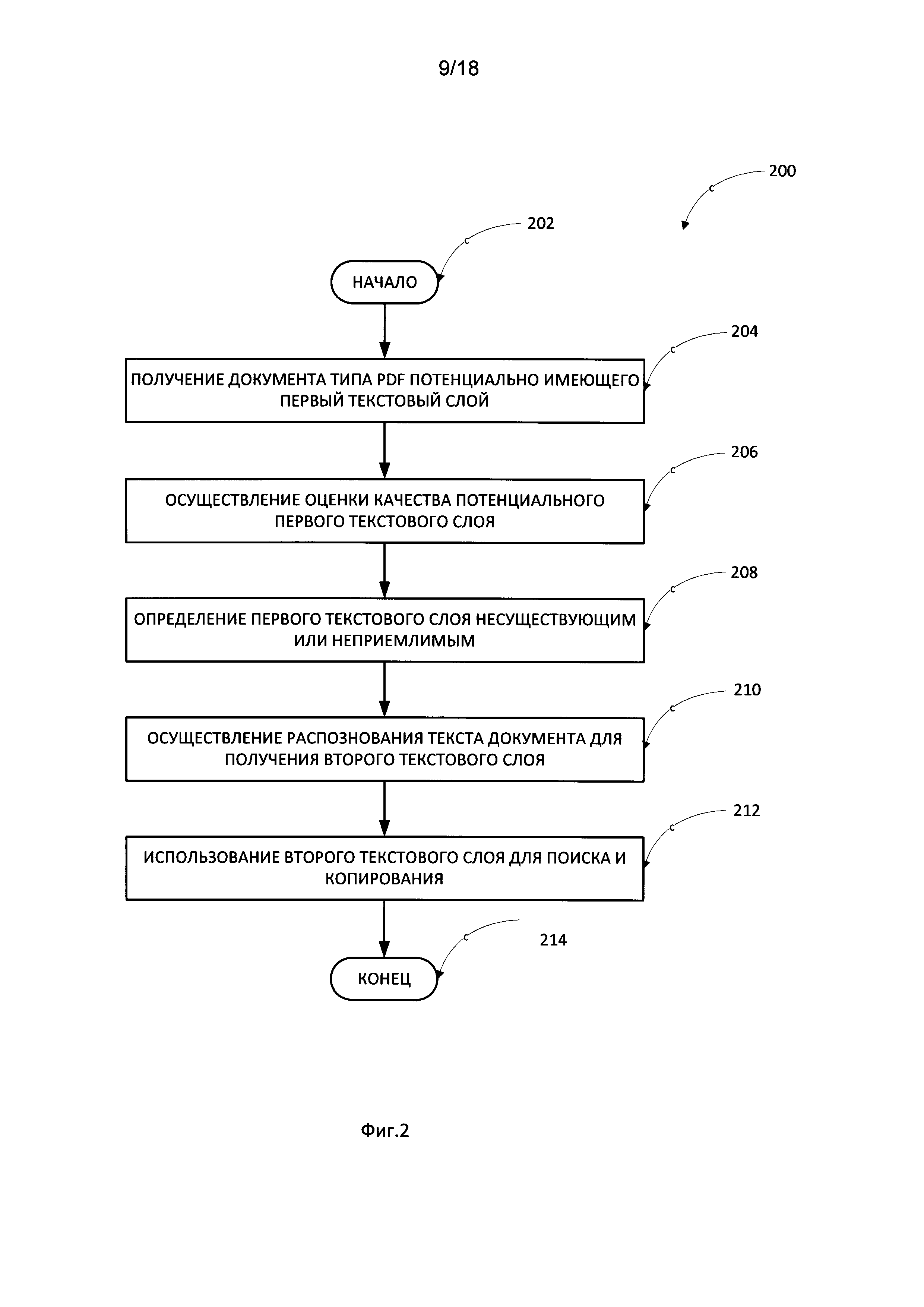 ПРЕДПОСЫЛКИ СОЗДАНИЯ ИЗОБРЕТЕНИЯ Область техники [0001] Настоящее изобретение относится к области обработки изображений, а именно к способу обработки изображений документов с помощью технологий Оптического распознавания символов (OCR) без потери данных. Уровень техники [0002] Системы Оптического распознавания символов (OCR) имеют широкое применение. Основным фактором в системе OCR является точность распознавания отдельных символов, поскольку большинство ошибок возникает на этапе распознавания символов. Для обеспечения высокой точности распознавания при OCR необходимо свести к минимуму количество ошибок при распознавании отдельных символов. [0003] В современном обществе все большую роль играет переносимость документа между платформами. Так, документы с изображениями можно преобразовать из конкретного формата файла в другой формат файла, например, когда документ экспортируется в формат файла с возможностью поиска для дальнейшего хранения, отправки по электронной почте или для совместного использования с контактами социальной сети с целью рецензирования и комментирования и т.д. Максимальная эффективность такой конвертации, как в OCR процессах, при минимальном числе ошибок и минимальной потере информации является существенным преимуществом. КРАТКОЕ ИЗЛОЖЕНИЕ СУЩНОСТИ ИЗОБРЕТЕНИЯ [0004] Распространение переносимости документов обуславливает постоянно растущую потребность в эффективном преобразовании документов, в особенности документов, содержащих изображения, из одного формата в другой при сохранении целостности документа и сведения к минимуму потерь связанной с документом информации в результате такой конвертации. Кроме того, существует постоянная потребность в улучшении возможностей поиска в таких документах и соответствующей информации для повышения производительности и иных улучшений, например, удобства использования. [0005] В частности, для удовлетворения этих потребностей предусматриваются различные варианты реализации конвертации без потерь в документы типа PDF. В одном таком варианте реализации, приводимом только в качестве примера, изначально имеется документ типа PDF, возможно имеющий первый текстовый слой. Оценивается качество первого текстового слоя. Выясняется, что первого текстового слоя не существует, либо этот слой неприемлемого качества. Для формирования второго текстового слоя распознается текст документа. Создается второй текстовый слой для поиска или копирования. [0006] В дополнение к изложенному выше варианту реализации приводятся и другие примеры систем и вариантов реализации раскрываемого изобретения в виде компьютерных программ, с указанием их преимуществ. [0007] Выше изложено краткое описание понятий в упрощенной форме. Оно будет более подробно раскрыто в детальном описании изобретения. Это описание сущности изобретения не предназначено для определения основных или существенных характеристик заявленного предмета или для определения объема заявленного предмета. Заявленный предмет не ограничивается вариантами осуществления, которые решают указанные выше проблемы полностью или частично. КРАТКОЕ ОПИСАНИЕ ЧЕРТЕЖЕЙ. [0008] Для облегчения понимания всех перечисленных выше преимуществ изобретения в подробном описании изобретения будут использоваться ссылки на конкретные варианты его