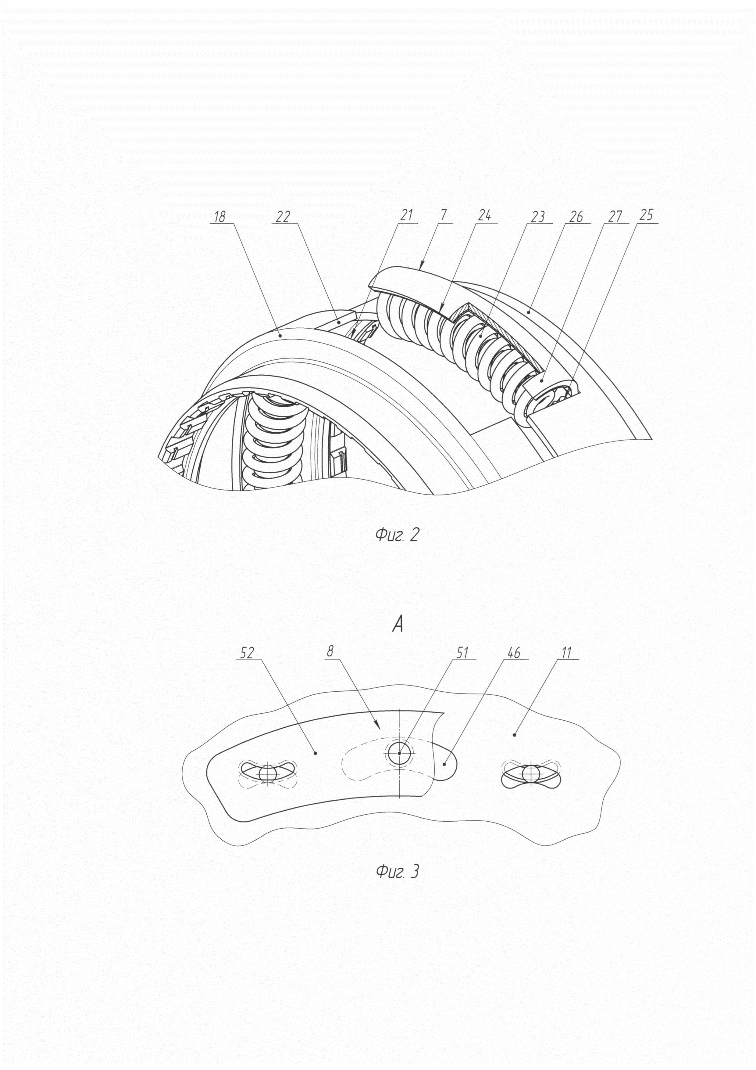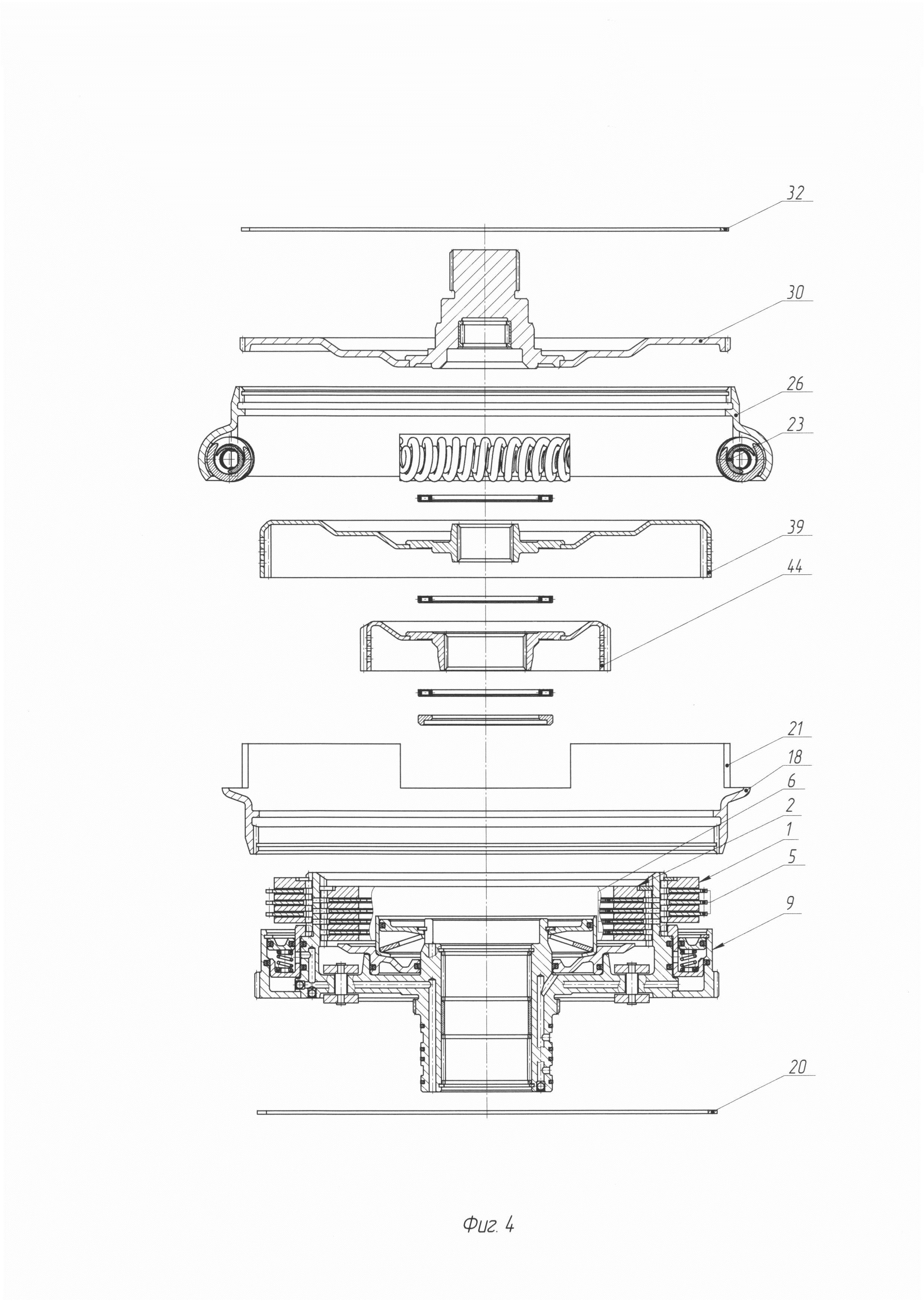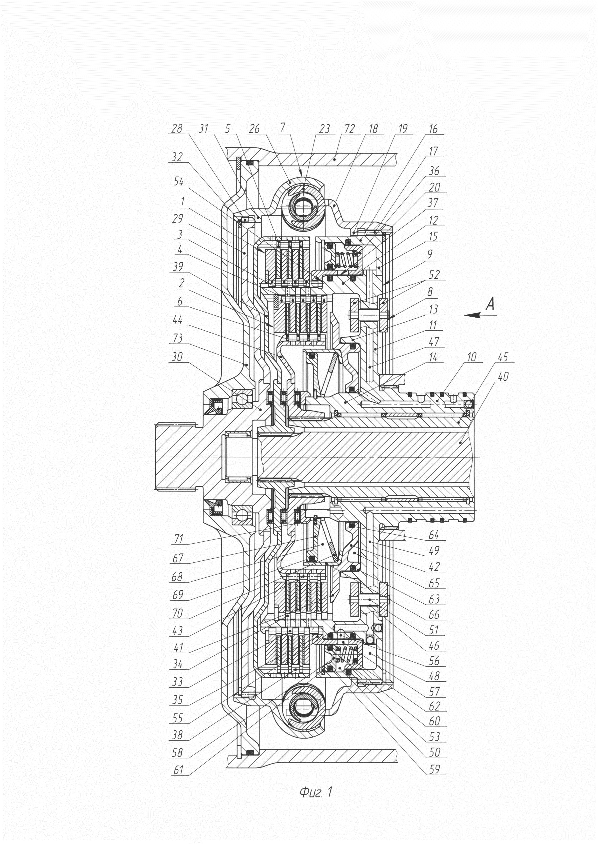 Техническое решение относится к транспортным средствам. Оно касается двойного сцепления с гасителем крутильных колебаний, используемым для снижения амплитуды крутильных колебаний. Известны различные конструкции двойных сцеплений с гасителем крутильных колебаний, которые показаны в патентах США №9080636 F16D 21/06, №7743898 F16D 25/10, №6401894 F16D 25/14 и в патенте №1174633 F16D 25/10, выданном Европейским патентным ведомством. В качестве прототипа принято двойное сцепление с гасителем крутильных колебаний, показанное в патенте США №9080636. Оно содержит единый сварной корпус, во внутренней полости которого размещены корпус гидроцилиндров с концентрично расположенными пакетами дисков разного размера, маятниковый антивибратор и элементы гасителя крутильных колебаний. В этом двойном сцеплении исключен прямой доступ к уплотнительным элементам поршней его гидроцилиндров, фрикционным дискам муфт для их замены при износе, к тарельчатым пружинам, маятниковым массам, а также к элементам гасителя крутильных колебаний в случае выхода их из строя, что усложняет сборку и разборку двойного сцепления, ухудшает его ремонтопригодность. При этом последовательное расположение в этом двойном сцеплении гидроцилиндров с поршнями за пакетами дисков, установка одного из гидроцилиндров с поршнем и возвратной пружиной за корпусом гидроцилиндров рядом с трубкой отвода рабочей жидкости из внутренней полости корпуса увеличивает осевой габаритный размер сцепления. Задача - обеспечение доступа к уплотнительным элементам поршней гидроцилиндров, к фрикционным дискам муфт для их замены при износе, к тарельчатым пружинам, шарнирам маятниковых масс, а также к элементам гасителя крутильных колебаний в случае выхода их из строя с обеспечением уменьшения осевого габаритного размера двойного сцепления для упрощения его размещения в картере коробки передач. Решение задачи обеспечения доступа к уплотнительным элементам поршней гидроцилиндров, фрикционным дискам муфт, тарельчатым пружинам, шарнирам маятниковых масс, а также к элементам гасителя крутильных колебаний достигается тем, что в двойном сцеплении с гасителем крутильных колебаний, содержащем корпус, пакеты фрикционных дисков разного размера, расположенные концентрично между собой и с гасителем крутильных колебаний, маятниковый антивибратор, гидроцилиндры с поршнями разного диаметра, корпус сцепления имеет боковую стенку, на которой установлен маятниковый антивибратор и закреплен обод, окружающий поршень большего диаметра, расположенный напротив пакета фрикционных дисков большего диаметра, гаситель крутильных колебаний содержит дуговые пружины, размещенные между крышками, имеющими шлицевое соединение с диском ведущего вала сцепления и с ободом. Вследствие такого разборного выполнения двойного сцепления с гасителем крутильных колебаний, содержащем дуговые пружины, размещенные между крышками, имеющими шлицевое соединение с диском ведущего вала сцепления и с ободом, закрепленным на боковой стенке корпуса, на которой установлен маятниковый антивибратор, обеспечивается доступ к уплотнительным элементам поршней гидроцилиндров, к фрикционным дискам муфт для их замены при износе, к тарельчатым пружинам, к шарнирам маятниковых масс, а также к элементам гасителя крутильных колебаний в случае выхода 