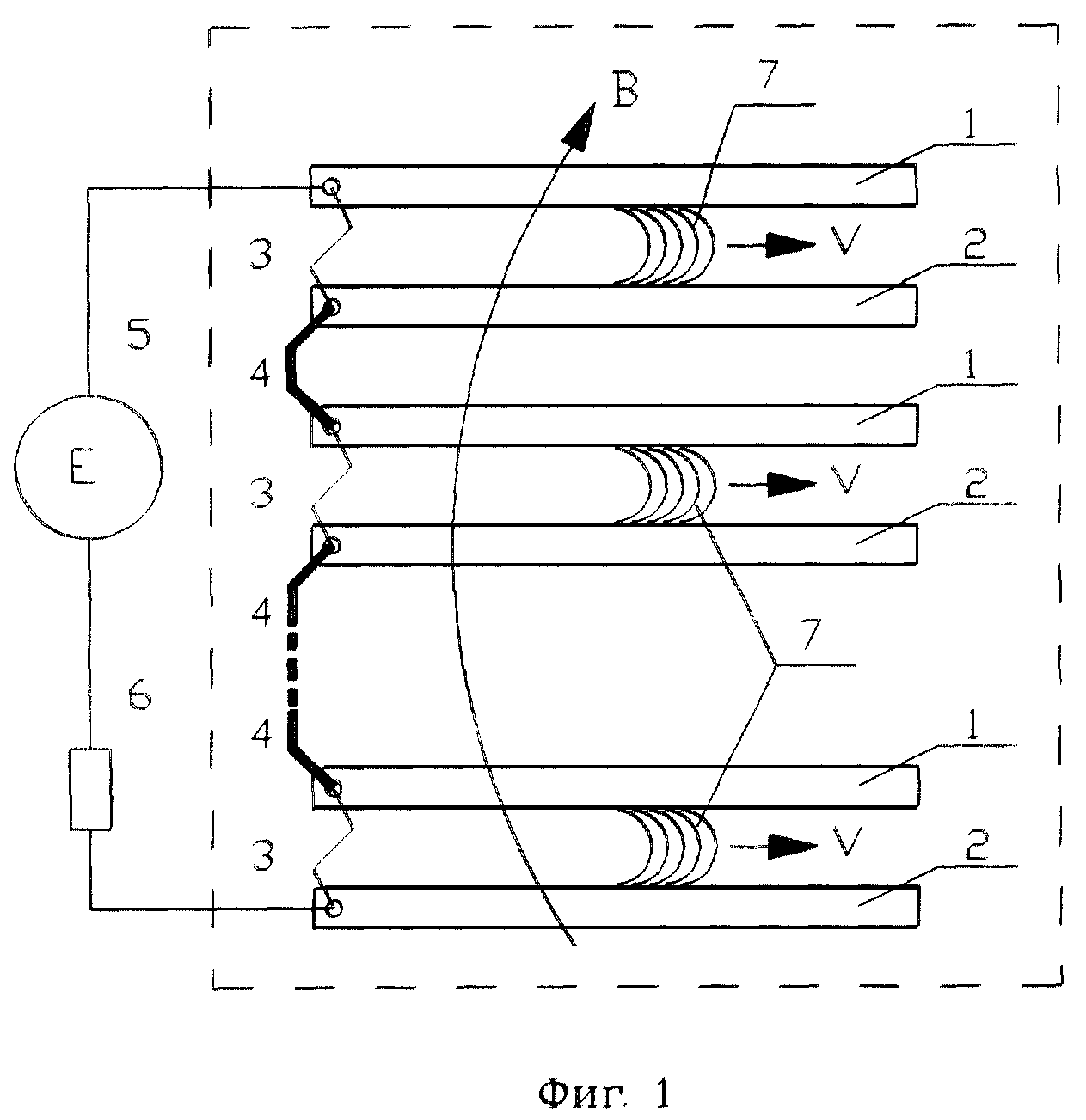 поля В всех каналов, на входе каналов между электродами 1 и 2 возникают электрические дуги 7, которые под действием суммарного магнитного поля В электродов всех каналов перемещаются вдоль электродов