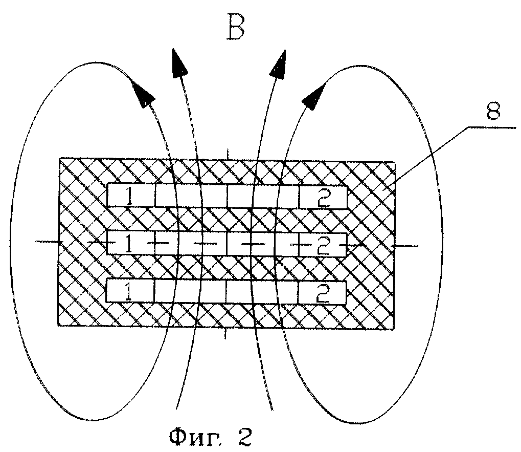 электроразрядных каналов, образованных парами электродов 1 и 2, размещенных в электроизоляционном корпусе 8. При этом электроды 1 одной полярности, так же как и электроды 2 другой полярности