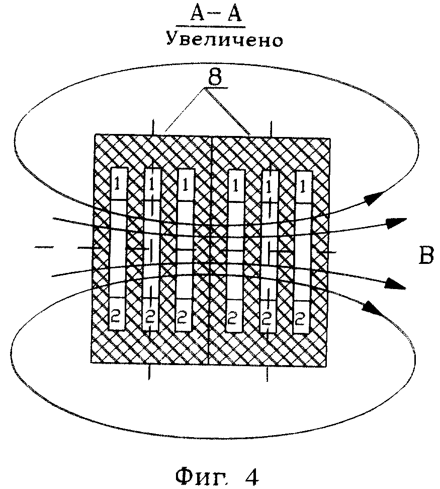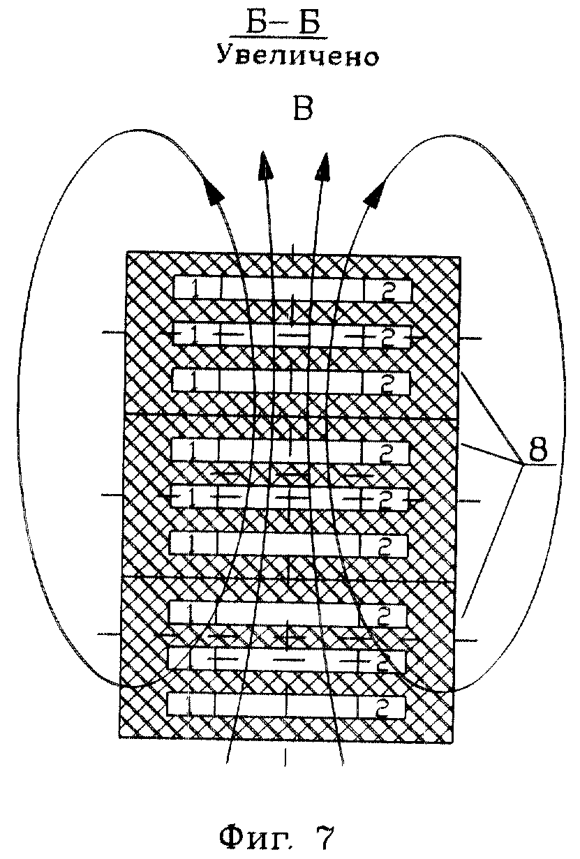стопами через слой электроизолятора корпуса 8. Позициями 9 и 10 отмечены соответственно, входной и выходной конец блока каналов. На фиг. 7 стрелками В показано суммарное магнитное поле