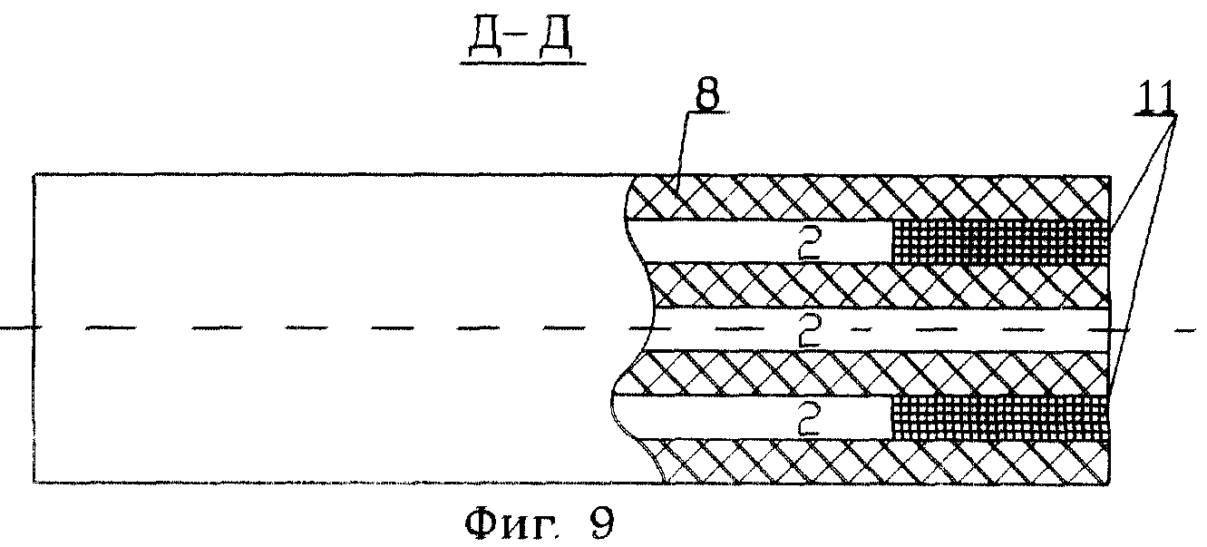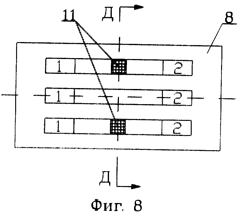 электроизоляционные перегородки 11, установленные, в данном случае, в первом и последнем канале блока. На продольном сечении Д-Д фиг.9 видны электроды 2, электроизолятор 8 и электроизоляционные