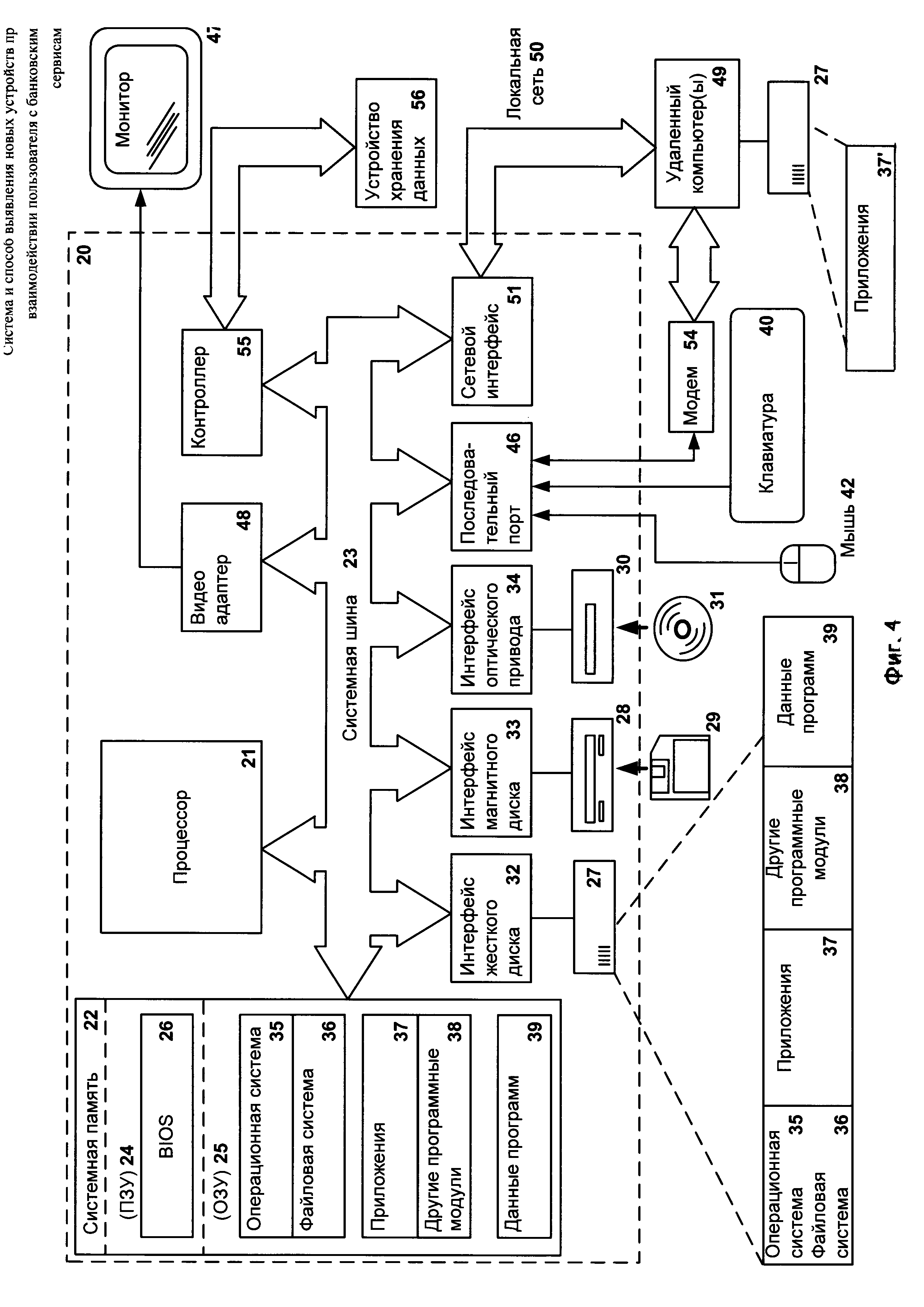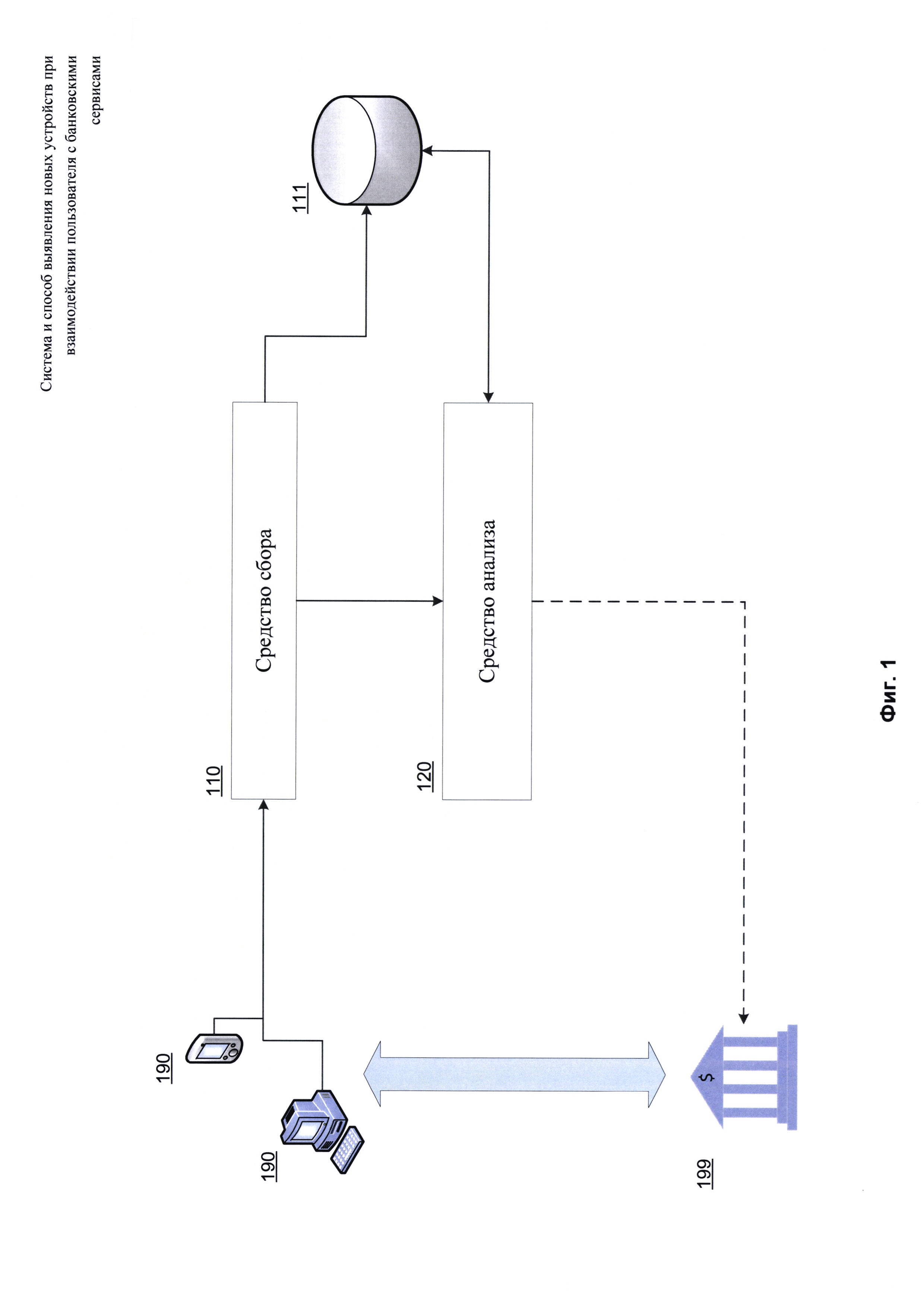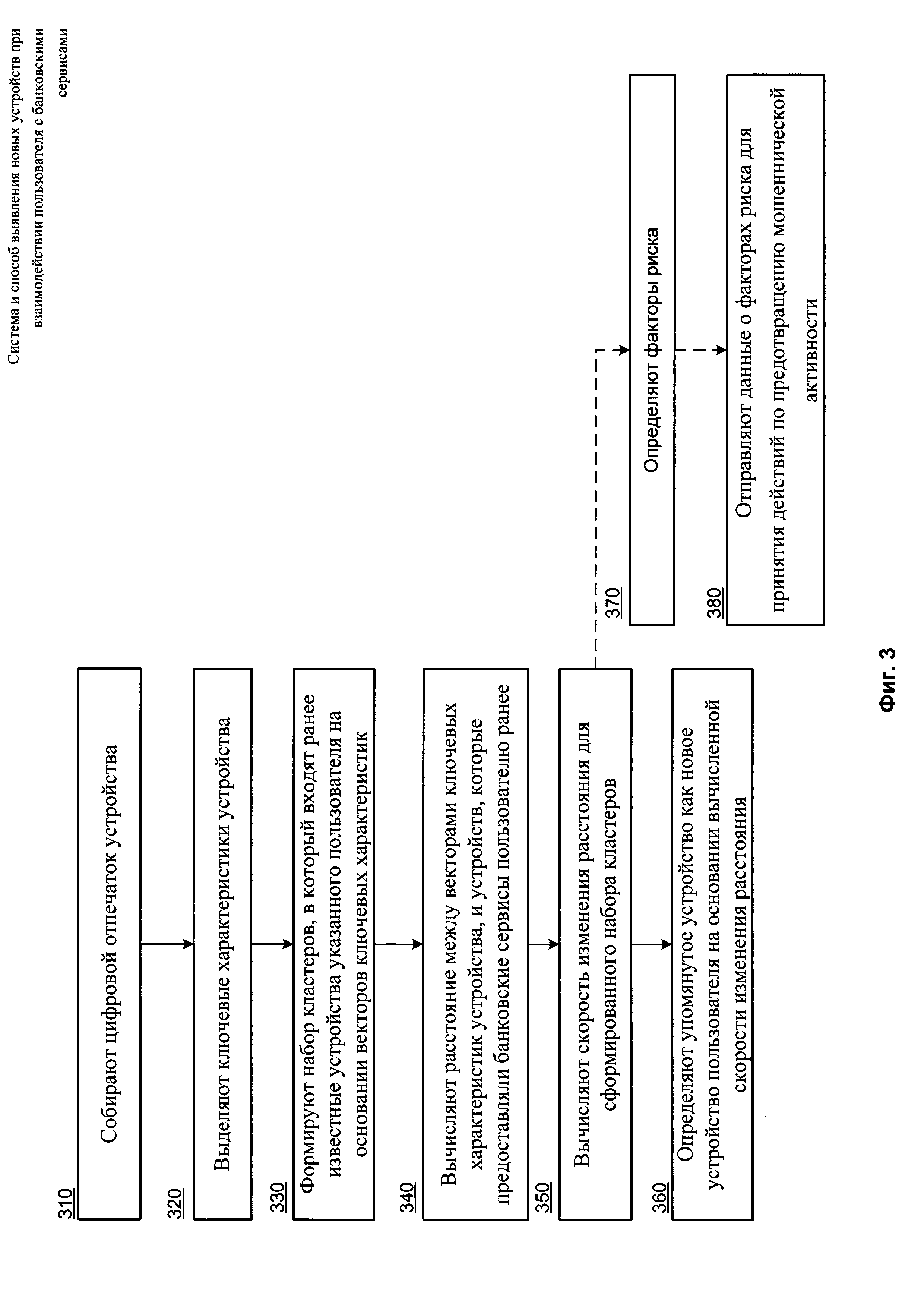 1. Система выявления нового устройства, которое предоставляет удаленные сервисы пользователю, при взаимодействии пользователя посредством аккаунта через устройство, которое предоставляет удаленные сервисы пользователю, которая содержит: • средство сбора, предназначенное для - сбора цифрового отпечатка устройства пользователя, при этом цифровой отпечаток содержит по меньшей мере одну характеристику упомянутого устройства, в момент времени, когда выполняется взаимодействие пользователя с удаленными сервисами посредством упомянутого устройства; - передачи цифрового отпечатка, содержащего упомянутые характеристики, средству анализа; • средство анализа, предназначенное для - выделения из собранных характеристик ключевых характеристик, а именно характеристик, которые влияют на безопасность упомянутого устройства; - формирования набора кластеров, в который входят ранее известные устройства указанного пользователя, при этом кластеризация выполняется на основании векторов ключевых характеристик устройства, где вектор ключевых характеристик содержит по крайней мере часть выделенных ключевых характеристик устройства; - вычисления расстояния между вектором ключевых характеристик упомянутого устройства и вектором ключевых характеристик по меньшей мере одного устройства, которое предоставляло удаленные сервисы пользователю ранее и которое входит в состав упомянутых созданных кластеров; - вычисления скорости изменения упомянутого расстояния для сформированного набора кластеров на основании информации о скорости изменения расстояния на всех известных устройствах других пользователей; - определения упомянутого устройства как нового устройства пользователя в случае, если вычисленное расстояние с учетом вычисленной скорости изменения расстояния выше порогового значения; • базу данных, предназначенную для хранения данных, полученных от средства сбора и средства анализа и информации о скорости изменения расстояния между векторами ключевых характеристик от всех известных устройств других пользователей. 2. Система по п. 1, в которой средство анализа на основании скорости изменения расстояния дополнительно определяет факторы риска. 3. Способ выявления новых устройств, посредством которых выполняется онлайн-доступ пользователя к удаленным сервисам, реализуемый с помощью средств из п. 1 настоящей формулы и содержащий этапы, на которых: а) собирают цифровой отпечаток устройства пользователя, при этом цифровой отпечаток содержит по меньшей мере одну характеристику упомянутого устройства, в момент времени, когда выполняется взаимодействие пользователя с удаленными сервисами посредством упомянутого устройства; б) выделяют из собранных характеристик ключевые характеристики, а именно характеристики, которые влияют на безопасность упомянутого устройства; в) формируют набор кластеров, в который входят ранее известные устройства указанного пользователя, при этом кластеризация выполняется на основании векторов ключевых характеристик устройства, где вектор ключевых характеристик содержит по крайней мере часть выделенных ключевых характеристик устройства; г) вычисляют расстояние между вектором ключевых характеристик упомянутого устройства и вектором ключевых характеристик по меньшей мере одного устр