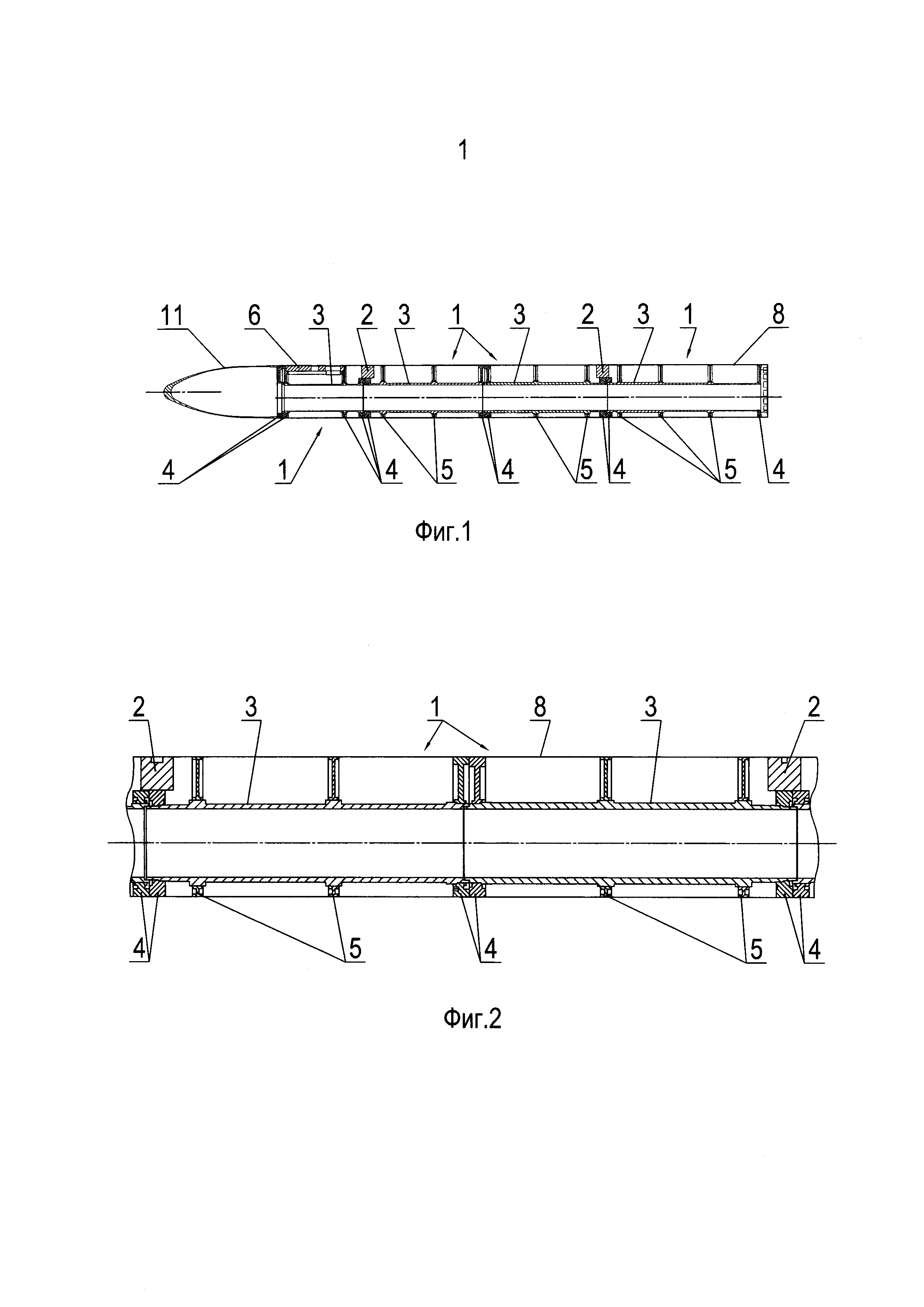 Изобретение относится к области авиации и ракетостроения, а именно к средствам имитации летательных аппаратов для проведения летных испытаний и обучения персонала. Также из уровня техники известна учебно-летная ракета (патент RU 2365860, МПК F42B 8/24, 27.08.2009), наиболее близкая к предлагаемому изобретению и выбранная в качестве прототипа. Учебно-летная ракета выполнена в виде корпуса, изготовленного из круглой трубы и снабженного узлами крепления к подвесному устройству самолета-носителя, причем толщина трубы позволяет имитировать вес реальной ракеты. Основным недостатком учебно-летной ракеты является то, что имитация с ее помощью ракет, имеющих некруглое поперечное сечение сложной формы, затруднена из-за сложности изготовления труб такого сечения. Дополнительно, для того чтобы положение центра масс учебно-летной ракеты совпадало с положением центра масс реальной ракеты, требуется использование грузов. Задачей предлагаемого изобретения является создание способа формирования габаритно-массовых макетов для беспилотных летательных аппаратов, прежде всего управляемых ракет и авиабомб, имеющих сложную (по крайней мере, некруглую) форму сечения миделя. Задача решается за счет того, что анализируют имитируемое изделие (беспилотный летательный аппарат), в том числе определяют габаритно-массовые характеристики, базовые элементы формы, расположение элементов подвески; определяют количество базовых элементов макета; определяют количество и параметры и изготавливают составные части базовых элементов макета - труб, силовых и регулярных шпангоутов, обшивки; при этом трубы выполнены с переменным по длине труб наружным диаметром, максимальным в местах установки силовых и регулярных шпангоутов (посадочных местах трубы), а силовые и регулярные шпангоуты состоят каждый из наружного контура, форма которого соответствует форме сечения имитируемого изделия, посадочного места под трубу и соединяющих их ребер жесткости, причем форма наружного контура силовых и регулярных шпангоутов либо повторяет форму сечения имитируемого изделия, либо не выходит за его пределы, а форма и диаметр посадочного места под трубу соответствуют посадочным местам трубы; закрепляют силовые и регулярные шпангоуты на трубах таким образом, что на торцах каждой из труб расположены силовые шпангоуты, и наружные контуры всех силовых и регулярных шпангоутов ориентированы одинаково; закрепляют на наружных контурах силовых и регулярных шпангоутов обшивку, образуя базовые элементы макета; соединяют базовые элементы макета торец к торцу и фиксируют; изготавливают и закрепляют на макете дополнительные элементы конструкции макета. В частном случае осуществления изобретения задача решается за счет того, что в состав дополнительных элементов конструкции макета входят имитатор головного обтекателя, имитатор воздухозаборного устройства, имитаторы аэродинамических поверхностей и элементы подвески. В другом частном случае осуществления изобретения задача решается за счет того, что на макете устанавливают дополнительную аппаратуру. В третьем частном случае осуществления изобретения задача решается за счет того, что дополнительная аппаратура представляет собой электрические имитаторы достартовых систем. В четвертом частном случае осуществления изобретени