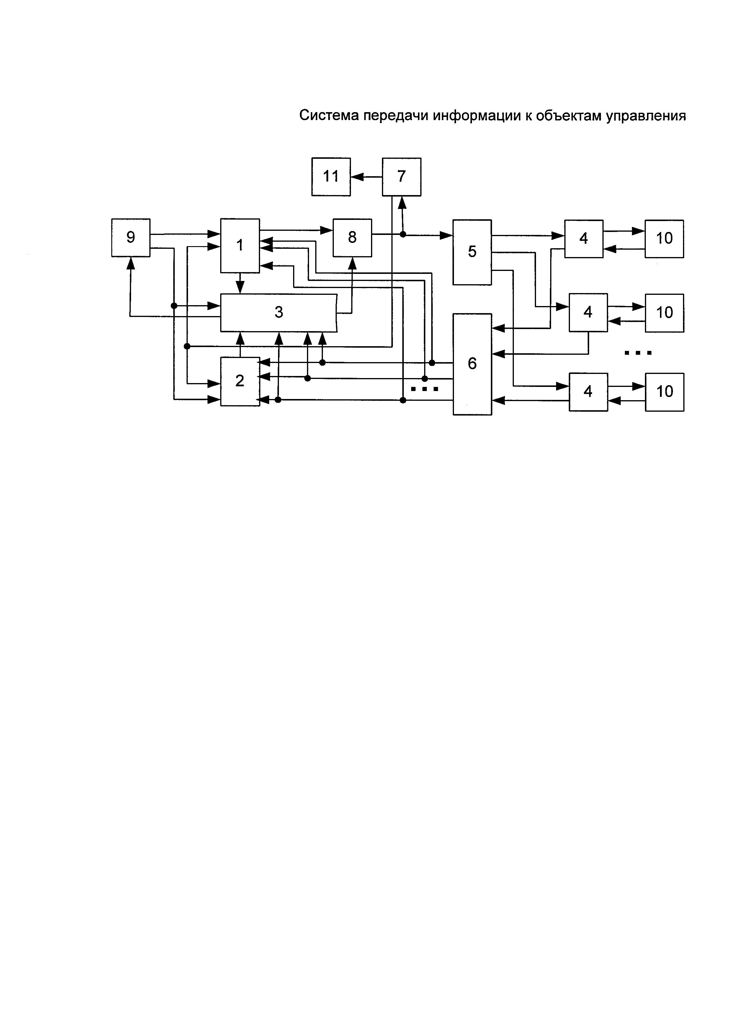 Система передачи информации к объектам управления, содержащая два многоканальных задатчиков-передатчиков, подключенных выходами с контрольной информацией к первому и второму входам блока контроля, блокирующего ключа, включенного между выходом данных первого задатчика-передатчика и входом первого канала связи и соединенного по разрешающему входу с первым выходом блока контроля, вход формирователя кодовой информации подключен к выходу блокирующего ключа, а выход - к первым входам задатчиков-передатчиков, вторые входы которых соединены с пультом управления, входы линейных устройств подключены к соответствующим выходам первого канала связи, первые выходы - к объектам управления, а вторые выходы - к соответствующим входам второго канала связи, выход второго канала связи соединен с первыми входами задатчиков-передатчиков, которые выполнены с возможностью формирования предварительных команд и, после подтверждения принятия их линейными устройствами, исполнительных команд, линейные устройства, число которых соответствует числу объектов управления, выполнены с возможностью формирования управляющих воздействий на объекты управления при соответствии принимаемых предварительных и исполнительных команд между собою и непревышении максимального интервала времени от приема предварительной команды до приема исполнительной команды, отличающаяся тем, что в нее введен монитор, вход которого подключен к второму выходу формирователя кодовой информации, при этом объекты управления выполнены с возможностью формирования квитанций при выполнении соответствующих управляющих воздействий, а линейные устройства - с возможностью преобразования указанных квитанций в сообщения, аналогичные передаваемым по первому каналу связи, кроме того, выход каждого объекта управления подключен к второму входу линейного устройства, а выходы второго канала связи по числу объектов управления - к соответствующим входам блока контроля, второй выход которого соединен с входом пульта управления.