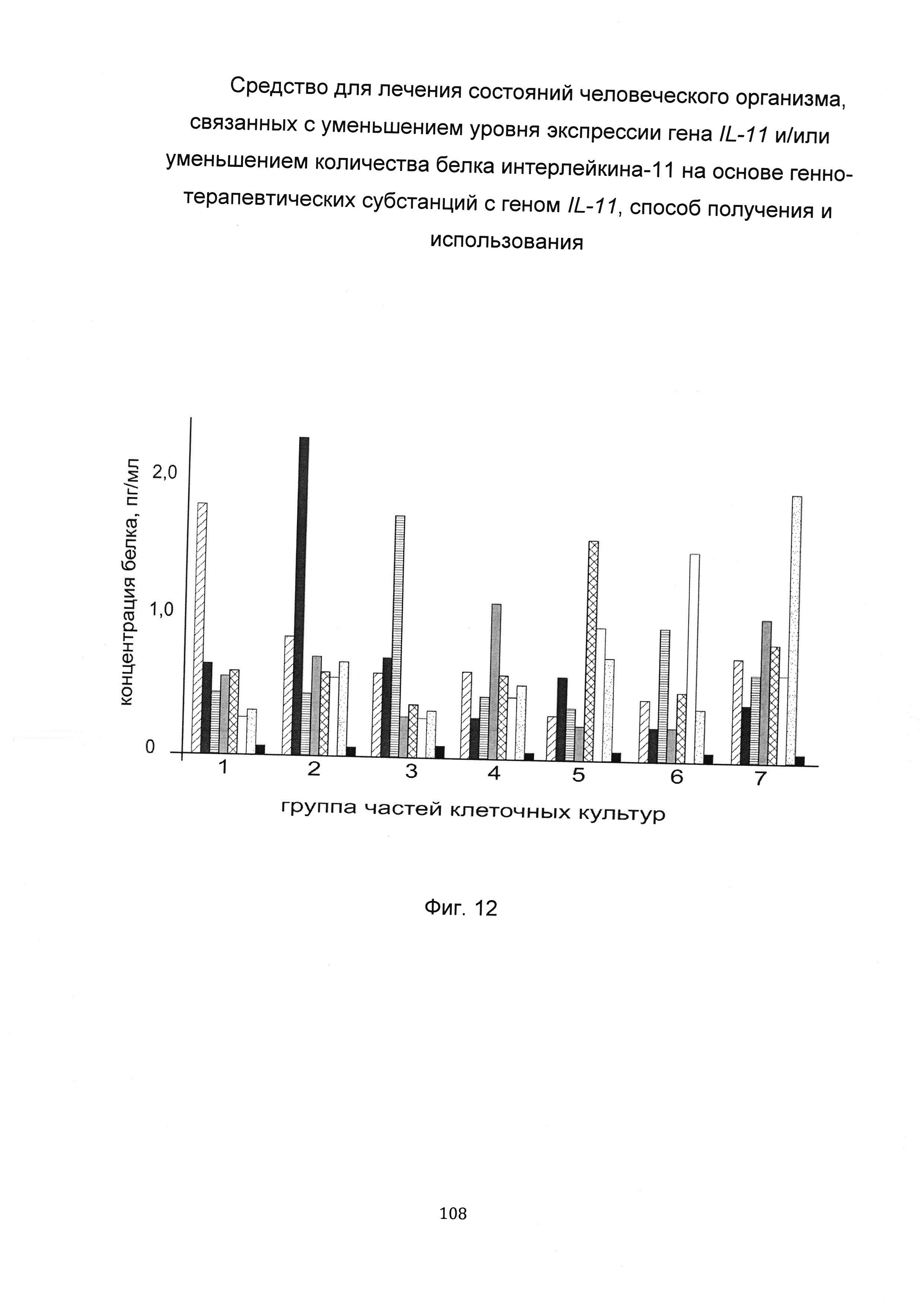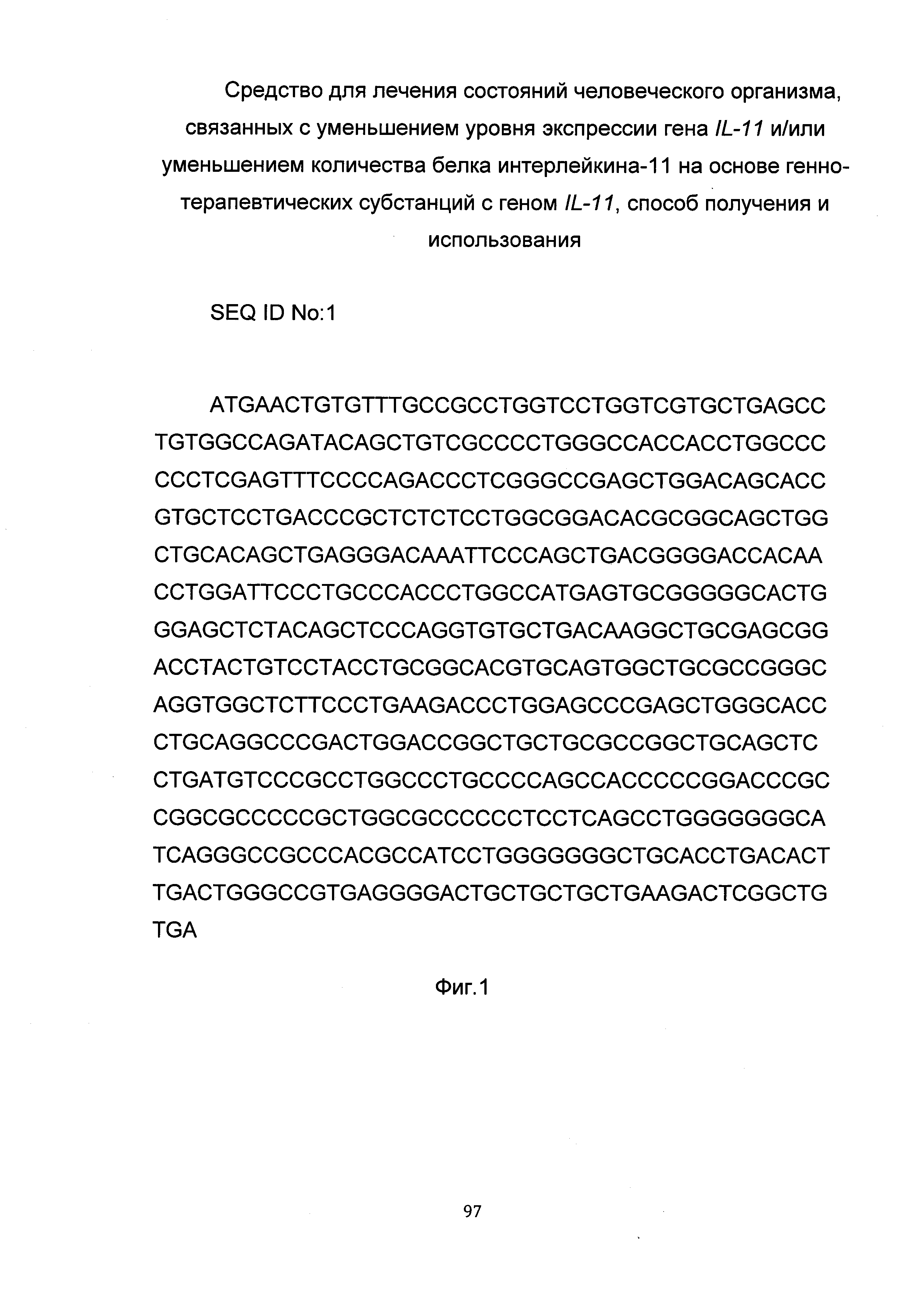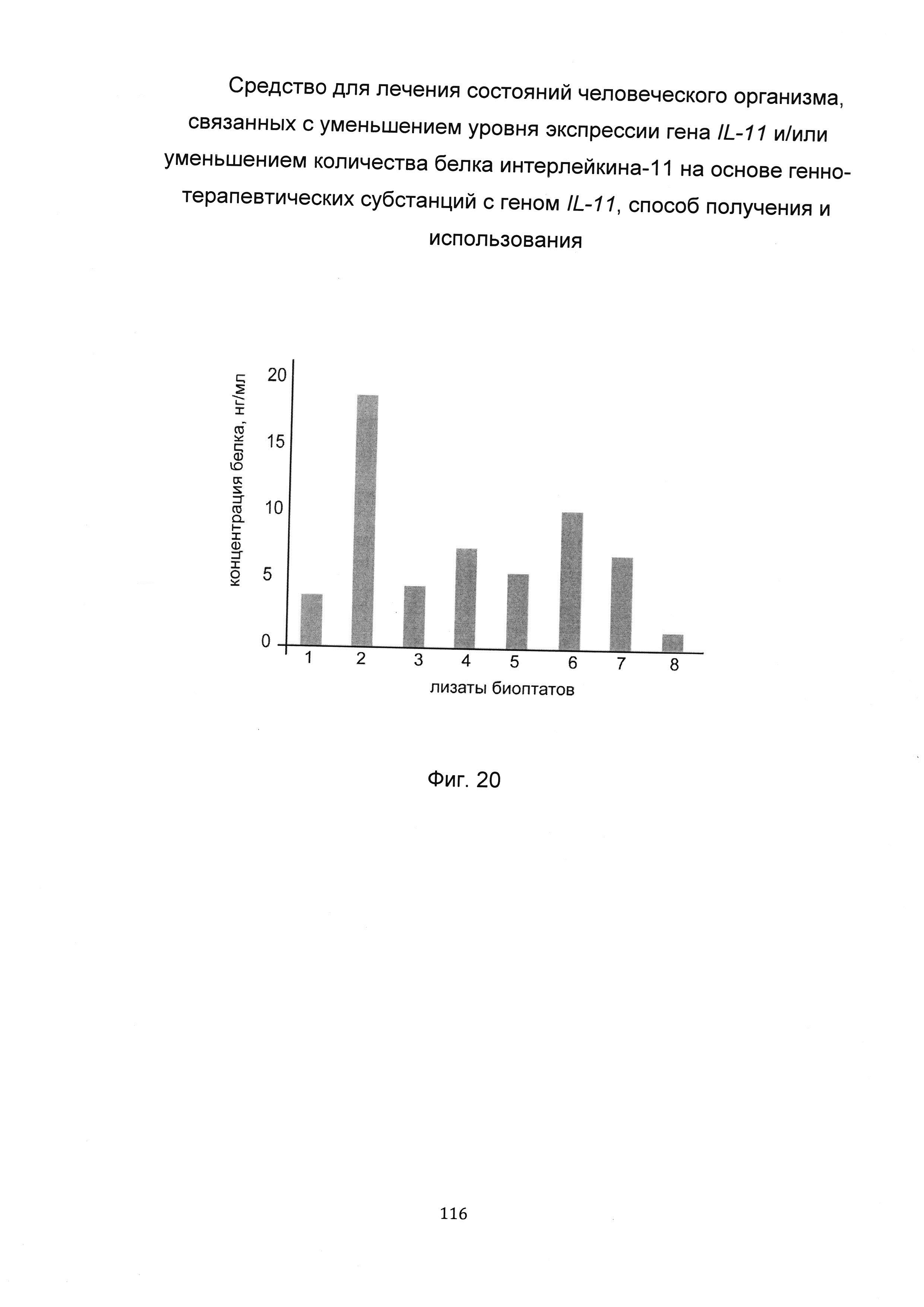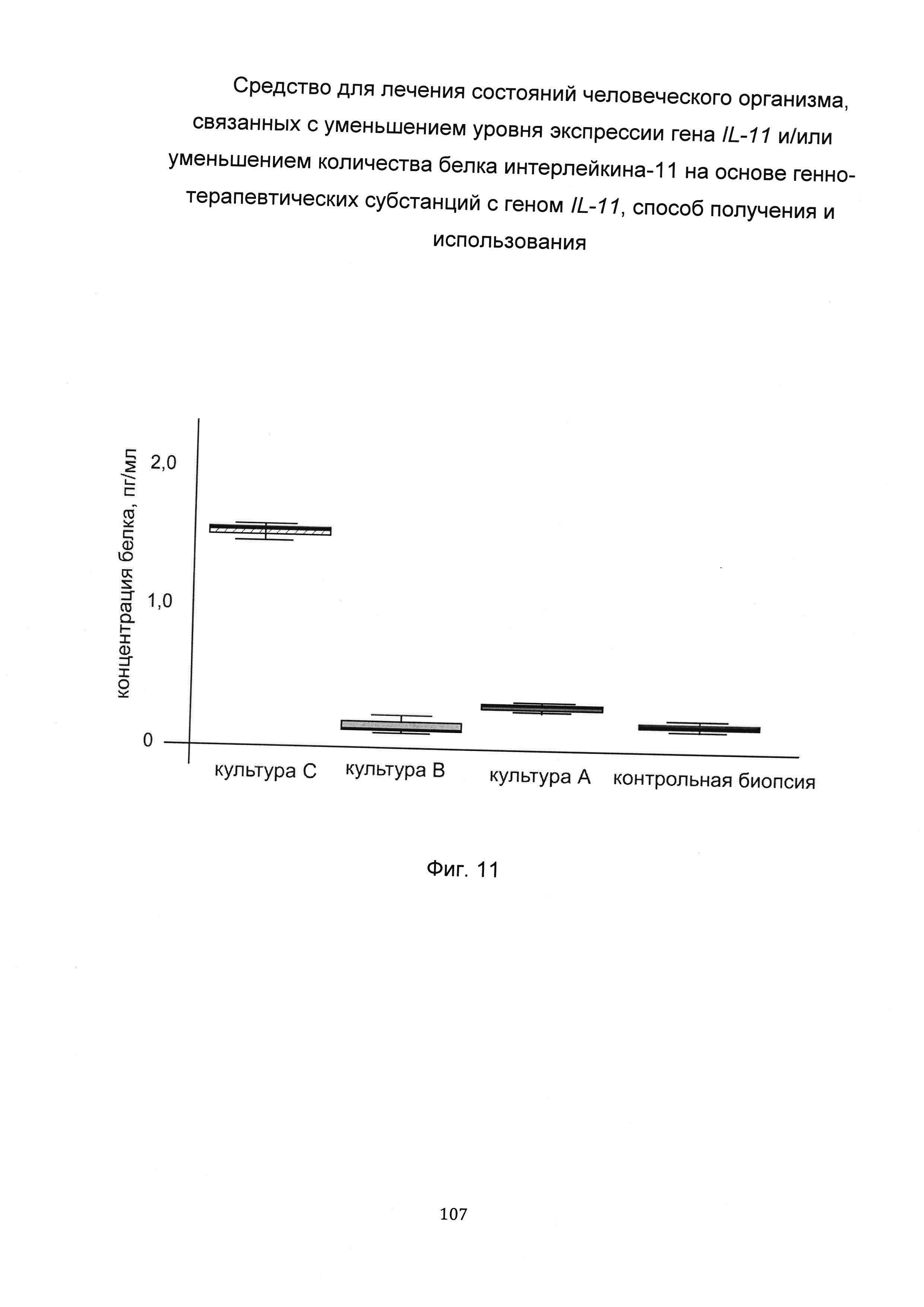 Группа изобретений относится к медицине и касается средства для лечения состояний клеток различных органов и тканей, а также собственно органов и тканей человека, связанных с уменьшением экспрессии гена IL-11 и/или уменьшением количества белка интерлейкина-11 на основе генно-терапевтических субстанций с геном IL-11, где клетки органов и тканей выбраны из клеток фибробластов, клеток эндометрия матки, хондроцитов и эпителиальных клеток; органы и ткани выбраны из кожи, матки, хрящевой ткани, эндометриальной ткани или мышечной ткани человека, представляющего собой по крайней мере одну генно-терапевтическую субстанцию, выбранную из группы генно-терапевтических субстанций, каждая из которых представляет генетическую конструкцию на основе векторной плазмиды, включающей кДНК гена IL-11, с кодирующей последовательностью белка интерлейкина-11, с делециями 5'- и 3'-нетранслируемых областей, а именно полученной на основе участка нативной немодифицированной кДНК гена IL-11 SEQ ID No: 1 или участка нативной немодифицированной кДНК гена IL-11 SEQ ID No: 2 или модифицированной кДНК гена IL-11, при этом в качестве модифицированной кДНК гена IL-11 используют SEQ ID No: 3, или SEQ ID No: 4, или SEQ ID No: 5, или SEQ ID No: 6, или SEQ ID No: 7, или сочетание этих генетических конструкций, каждая из которых содержит также регуляторные элементы, в сочетании с транспортной молекулой или без нее. Группа изобретений также касается способа получения указанного средства; способа использования указанного средства для лечения состояний человеческого организма, связанных с уменьшением экспрессии гена IL-11 и/или уменьшением количества белка интерлейкина-11. Группа изобретений обеспечивает высокий и стабильный уровень целевого белка в клетках. 3 н. и 2 з.п. ф-лы, 18 пр., 20 ил.