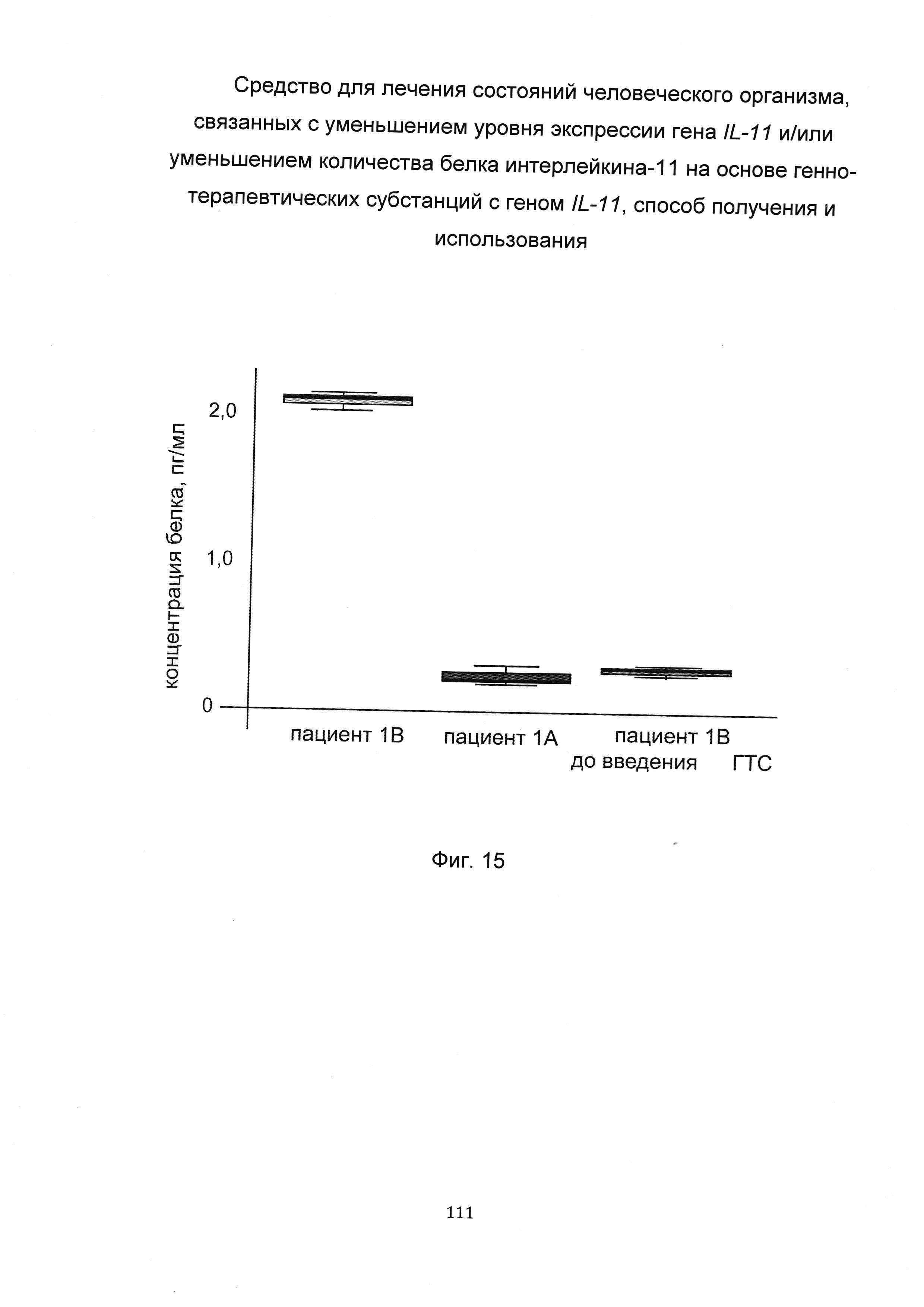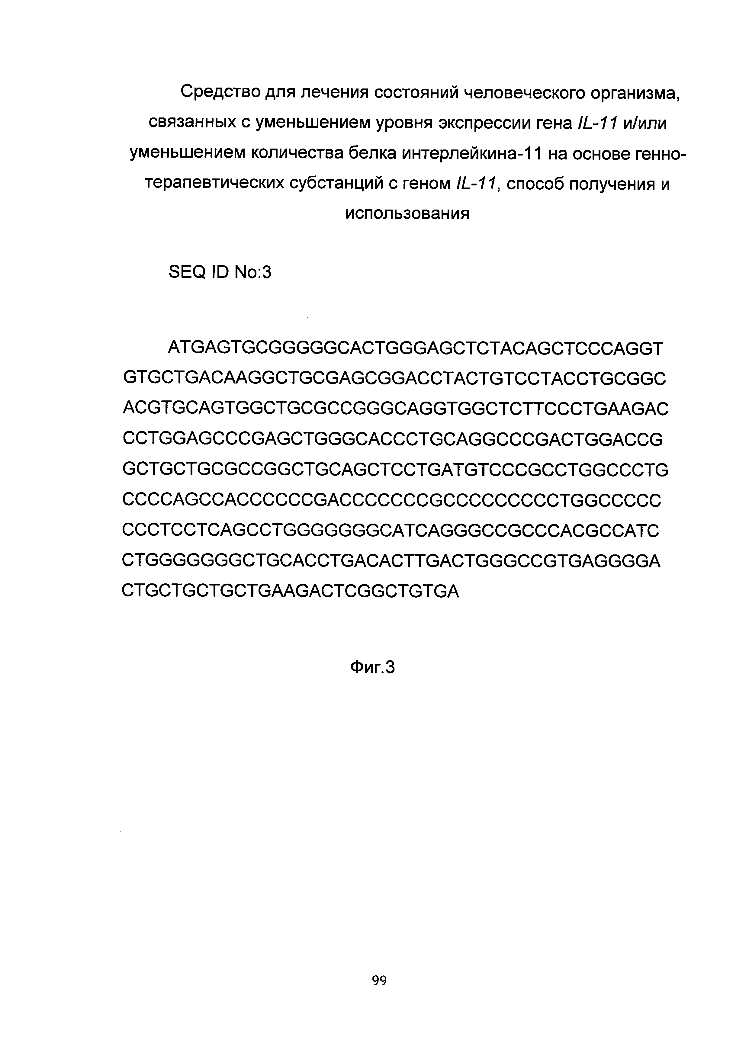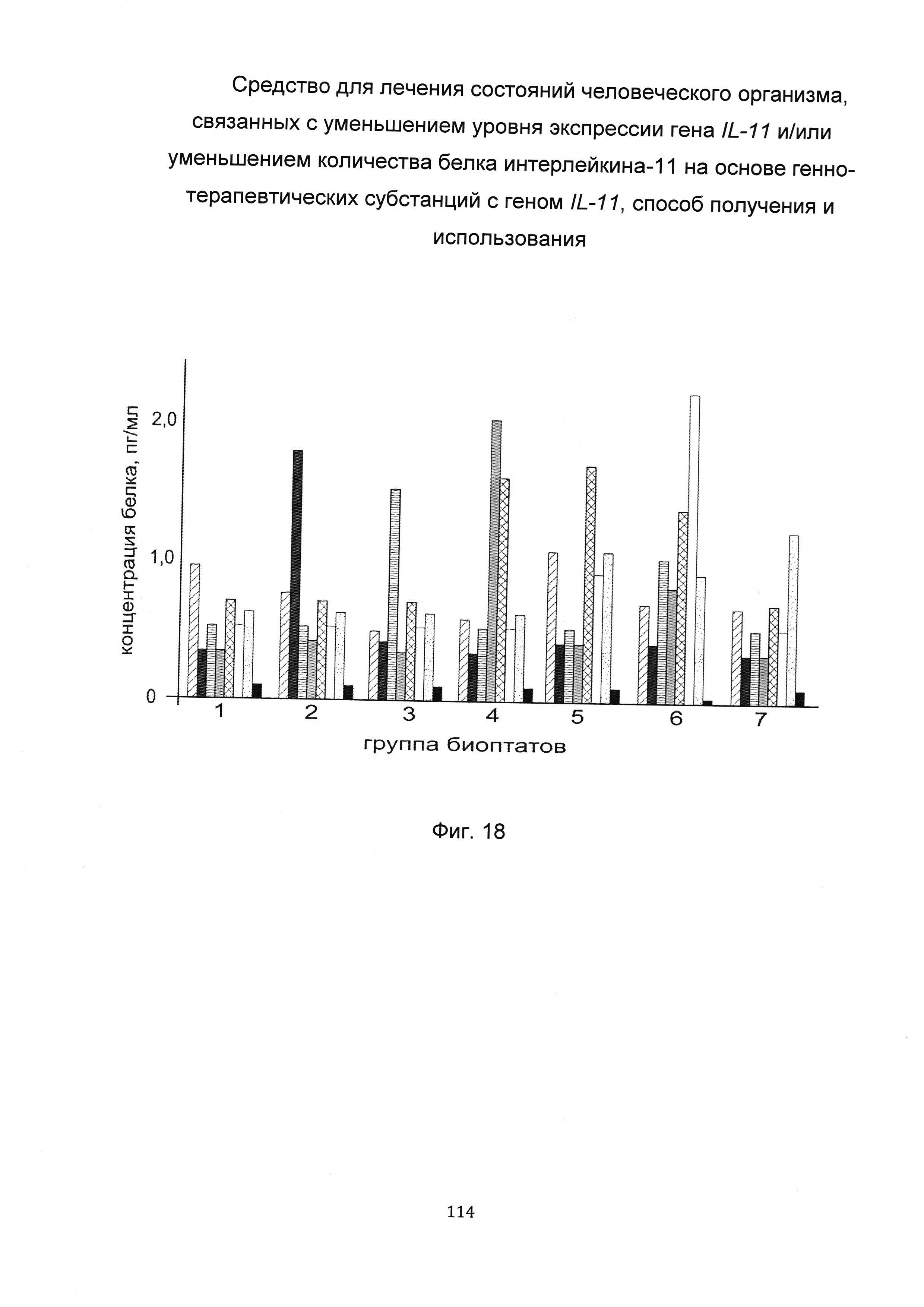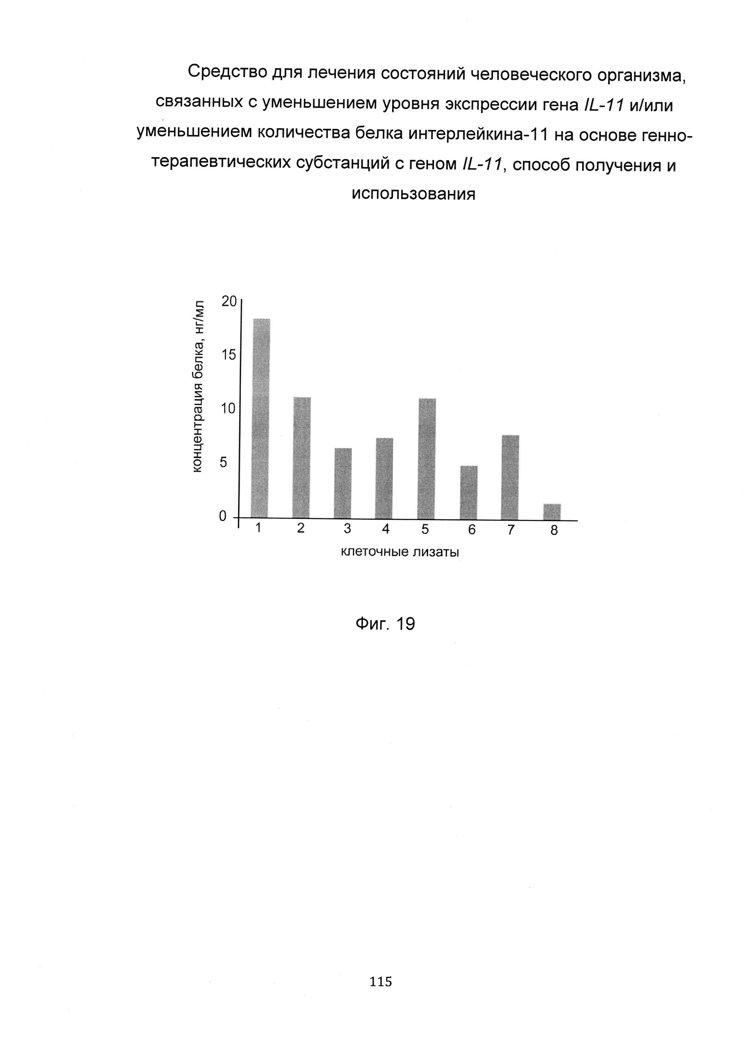 Группа изобретений относится к медицине и касается средства для лечения состояний клеток различных органов и тканей, а также собственно органов и тканей человека, связанных с уменьшением экспрессии гена IL-11 и/или уменьшением количества белка интерлейкина-11 на основе генно-терапевтических субстанций с геном IL-11, где клетки органов и тканей выбраны из клеток фибробластов, клеток эндометрия матки, хондроцитов и эпителиальных клеток; органы и ткани выбраны из кожи, матки, хрящевой ткани, эндометриальной ткани или мышечной ткани человека, представляющего собой по крайней мере одну генно-терапевтическую субстанцию, выбранную из группы генно-терапевтических субстанций, каждая из которых представляет генетическую конструкцию на основе векторной плазмиды, включающей кДНК гена IL-11, с кодирующей последовательностью белка интерлейкина-11, с делециями 5'- и 3'-нетранслируемых областей, а именно полученной на основе участка нативной немодифицированной кДНК гена IL-11 SEQ ID No: 1 или участка нативной немодифицированной кДНК гена IL-11 SEQ ID No: 2 или модифицированной кДНК гена IL-11, при этом в качестве модифицированной кДНК гена IL-11 используют SEQ ID No: 3, или SEQ ID No: 4, или SEQ ID No: 5, или SEQ ID No: 6, или SEQ ID No: 7, или сочетание этих генетических конструкций, каждая из которых содержит также регуляторные элементы, в сочетании с транспортной молекулой или без нее. Группа изобретений также касается способа получения указанного средства; способа использования указанного средства для лечения состояний человеческого организма, связанных с уменьшением экспрессии гена IL-11 и/или уменьшением количества белка интерлейкина-11. Группа изобретений обеспечивает высокий и стабильный уровень целевого белка в клетках. 3 н. и 2 з.п. ф-лы, 18 пр., 20 ил.