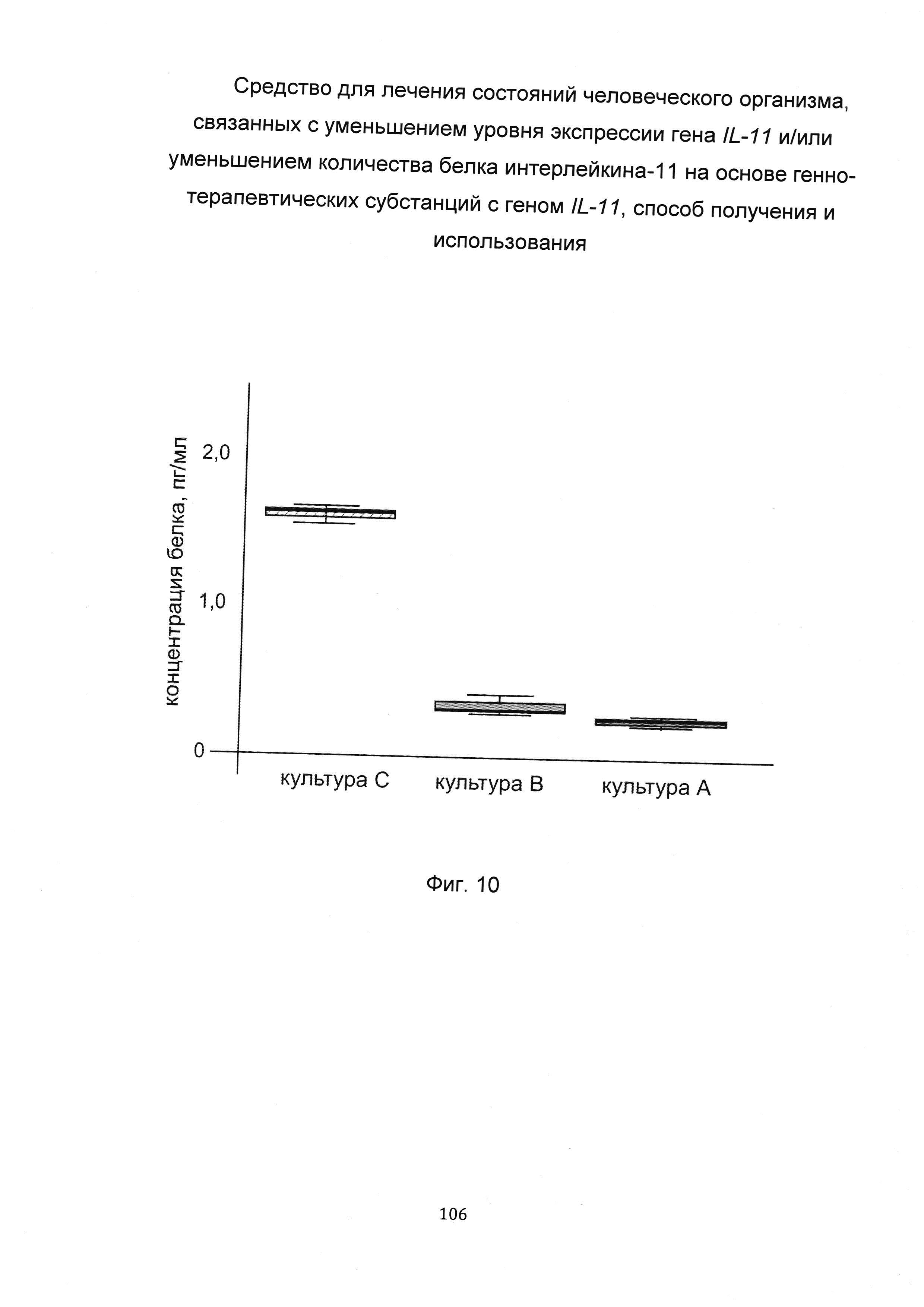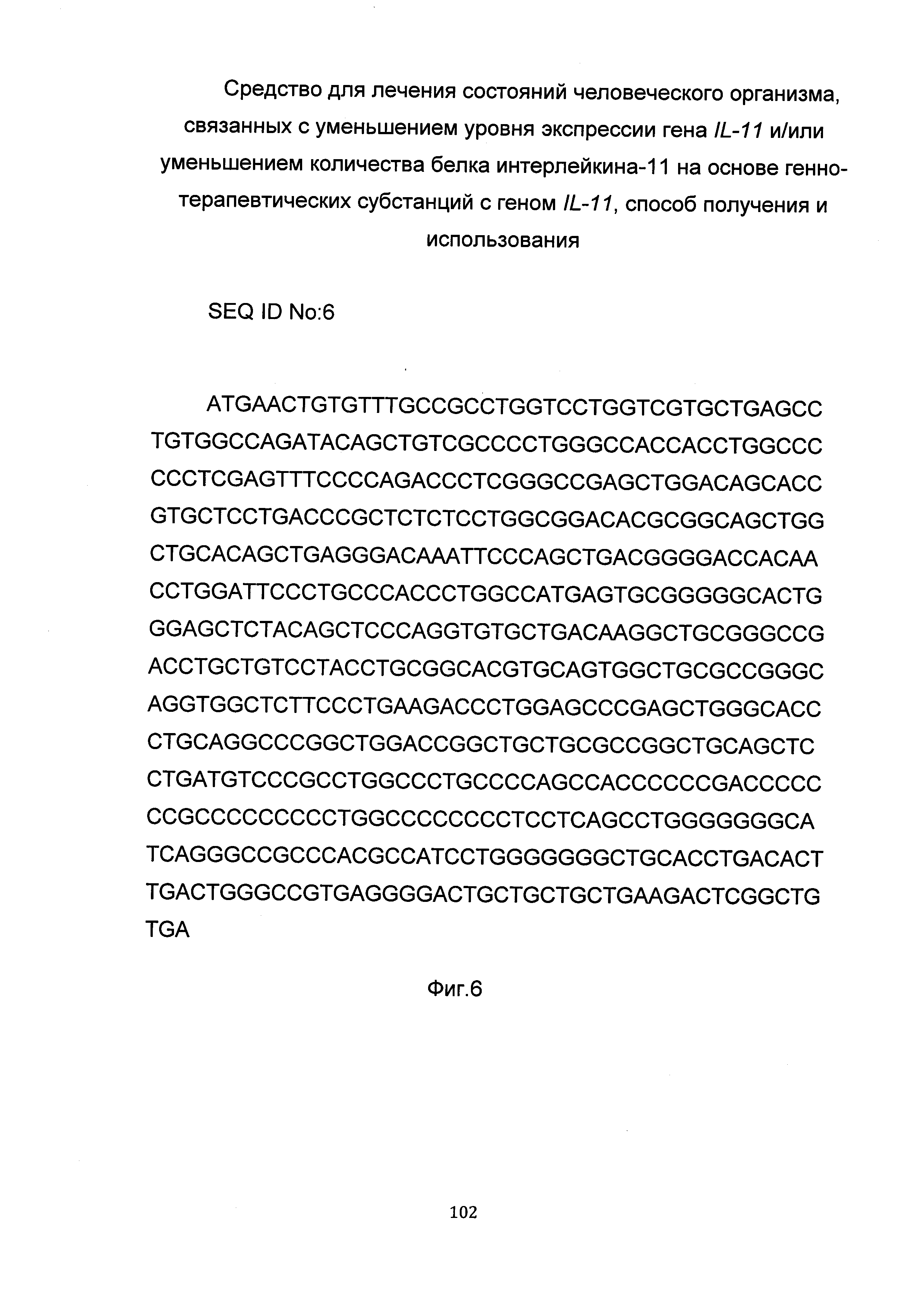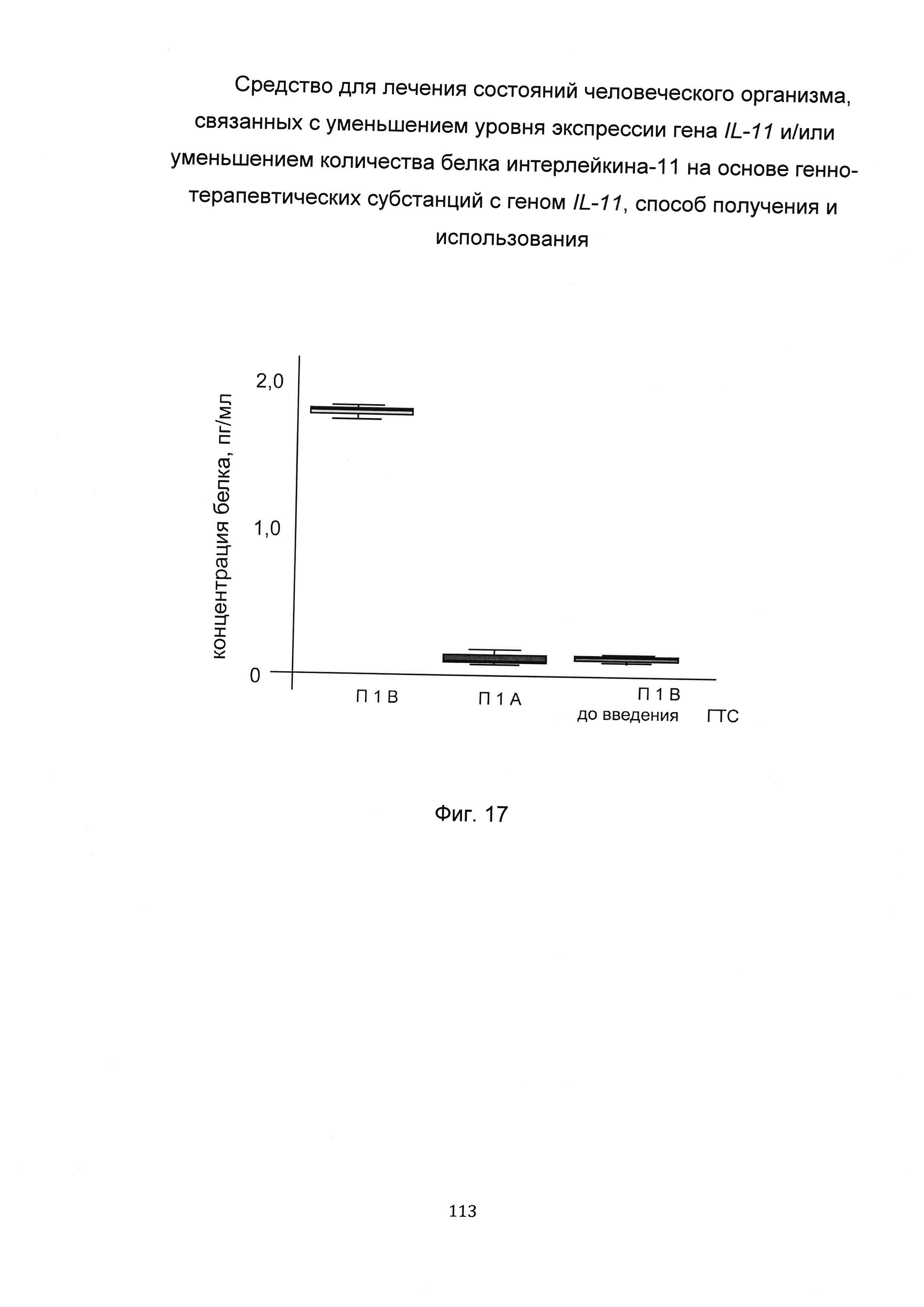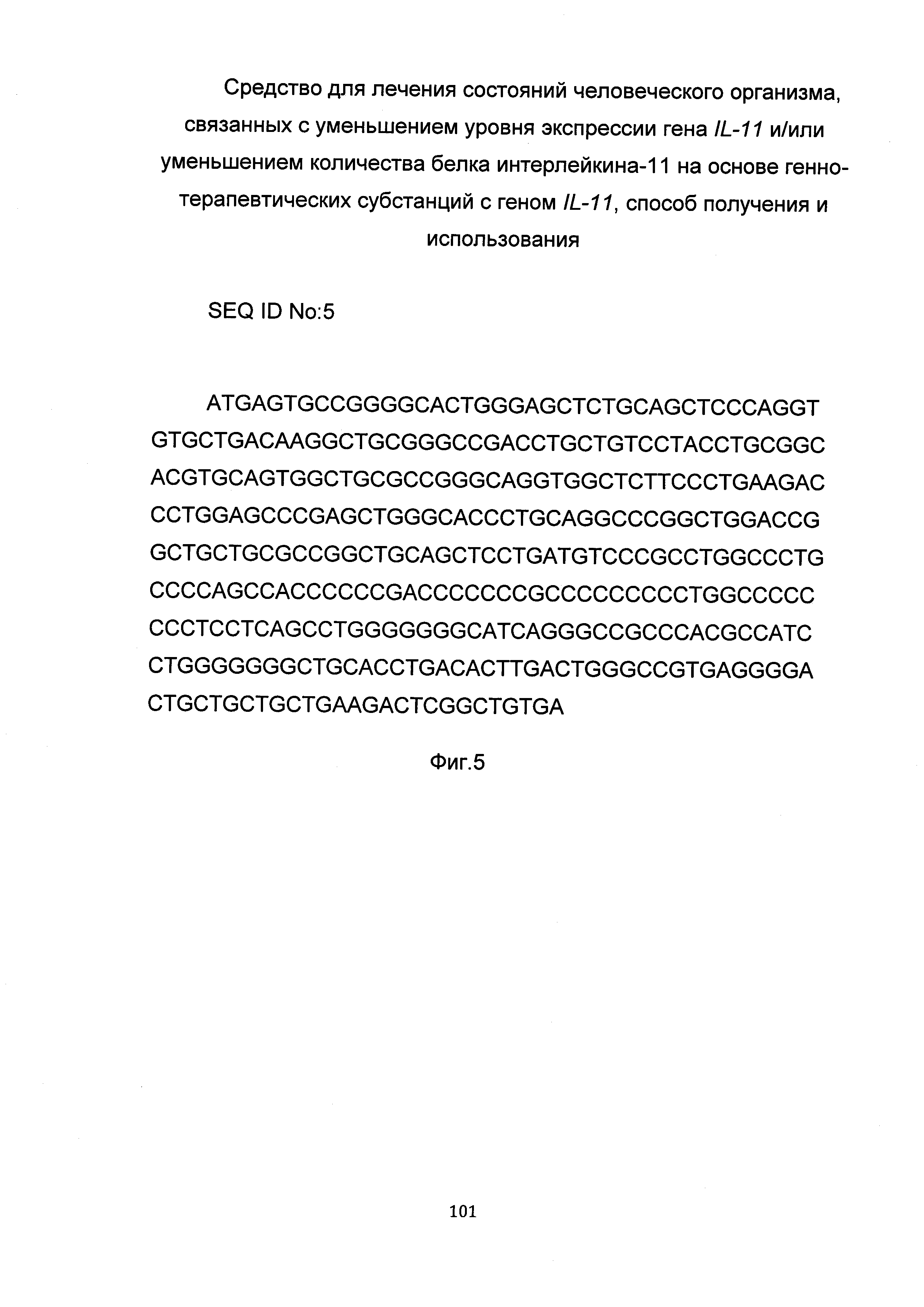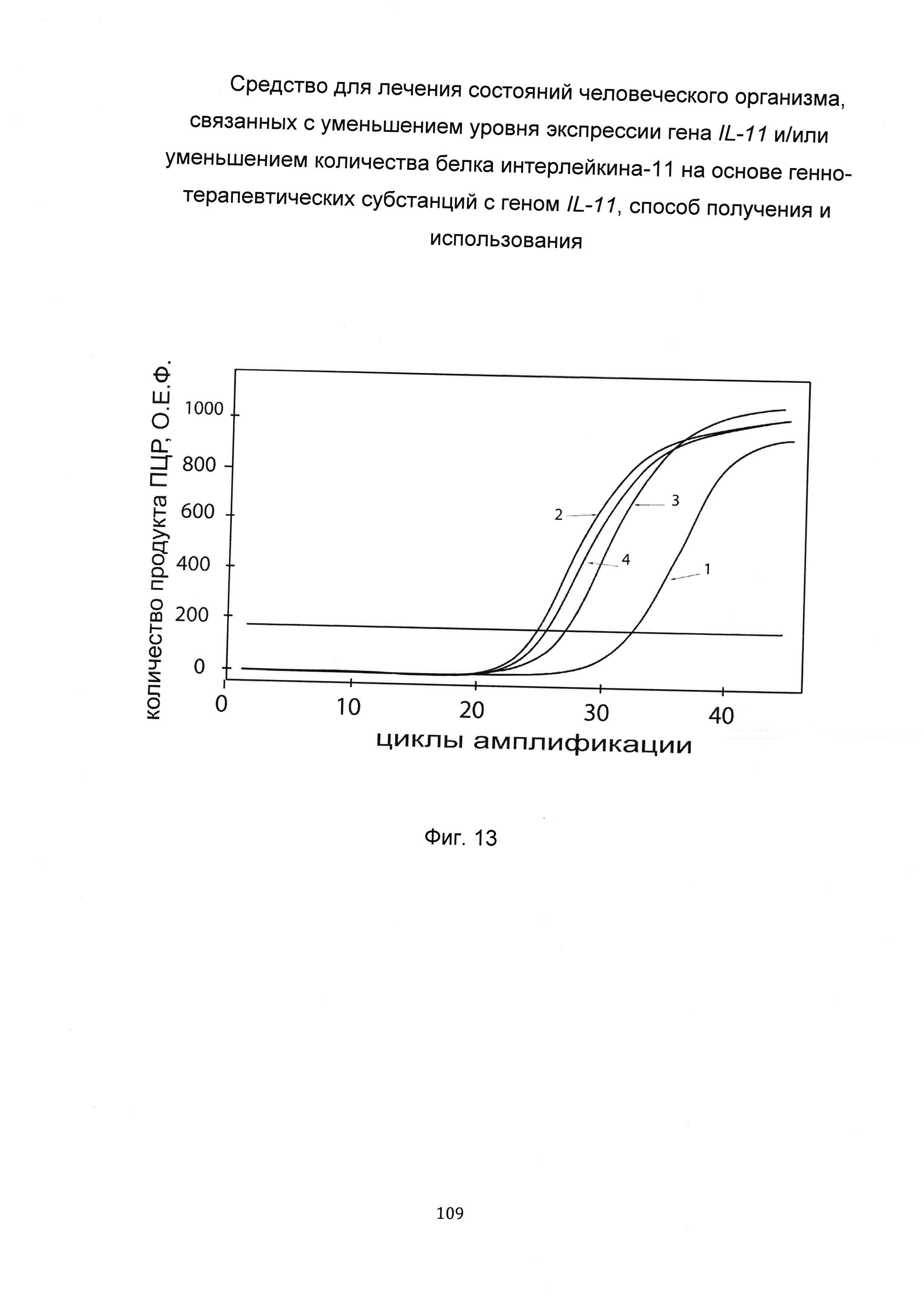 Группа изобретений относится к медицине и касается средства для лечения состояний клеток различных органов и тканей, а также собственно органов и тканей человека, связанных с уменьшением экспрессии гена IL-11 и/или уменьшением количества белка интерлейкина-11 на основе генно-терапевтических субстанций с геном IL-11, где клетки органов и тканей выбраны из клеток фибробластов, клеток эндометрия матки, хондроцитов и эпителиальных клеток; органы и ткани выбраны из кожи, матки, хрящевой ткани, эндометриальной ткани или мышечной ткани человека, представляющего собой по крайней мере одну генно-терапевтическую субстанцию, выбранную из группы генно-терапевтических субстанций, каждая из которых представляет генетическую конструкцию на основе векторной плазмиды, включающей кДНК гена IL-11, с кодирующей последовательностью белка интерлейкина-11, с делециями 5'- и 3'-нетранслируемых областей, а именно полученной на основе участка нативной немодифицированной кДНК гена IL-11 SEQ ID No: 1 или участка нативной немодифицированной кДНК гена IL-11 SEQ ID No: 2 или модифицированной кДНК гена IL-11, при этом в качестве модифицированной кДНК гена IL-11 используют SEQ ID No: 3, или SEQ ID No: 4, или SEQ ID No: 5, или SEQ ID No: 6, или SEQ ID No: 7, или сочетание этих генетических конструкций, каждая из которых содержит также регуляторные элементы, в сочетании с транспортной молекулой или без нее. Группа изобретений также касается способа получения указанного средства; способа использования указанного средства для лечения состояний человеческого организма, связанных с уменьшением экспрессии гена IL-11 и/или уменьшением количества белка интерлейкина-11. Группа изобретений обеспечивает высокий и стабильный уровень целевого белка в клетках. 3 н. и 2 з.п. ф-лы, 18 пр., 20 ил.