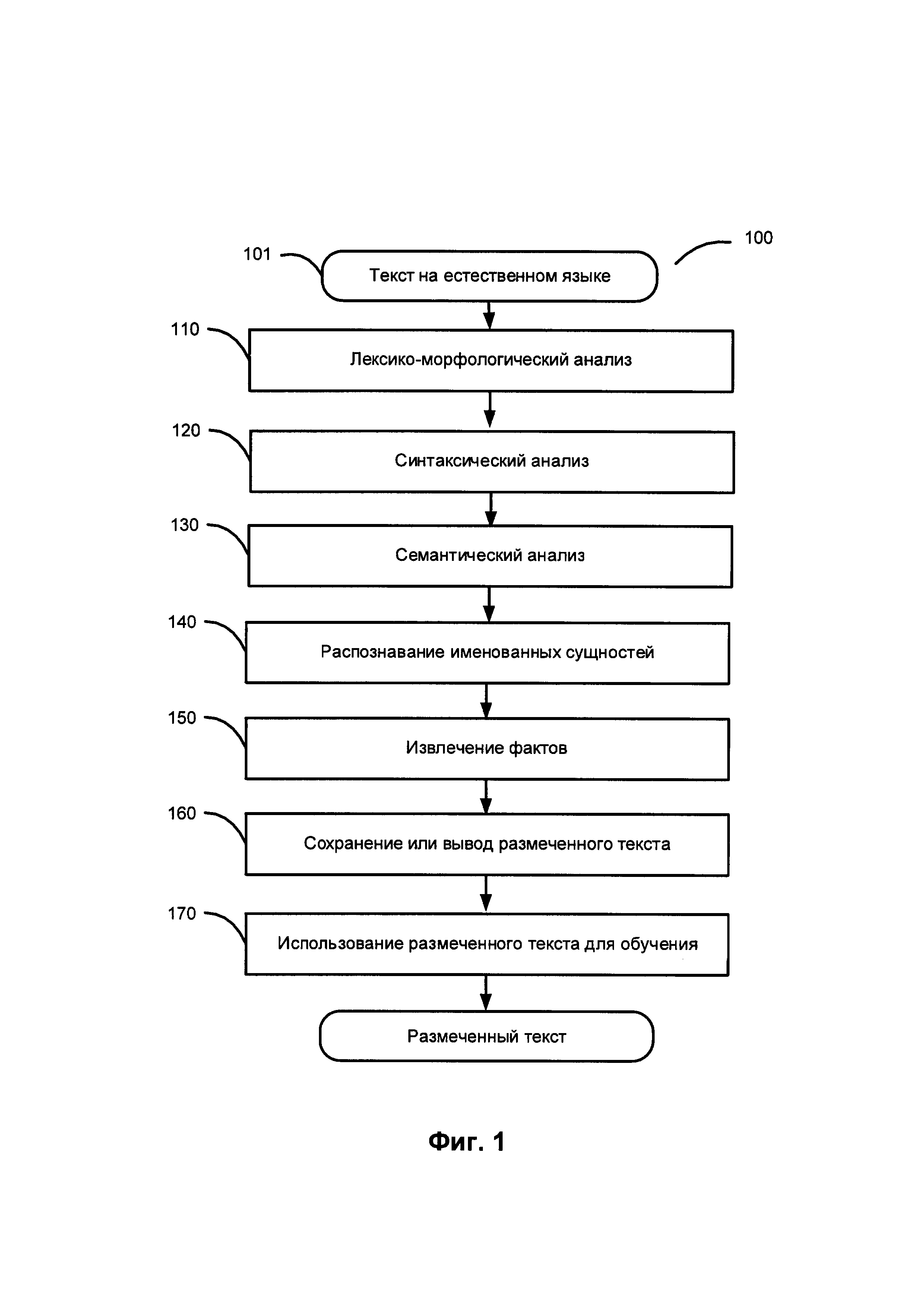 1. Способ создания обучающих выборок, содержащий: выполнение вычислительной системой лексико-морфологического анализа текста на естественном языке, содержащего множество токенов, для определения на основе лексико-морфологического анализа одного или более лексических значений и грамматических значений, связанных с каждым токеном в множестве токенов, где каждый токен содержит, по меньшей мере, одно слово естественного языка; выполнение синтактико-семантического анализа текста на естественном языке для получения множества семантических структур, включающего одну или более семантических структур для одного или более предложений исходного текста на естественном языке; определение на основе семантических структур множества синтаксических и семантических атрибутов семантических структур, ассоциированных с текстом на естественном языке; выбор из лексических, грамматических, синтаксических и семантических атрибутов семантических структур набора выходных атрибутов; и создание выходного текста и индекса, включающего символические идентификаторы одного или более значения атрибутов из выходного набора атрибутов, где каждый атрибут связан с соответствующей частью текста на естественном языке, и указанное одно или более значение атрибутов сопровождается значением вероятности. 2. Способ по п. 1, дополнительно включающий: определение для одного или более токенов текста на естественном языке степени ассоциации токена с категорией информационных объектов. 3. Способ по п. 2, отличающийся тем, что определение степени ассоциации дополнительно включает: интерпретацию синтактико-семантических структур с использованием набора продукционных правил. 4. Способ по п. 2, отличающийся тем, что определение степени ассоциации дополнительно включает: применение функции классификатора к одному или более лексическим, грамматическим, синтаксическим или семантическим атрибутам. 5. Способ по п. 2, дополнительно включающий: выявление одной или более связей между обнаруженными информационными объектами для извлечения одного или более фактов, представленных, как минимум, фрагментом текста на естественном языке. 6. Способ по п. 5, отличающийся тем, что определение связей дополнительно включает: интерпретацию синтактико-семантических структур с использованием набора продукционных правил. 7. Способ по п. 5, отличающийся тем, что определение связей дополнительно включает: применение функции классификатора к одному или более значениям лексических, грамматических, синтаксических или семантических атрибутов. 8. Способ по п. 1, отличающийся тем, что выходной набор атрибутов включает первое альтернативное значение для первого атрибута и второе альтернативное значение для первого атрибута. 9. Способ по п. 8, отличающийся тем, что выходной набор атрибутов содержит степень ассоциации первого альтернативного значения с первым атрибутом. 10. Способ по п. 1, отличающийся тем, что выходной текст представлен в виде текста на расширяемом языке разметки (XML). 11. Способ по п. 1, отличающийся тем, что каждая синтактико-семантическая структура из множества синтактико-семантических структур представлена графом, включающим множество вершин, соответствующих множеству семантических классов, и множество дуг, соответствующих множеству семантических отношений. 12. С