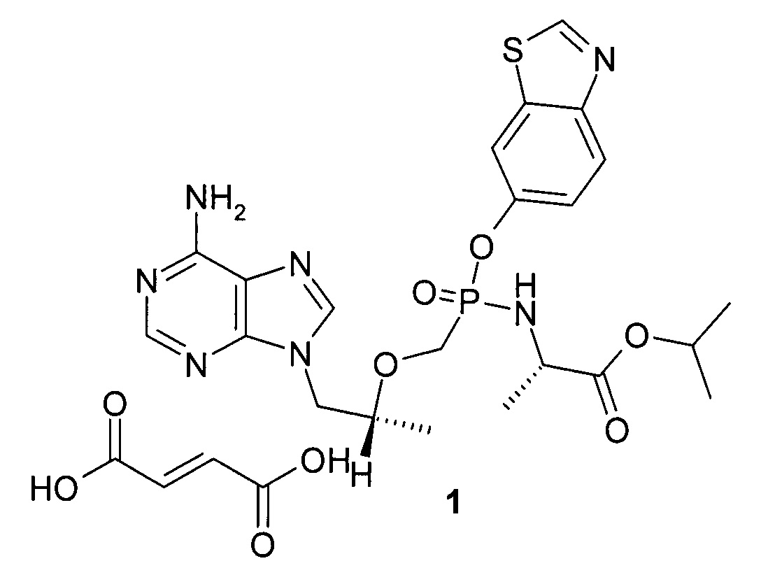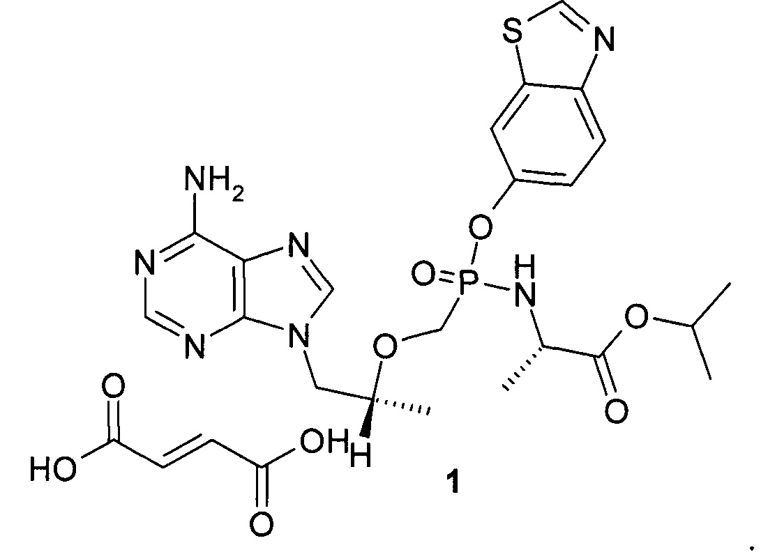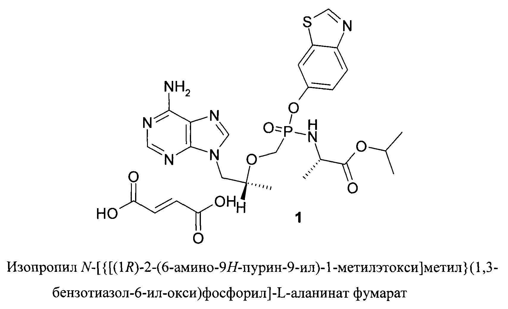 Настоящее изобретение относится к изопропил N-[{[(1R)-2-(6-амино-9H-пурин-9-ил)-1-метилэтокси]метил}(1,3-бензотиазол-6-ил-окси)фосфорил]-L-аланинат фумарату, а также его композициям, способам применения и получения. Это соединение и его композиции являются ингибиторами обратной транскиптазы и может использоваться при лечении вызываемых вирусами заболеваний, в частности гепатита Б. Известно, что соединение 9-(2-фосфонил-метоксипропил)аденин, содержащее нуклеозидный остаток, соединенный с остатком форсфорной кислоты, Тенофовир, обладает сильным ингибирующим действием на обратную транскриптазу. В то же время, в форме двузамещенной фосфорной кислоты Тенофовир обладает нулевой биодоступностью при пероральном применении. Были предложены различные пролекарственные формы Тенофовира, в частности Тенофовир дизопроксил фумарат, обладающие хорошей биодоступностью при пероральном применении и высвобождающие незамещенный 9-(2-фосфонил-метоксипропил)аденин в результате метаболизма, преимущественно в печени. 9-(2-Фосфонил-метоксипропил)аденин после высвобождения подвергается фосфорилированию и переходит в активные формы ди- и трифосфата Тенофовира. Заявители внезапно обнаружили, что смешанный эфиро-амид Тенофовира - изопропил N-[{[(1R)-2-(6-амино-9H-пурин-9-ил)-1-метилэтокси]метил}(1,3-бензотиазол-6-ил-окси)фосфорил]-L-аланинат в виде соли - фумарата, соединение формулы 1, является эффективным пролекарством Тенофовира и способен подавлять вирус гепатита Б в ин-виво модели заболевания гепатита Б в утках. Ниже приведены определения терминов, которые использованы в описании этого изобретения. «Лекарственное средство (препарат)» - вещество (или смесь веществ в виде фармацевтической композиции) в виде таблеток, капсул, инъекций, мазей и других готовых форм, предназначенное для восстановления, исправления или изменения физиологических функций у человека и животных, а также для лечения и профилактики болезней, диагностики, анестезии, контрацепции, косметологии и прочего. «Фармацевтическая композиция» обозначает композицию, включающую в себя активный компонент и, по крайней мере, один из компонентов, выбранных из группы, состоящей из фармацевтически приемлимых и фармакологически совместимых наполнителей, растворителей, разбавителей, носителей, вспомогательных, распределяющих и воспринимающих средств, средств доставки, таких как консерванты, стабилизаторы, наполнители, измельчители, увлажнители, эмульгаторы, суспендирующие агенты, загустители, подсластители, отдушки, ароматизаторы, антибактериальные агенты, фунгициды, лубриканты, регуляторы пролонгированной доставки, выбор и соотношение которых зависит от природы и способа назначения и дозировки. Примерами суспендирующих агентов являются этоксилированный изостеариловый спирт, полиоксиэтилен, сорбитол и сорбитовый эфир, микрокристаллическая целлюлоза, метагидроксид алюминия, бентонит, агар-агар и трагакант, а также смеси этих веществ. Защита от действия микроорганизмов может быть обеспечена с помощью разнообразных антибактериальных и противогрибковых агентов, например, таких как, парабены, хлорбутанол, сорбиновая кислота и подобные им соединения. Композиция может включать также изотонические агенты, например сахара, хлористый натрий и им подобные. Пролонгированное действие композиции м