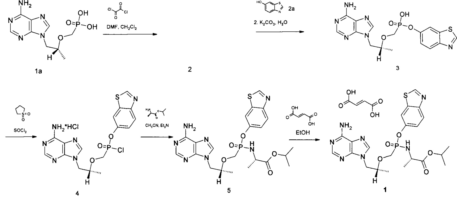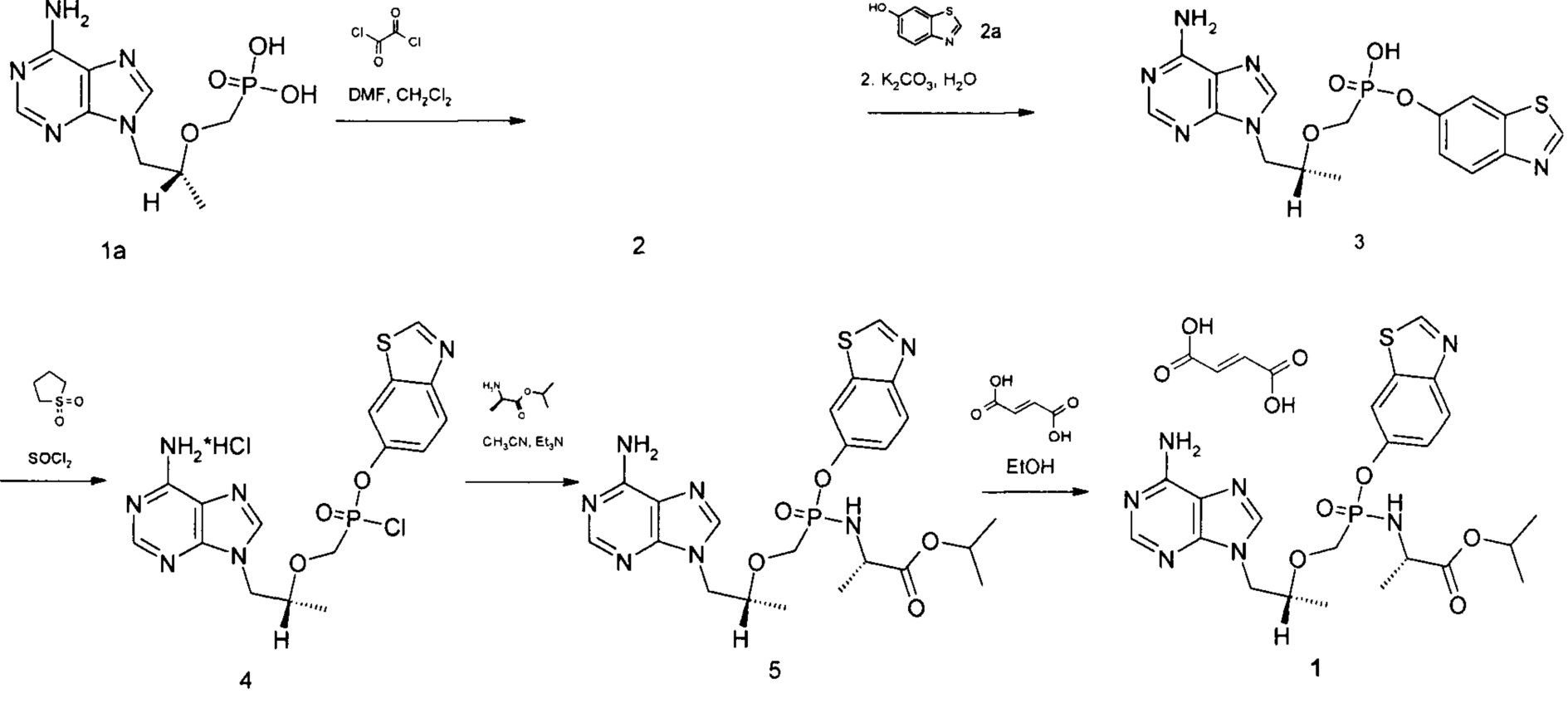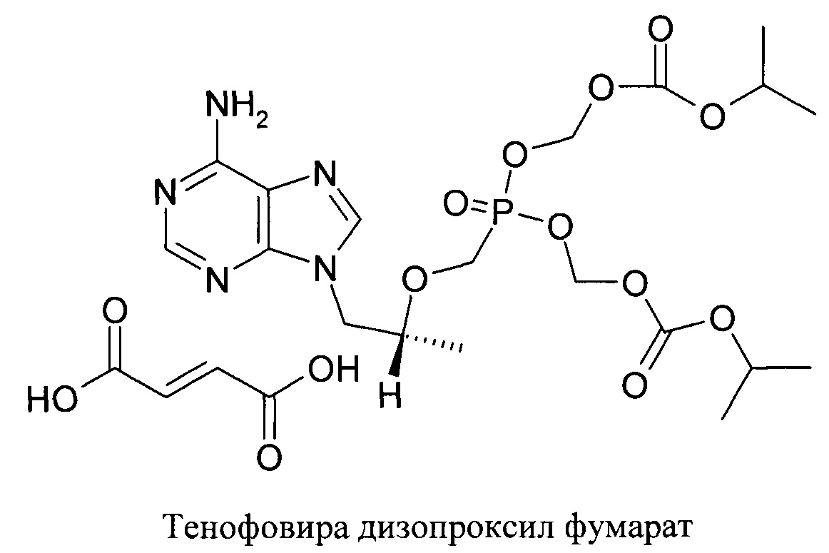 Настоящее изобретение относится к изопропил N-[{[(1R)-2-(6-амино-9H-пурин-9-ил)-1-метилэтокси]метил}(1,3-бензотиазол-6-ил-окси)фосфорил]-L-аланинат фумарату, а также его композициям, способам применения и получения. Это соединение и его композиции являются ингибиторами обратной транскиптазы и может использоваться при лечении вызываемых вирусами заболеваний, в частности гепатита Б. Известно, что соединение 9-(2-фосфонил-метоксипропил)аденин, содержащее нуклеозидный остаток, соединенный с остатком форсфорной кислоты, Тенофовир, обладает сильным ингибирующим действием на обратную транскриптазу. В то же время, в форме двузамещенной фосфорной кислоты Тенофовир обладает нулевой биодоступностью при пероральном применении. Были предложены различные пролекарственные формы Тенофовира, в частности Тенофовир дизопроксил фумарат, обладающие хорошей биодоступностью при пероральном применении и высвобождающие незамещенный 9-(2-фосфонил-метоксипропил)аденин в результате метаболизма, преимущественно в печени. 9-(2-Фосфонил-метоксипропил)аденин после высвобождения подвергается фосфорилированию и переходит в активные формы ди- и трифосфата Тенофовира. Заявители внезапно обнаружили, что смешанный эфиро-амид Тенофовира - изопропил N-[{[(1R)-2-(6-амино-9H-пурин-9-ил)-1-метилэтокси]метил}(1,3-бензотиазол-6-ил-окси)фосфорил]-L-аланинат в виде соли - фумарата, соединение формулы 1, является эффективным пролекарством Тенофовира и способен подавлять вирус гепатита Б в ин-виво модели заболевания гепатита Б в утках. Ниже приведены определения терминов, которые использованы в описании этого изобретения. «Лекарственное средство (препарат)» - вещество (или смесь веществ в виде фармацевтической композиции) в виде таблеток, капсул, инъекций, мазей и других готовых форм, предназначенное для восстановления, исправления или изменения физиологических функций у человека и животных, а также для лечения и профилактики болезней, диагностики, анестезии, контрацепции, косметологии и прочего. «Фармацевтическая композиция» обозначает композицию, включающую в себя активный компонент и, по крайней мере, один из компонентов, выбранных из группы, состоящей из фармацевтически приемлимых и фармакологически совместимых наполнителей, растворителей, разбавителей, носителей, вспомогательных, распределяющих и воспринимающих средств, средств доставки, таких как консерванты, стабилизаторы, наполнители, измельчители, увлажнители, эмульгаторы, суспендирующие агенты, загустители, подсластители, отдушки, ароматизаторы, антибактериальные агенты, фунгициды, лубриканты, регуляторы пролонгированной доставки, выбор и соотношение которых зависит от природы и способа назначения и дозировки. Примерами суспендирующих агентов являются этоксилированный изостеариловый спирт, полиоксиэтилен, сорбитол и сорбитовый эфир, микрокристаллическая целлюлоза, метагидроксид алюминия, бентонит, агар-агар и трагакант, а также смеси этих веществ. Защита от действия микроорганизмов может быть обеспечена с помощью разнообразных антибактериальных и противогрибковых агентов, например, таких как, парабены, хлорбутанол, сорбиновая кислота и подобные им соединения. Композиция может включать также изотонические агенты, например сахара, хлористый натрий и им подобные. Пролонгированное действие композиции м