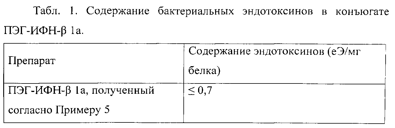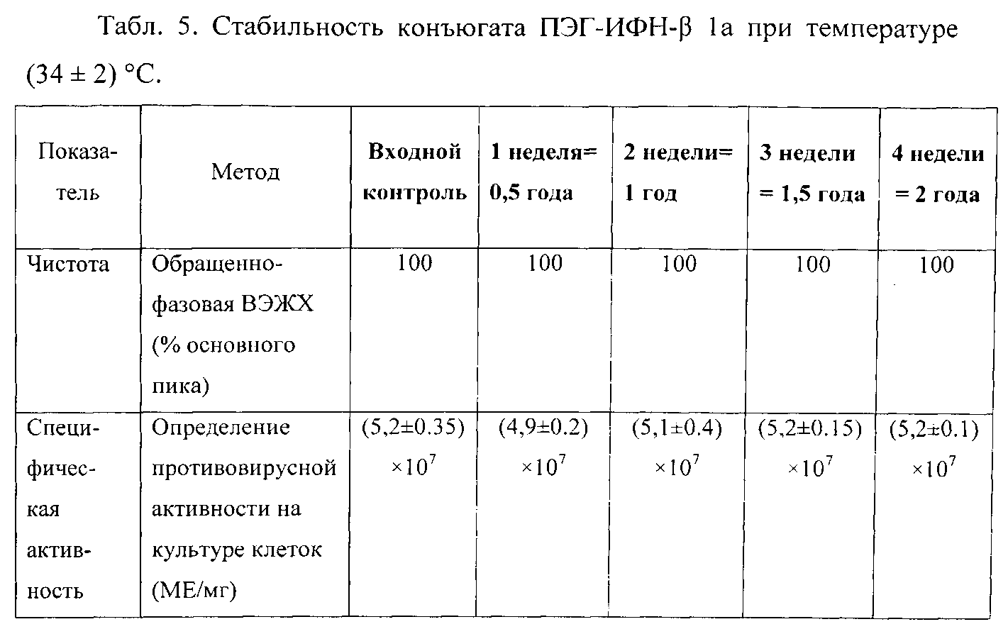 ЭДТА0,01-0,1 мг 0,01-0,1 мг динатриевая соль Вода для инъекций 1,0 мл (Б) ПЭГ-ИФН-β-1a 10-500 мкг по Примеру 5 Натрий ацетат тригидрат 1-5 мг Уксусная кислота ледяная до pH 5,0 Маннитол 50 мг Полисорбат 20 0,01-0,1 мг ЭДТА 0,01-0,1 мг динатриевая соль Вода для инъекций 1,0 мл (B) ПЭГ-ИФН-β-1a 10-500 мкг по Примеру 5 Натрий ацетат тригидрат 1-5 мг Уксусная кислота ледяная до pH 5,0 Маннитол 50 мг Полисорбат 80 0,01-0,1 мг ЭДТА 0,01-0,1 мг динатриевая соль Вода для инъекций 1,0 мл (Г) ПЭГ-ИФН-β-1a 10-500 мкг по Примеру 5 Натрий ацетат 0,4-2,0 мг Уксусная кислота до pH 5,5 Сорбитол 50 мг Декстран 15-30 мг Полисорбат 80 0,01-0,1 мг ЭДТА 0,01-0,1 динатриевая соль Вода для инъекций 1,0 мл (Д) ПЭГ-ИФН-β-1a 10-500 мкг по Примеру 5 Натрий ацетат 0,4-2,0 мг Уксусная кислота до pH 5,5 Маннитол 50 мг Альбумин 10-12,5 мг человеческий Полисорбат 80 0,01-0,1 мг ЭДТА 0,01-0,1 динатриевая соль Вода для инъекций 1,0 мл (E) ПЭГ-ИФН-β-1a 10-500 мкг по Примеру 5 Натрий ацетат 0,4-2,0 мг Уксусная кислота до pH 5,5 Маннитол 50 мг Глицин 3-12,5 мг Полисорбат 80 0,01-0,1 мг ЭДТА 0,01-0,1 динатриевая соль Вода для инъекций 1,0 мл (Ж) ПЭГ-ИФН-β-1a 10-500 мкг по Примеру 5 Натрий ацетат 0,4-2,0 мг Уксусная кислота до pH 5,5 Маннитол 50 мг Глютамин 10-12,5 мг Полисорбат 80 0,01-0,1 мг ЭДТА 0,01-0,1 динатриевая соль Вода для инъекций 1,0 мл (З) ПЭГ-ИФН-β-1a 10-500 мкг по Примеру 5 Натрий ацетат 0,4-2,0 мг Уксусная кислота до pH 5,5 Маннитол 50 мг Аспарагин 10-12,5 мг Полисорбат 80 0,01-0,1 мг ЭДТА 0,01-0,1 динатриевая соль Вода для инъекций 1,0 мл (И) ПЭГ-ИФН-β-1a 10-500 мкг по Примеру 5 Натрий ацетат 0,4-2,0 мг Уксусная кислота до pH 5,5 Маннитол 50 мг Метионин 3-10 мг Полисорбат 80 0,01-0,1 мг ЭДТА 0,01-0,1 динатриевая соль Вода для инъекций 1,0 мл
