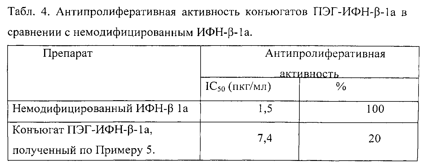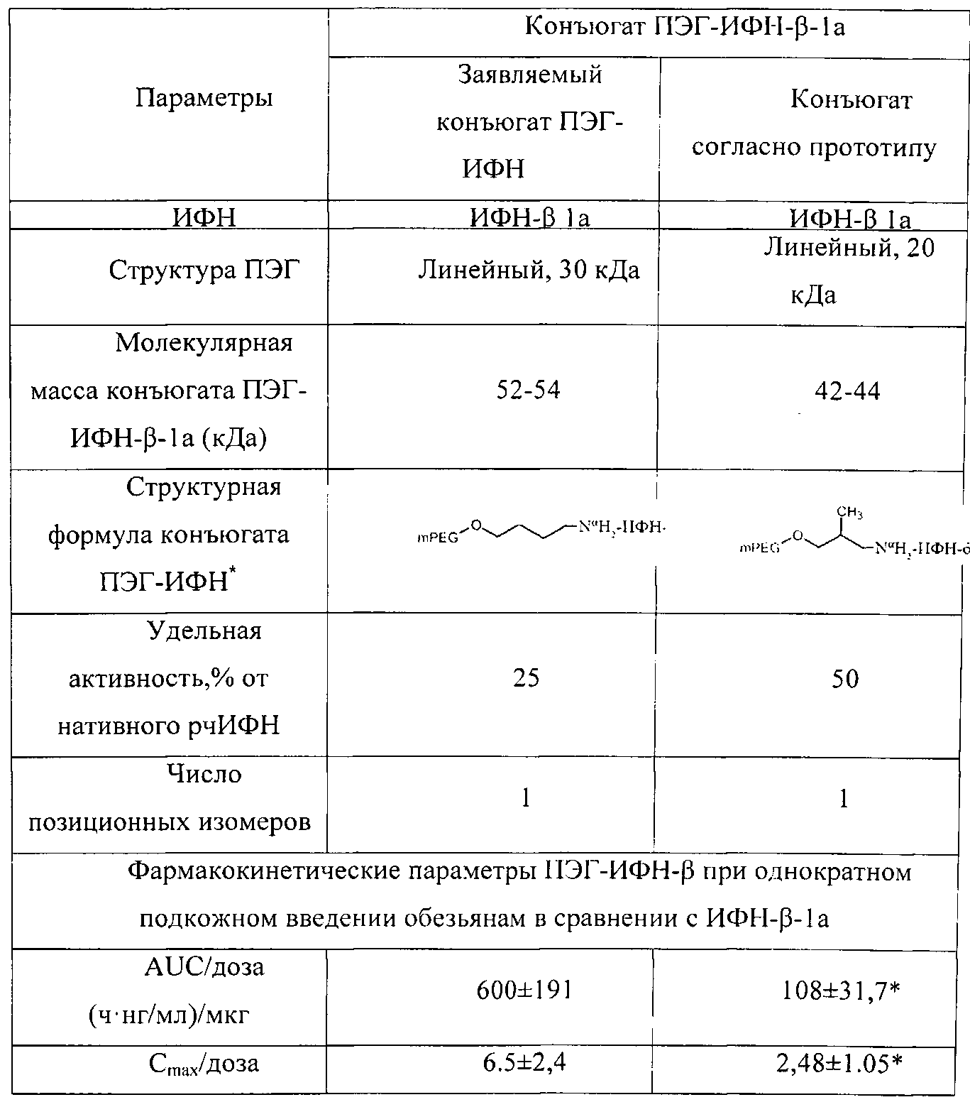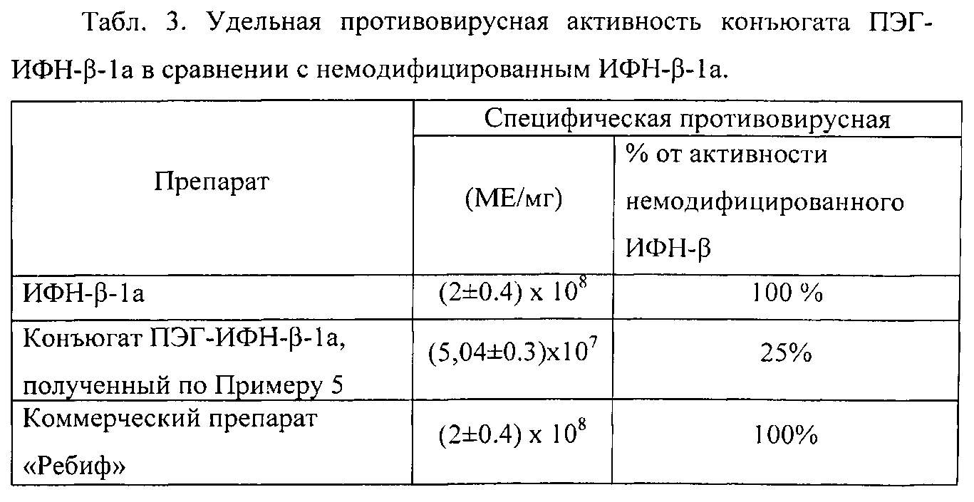 Настоящее изобретение относится к фармацевтике и медицине, а именно к новым биологически активным конъюгатам интерферона-β, в частности к новым конъюгатам интерферона-β-1a с полиэтиленгликолем, которые могут быть использованы в медицине, например, для лечения вирусных, иммунных и онкологических заболеваний. Интерферон β (ИФН-β) человека является терапевтическим цитокином, нашедшим широкое применение в медицине (Pozzilli et al., 2006). Механизм действия ИФН-β до настоящего времени изучен не полностью, однако известно, что в реализации биологического действия ИФН-β участвуют различные молекулярные механизмы. После взаимодействия ИФН с рецепторами, расположенными на поверхности клеток, происходит передача сигнала и инициируется каскад синтеза более 100 различных внутриклеточных белков (Der et al., 1998), опосредующих противовирусное, иммуномодулирующее и антипролиферативное действие ИФН-β (Pestka et al., 2004; Bekisz, 2004). Предполагается, что ИФН-β выступает антагонистом по отношению к ИФН-гамма и другим противовоспалительным цитокинам (например, к интерлейкину-1α и к ФНО - фактору некроза опухолей) и способен снижать активность Т-клеток. Противовоспалительные цитокины и активированные Т-клетки являются медиаторами воспаления и деструкции тканей при ряде заболеваний. Широкий спектр биологической активности является основанием для терапевтического использования ИФН в лечении ряда вирусных, онкологических и аутоиммунных заболеваний. В клинической практике ИФН-β в основном используется для лечения рассеянного склероза (Pozzilli et al., 2006), однако препараты на основе ИФН-β могут быть также использованы при локальном лечении различных опухолей, включая карциномы головы и шеи (Steuer et al., 1992), остроконечные кондиломы (Dinsmore et al., 1998) и злокачественные меланомы (Paul et al., 2003). В качестве противовирусной терапии препараты на основе ИФН-β в ряде случаев используются для лечения вирусного гепатита в виде монотерапии или в комбинации с ИФН-α2 (Montalto et al., 1998; Pellicano et al., 2005) В настоящее время в клинике используются две формы рекомбинантного ИФН-β: ИФН-β-1a и ИФН-β-1b. ИФН-β-1a получают из клеток млекопитающих, его аминокислотная последовательность (166 аминокислот) и физико-химические свойства идентичны природному ИФН-β человека. ИФН-β-1b получают из клеток Е. coli, он негликозилирован, состоит из 165 аминокислотных остатка (в молекуле отсутствует N-концевой метионин) и содержит одну аминокислотную замену (цистеин в 17 положении заменен на серии). Удельная противовирусная активность in vitro ИФН-β-1b в 10 раз ниже, чем у ИФН-β-1a. Следует отметить, что терапевтическая эффективность препаратов на основе ИФН-β-1a ограничена быстрым всасыванием из подкожных тканей, большим объемом распределения, относительно низкой стабильностью, коротким периодом полувыведения, высокой иммуногенностью и токсичностью. В результате, в течение нескольких часов после введения наблюдается быстрое падение концентрации интерферона в плазме крови, при этом интерферон не определяется в плазме уже через 24 ч после инъекции (Salmon et al., 1996). Для достижения эффективных терапевтических концентраций в плазме крови возникает необходимость частых введений препаратов, что приводит к возникновению дозозависимых побочных эффектов. Терапевтическая эффективность интерферонов может быть повышена при использовании препаратов про