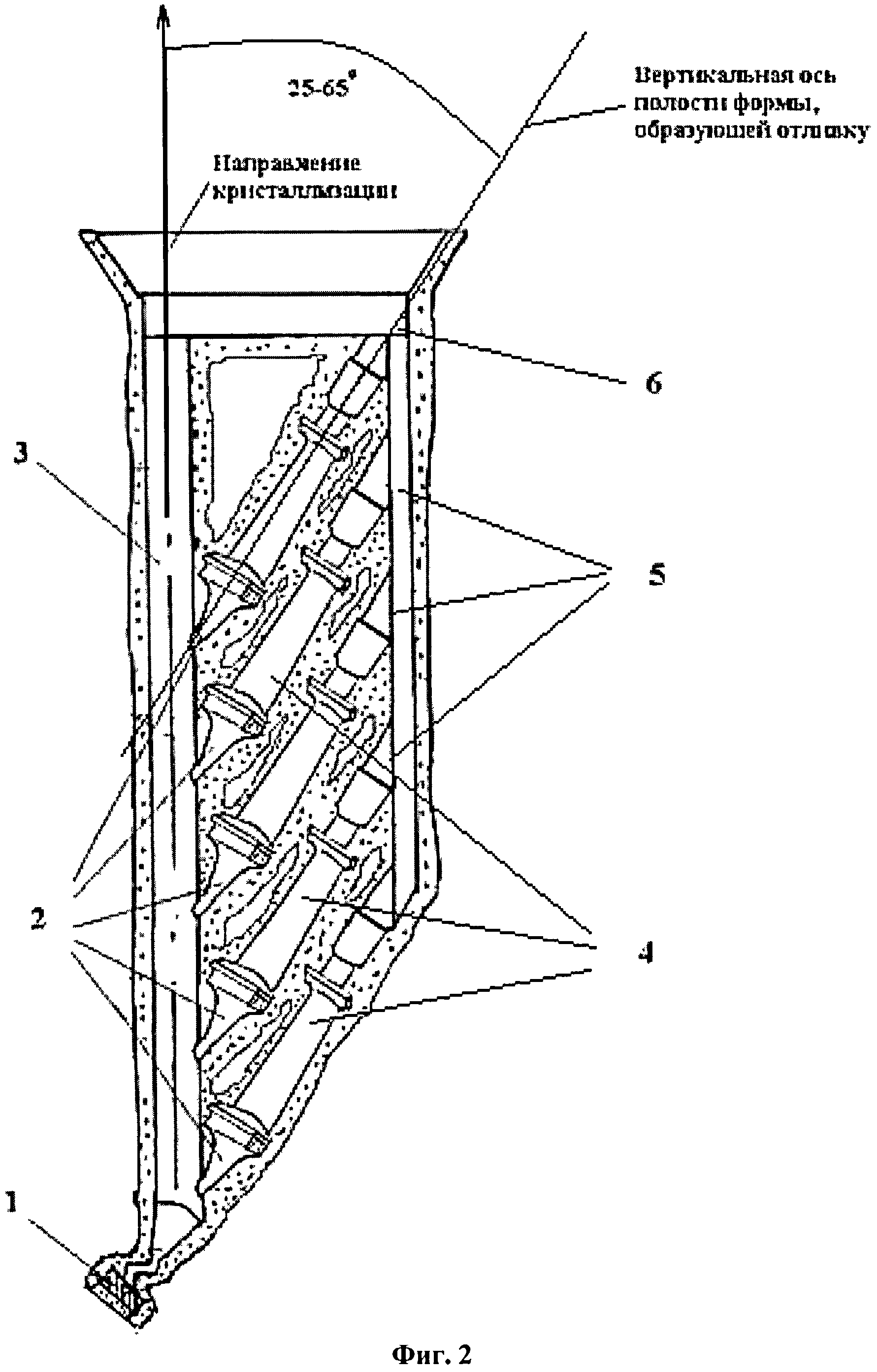 1. Устройство для получения отливки турбинной лопатки с монокристаллической структурой заданной кристаллографической ориентации, содержащее керамическую форму, в которой выполнены последовательно расположенные по направлению кристаллизации затравочная полость с размещенной в ней монокристаллической затравкой, коническая стартовая полость, соединенная с полостью формы, образующей отливку, выполненной под углом к направлению кристаллизации отливки, литниковые ходы и прибыльная часть, отличающееся тем, что в керамической форме выполнены расположенная по направлению кристаллизации общая стартовая полость, соединенная с затравочной полостью, по меньшей мере одна дополнительная коническая стартовая полость и по меньшей мере одна дополнительная полость формы, образующая отливку, при этом полости форм, образующие отливки, расположены параллельно друг над другом с наклоном вертикальной оси полости формы, образующей отливку, к направлению кристаллизации под углом 25-65°, каждая коническая стартовая полость соединена с общей стартовой полостью, а каждая полость формы, образующая отливку, соединена по меньшей мере одним литниковым ходом с прибыльной частью керамической формы. 2. Устройство по п.1, отличающееся тем, что общая стартовая полость расположена вдоль направления кристаллизации.