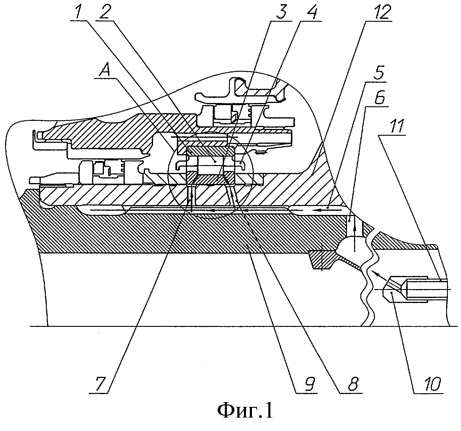 канавки 5, 6 и каналы 7 и 8 подвода масла, вал 9 турбины, форсунку 10, масляный коллектор 11, закрепленный на корпусе опоры турбины, и носок турбины 12. Во внутреннем кольце 3 подшипника дополнительно
