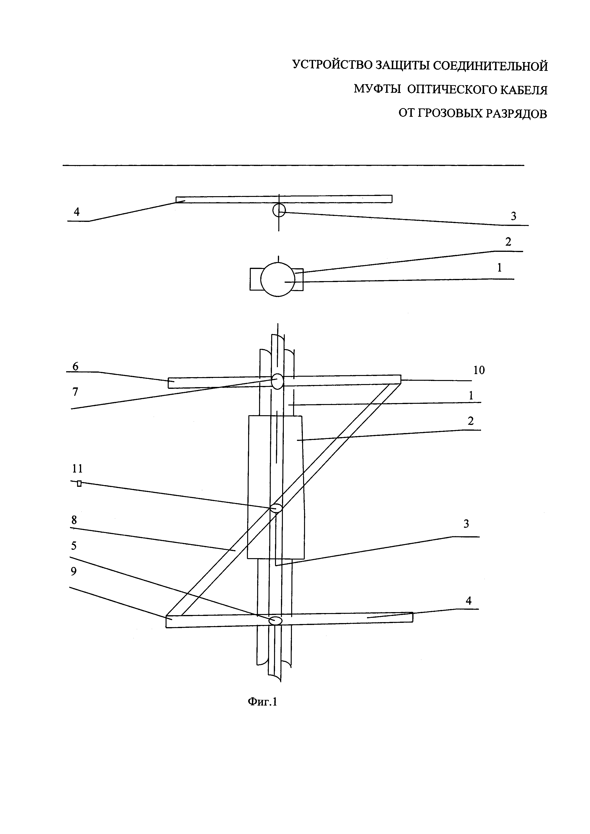 Устройство защиты оптического кабеля от грозовых разрядов, содержащее оптический кабель с металлическими элементами, строительные длины которого соединены с помощью соединительных муфт, грозозащитный трос, проложенный над ним на половине глубины прокладки оптического кабеля, ось которого совпадает в вертикальной плоскости с осью оптического кабеля, который в своей конструкции содержит металлические элементы, отличающийся тем, что с целью повышения эффективности защиты от грозовых разрядов оптического кабеля на грозозащитный трос в местах соединения строительных длин оптического кабеля с помощью соединительных муфт перпендикулярно трассе в горизонтальной плоскости на вводе и выводе оптического кабеля из соединительной муфты прокладывается линейный заземлитель, длина которого в каждую сторону от грозозащитного троса равна глубине прокладки кабеля, в месте пересечения грозозащитного троса с каждым линейным заземлителем осуществлен физический контакт, а соединение между линейными заземлителями и грозозащитным тросом обеспечивается соединением концов линейных заземлителей, находящихся с противоположных концов линейных заземлителей от троса, соединительным линейным заземлителем, причем контакт с тросом соединительного линейного заземлителя осуществляется в середине между линейными заземлителями.