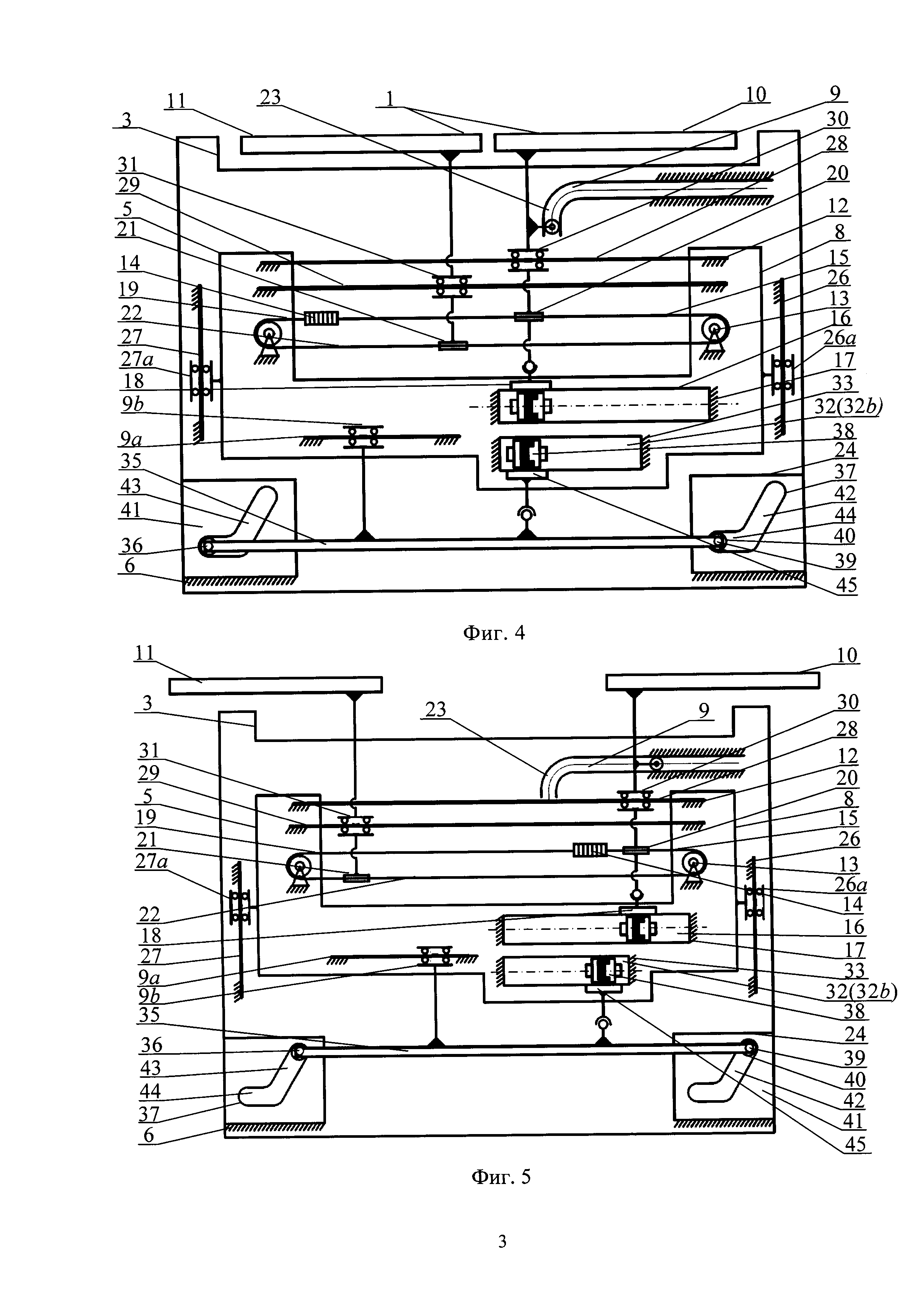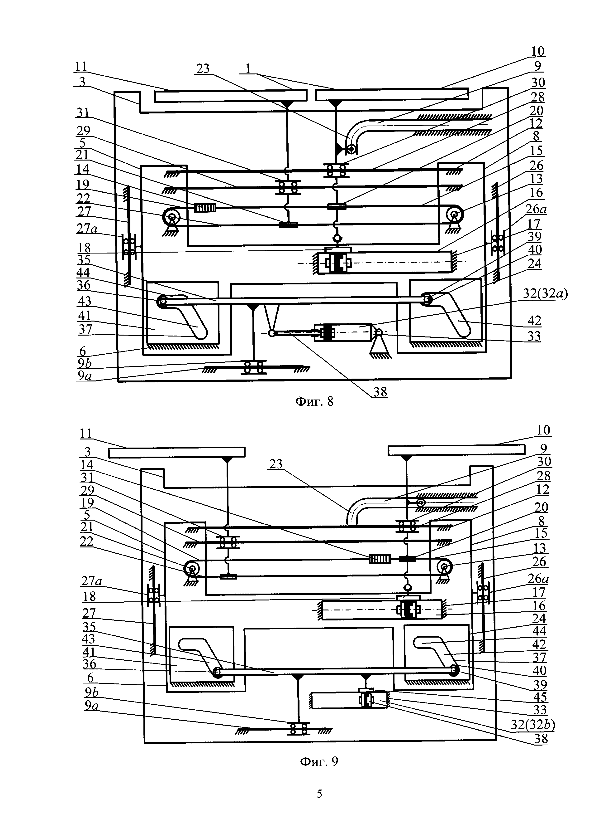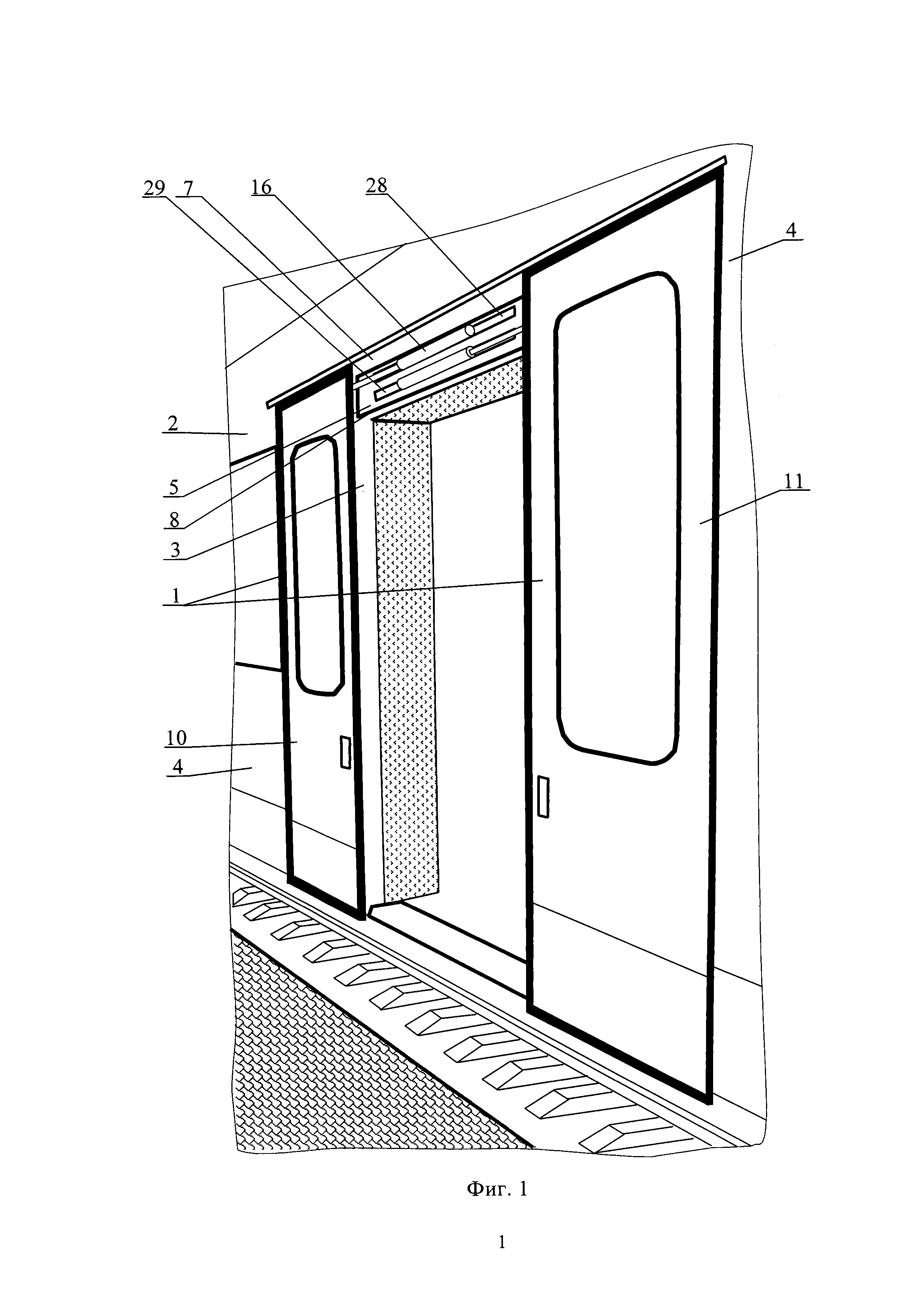 Изобретение относится к приводу дверей транспортных средств, в частности, к устройству привода прислонно-сдвижной двери пассажирского вагона. Известен механизм пневматического привода дверей транспортного средства (патент RU №2242377 от 21.11.2001 г.), содержащий: силовой блок с неподвижным основанием блока, закрепленным на верхней балке дверного проема, и подвижным блоком, имеющим Г-образные направляющие для движения прислонно-сдвижной двери, состоящей из двух створок, механизм привода открытия-закрытия створок двери, состоящий из установленной на подвижном блоке бесконечной цепной передачи с механизмом натяжения цепи, пневматического цилиндра привода цепи, неподвижная часть которого закреплена на подвижном блоке, а подвижная часть жестко соединена с одной из ветвей цепи, две каретки, закрепленные на створках двери, жестко соединенные с верхней и нижней ветвями цепи, средство блокировки движения створок двери в их закрытом положении, механизм выдвижения подвижного блока относительно основания блока, закрепленные на основании направляющие для выдвижения подвижного блока относительно основания блока в направлении, перпендикулярном направляющим дверей и ползуны, установленные в направляющих, закрепленных на подвижном блоке. Недостаток конструкции данного устройства пневматического привода - в низкой надежности вследствие совмещения привода выдвижения подвижного блока из проема и открытия створок двери с помощью одного и того же цилиндра, а также в необходимости иметь двойную ременную или цепную передачу. Техническая задача, решаемая изобретением, - повышение надежности устройства пневматического привода прислонно-сдвижной двери пассажирского вагона. Техническая задача решена в устройстве пневматического привода прислонно-сдвижной двери пассажирского вагона с дверным проемом в боковой стенке, имеющем: силовой блок с неподвижным основанием блока, закрепленным на верхней балке дверного проема, и подвижным блоком, имеющим Г-образные направляющие для движения прислонно-сдвижной двери, состоящей из двух створок, механизм привода открытия-закрытия створок двери, состоящий из установленной на подвижном блоке бесконечной цепной передачи с механизмом натяжения цепи, и пневматического цилиндра привода цепи, неподвижная часть которого закреплена на подвижном блоке, а подвижная часть жестко соединена с одной из ветвей цепи, и верхней и нижней кареток, одна из которых закреплена на верхней, а другая - на нижней ветвях цепи, жестко соединенных с левой и правой створками двери, средство блокировки движения створок двери в их закрытом положении, механизм выдвижения подвижного блока относительно основания блока, имеющий клиновое исполнительное устройство; механизм синхронизации положения верха и низа створок двери при выдвижении подвижного блока; закрепленные на основании блока направляющие выдвижения подвижного блока с ползунами относительно основания блока в направлении, перпендикулярном прямолинейным направляющим створок двери; установленные на направляющих выдвижения подвижного блока ползуны, закрепленные на подвижном блоке, при этом механизм выдвижения подвижного блока состоит из пневмоцилиндра, корпус которого установлен параллельно плоскости створок двери; подвижная часть пневмоцилиндра соединен
