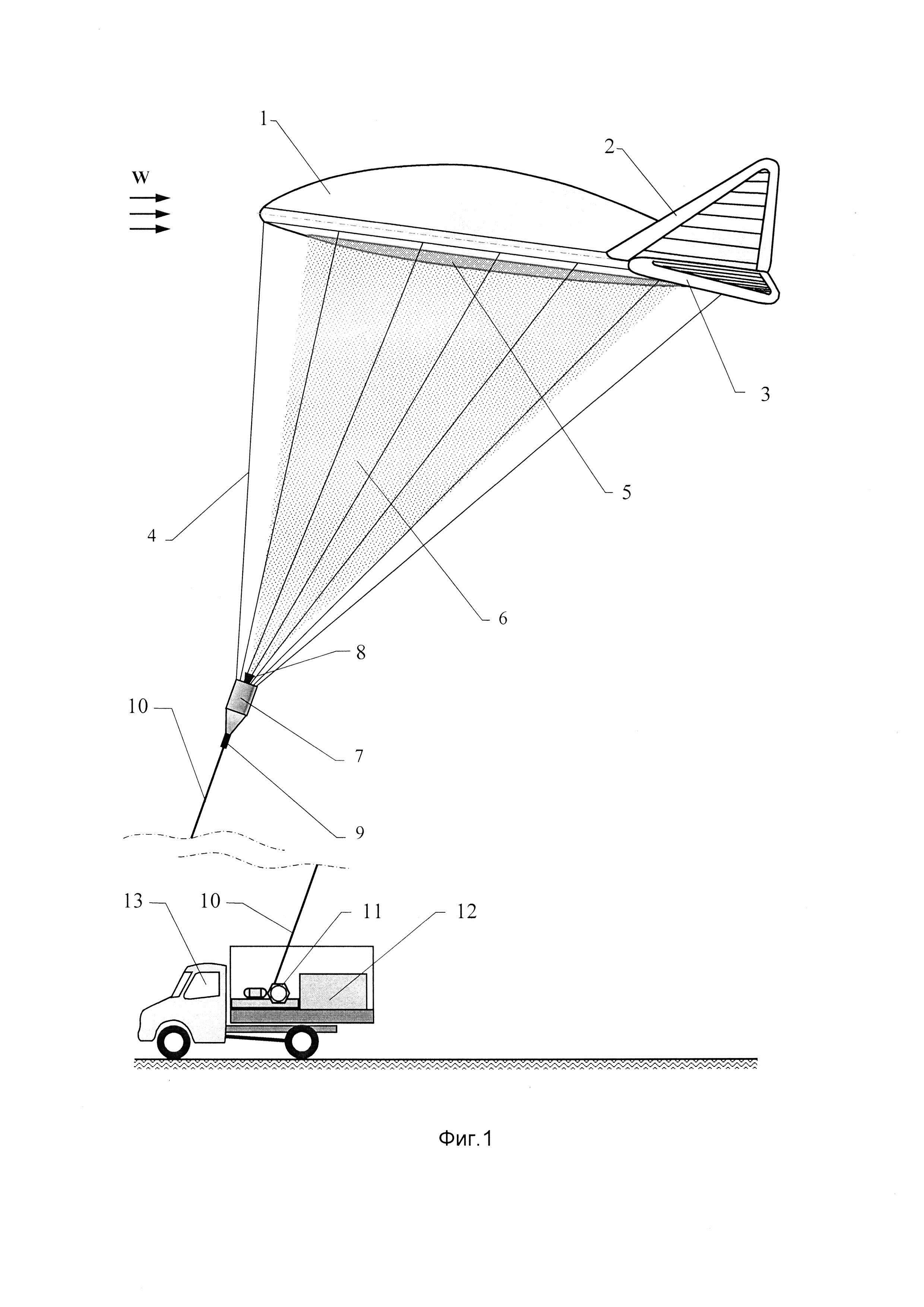 Изобретение относится к авиации, в частности к воздухоплаванию, а именно к устройству привязных аэростатов и к устройствам для рекламы, осуществляемой с помощью летательного аппарата, в частности аэростата В настоящее время производство рекламных аэростатов и дирижаблей связано с проблемой их одноразового использования, при котором аппарат, сделанный для одной фирмы после окончания рекламной кампании, списывается и продается по сниженной цене из-за невозможности перекрашивания под требования новой фирмы. При подвешивании разнообразных рекламных щитов под аппарат возрастает парусность сцепки, что в ряде случаев оказывается неприемлемым. Выход из этой проблемы многие производители технических средств рекламы видят в использовании поверхности баллона аэростатического летательного аппарата (АЛА) как экрана для проецирования на нее изображения заданной на данный момент рекламной кампании или показа фильмов. Конструкция такого АЛА в полной комплектации может включать: - проектор проекционного комплекса с экраном; - комплекс приема и передачи ТВ сигнала; - комплекс управляемых видеокамер; - программируемый проигрыватель изображения; - ретрансляторы сотовой связи; - элементы крепления к земле, если это привязной аэростат; - винтомоторные установки, если это дирижабль; - элементы радиоуправления, если это беспилотный АЛА. Дополнительно на аппарат могут быть установлены управляемые динамики, приборы для измерения параметров атмосферы и другое оборудование, для работы которого по назначению требуется подъем на высоту. АЛА, выполненный по полной схемеЮ может использоваться на крупных спортивных мероприятиях. Менее оснащенные подходят для всего спектра рекламного рынка. Использование в перечисленных целях специальных дирижаблей с проектором является наиболее затратным направлением и менее эффективно для зонального использования, т.к. все оборудование и системы, необходимые для управляемого полета, взлета и посадки размещаются непосредственно на борту. Наименее затратным, простым и надежным направлением является применение специально спроектированных привязных аэростатов с проектором. Привязные аэростаты включают корпус мягкой конструкции, узел привязи троса, такелаж и хвостовое оперение. Значительную часть аэростатической подъемной силы привязные аэростаты расходуют на подъем растущего с увеличением высоты веса привязного троса. Привязной трос, закрепленный одним концом в узле привязи аэростата, а другим в барабане наземной лебедки, является важным силовым элементом, удерживающим аэростат на заданной высоте стоянки в течение расчетного времени. Он позволяет также опускать аэростат на землю для транспортировки, обслуживания оборудования и пополнения бортовых запасов подъемного газа. Известен привязной аэростат по устройству полезной модели К.С. Быкова (патент RU №56699, 05.04.2006 г.), который содержит газонепроницаемую оболочку в виде перевернутой усеченной пирамиды, удерживаемую на рабочей высоте четырьмя привязными тросами. В качестве источника света, лучи которого проецируются на грани оболочки изнутри, используется галогенная лампа, а рекламный носитель выполнен за одно целое с оболочкой и размещен на ее внешних боковых поверхностях в виде отдельных деталей или в виде рекламных растяжек. Здесь масс