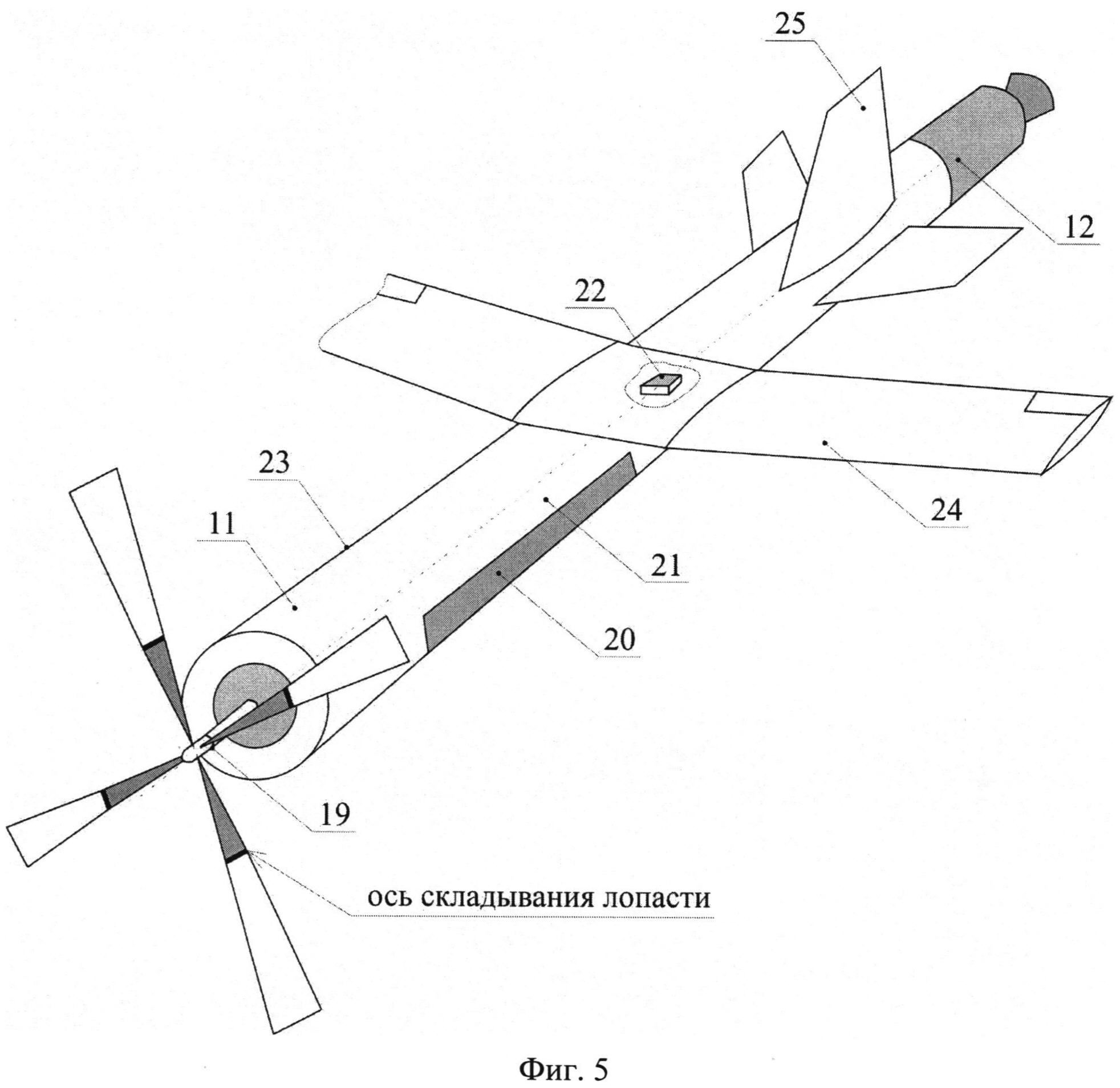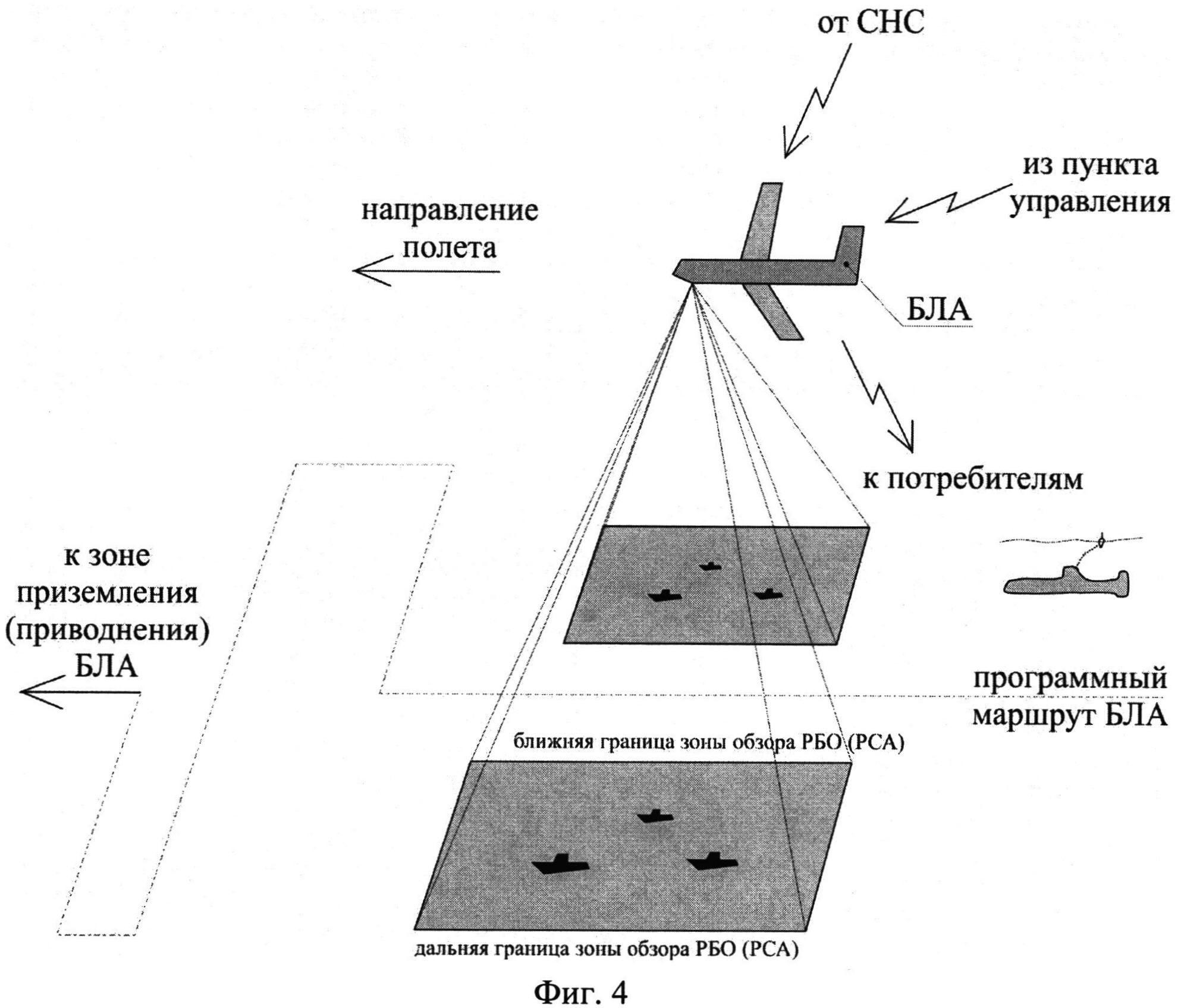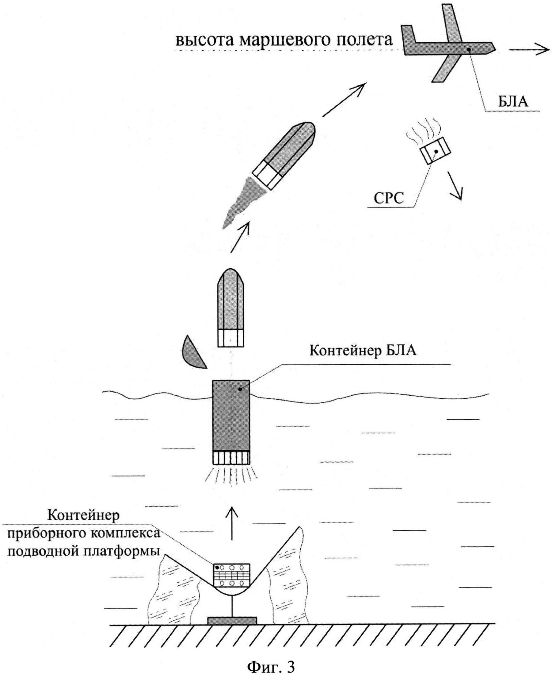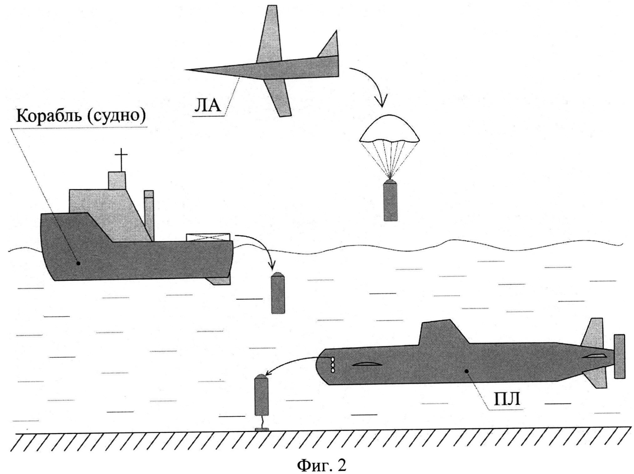 Изобретение относится к комплексам разведки морских надводных целей. Известны способы обнаружения морских надводных целей (кораблей, судов, стационарных и дрейфующих платформ и т.п.) посредством радиолокационных, оптических, акустических и иных сенсоров, установленных на берегу, а также на надводных и подводных платформах и летательных аппаратах (ЛА), в т.ч. космических - см., например, В. Вельцер «Аэроснимки в военном деле», М.: Воениздат, 1990, стр.17-24, 52-80, 236-241; И.В. Соловьев, Г.Н. Корольков, А.А. Бараненко и др. «Морская радиоэлектроника» под ред. В.А. Кравченко, СПб., Политехника, 2003, стр.10-29, 175-176. Известны также якорные и придонные (на коротком минрепе) мины с контейнером, внутри которого размещается торпеда. После установки мины на заданное углубление в работу включается дежурный пассивный акустический канал, контролирующий окружающее водное пространство. С обнаружением шумов дежурный канал включает активную акустическую систему, осуществляющую идентификацию объекта и определяющую ее координаты и направление движения. Эта информация передается в систему управления (СУ) торпеды, вырабатывается команда на ее старт. После выхода из контейнера торпеда осуществляет самостоятельный поиск цели собственными сенсорами и ее уничтожение - см., например, Ю.Л. Коршунов, Б.К. Лямин «Мины ВМФ СССР», СПб.: Гангут, 1998, стр.32. Ближайшим аналогом предлагаемого технического решения является способ обнаружения морских целей, реализованный в противолодочной мине Мк60 «Кэптор» (США) - см., например, А.Ф. Забнев «Торпедное оружие», М., Воениздат, 1984, стр.46; Л.П. Хияйнен «Развитие зарубежных подводных лодок и их тактики», М., Воениздат, 1988, стр.139, 225. Следует отметить, что пассивный сторожевой акустический канал мины «Кэптор» состоит из гидрофонов, счетно-решающей аппаратуры (СУ мины) и источников питания. Аппаратура СУ мины, обнаружив цель, определяет дистанцию до нее, классифицирует ее по принципу «свой»-«чужой» и обеспечивает пуск торпеды в направлении на цель. Заявляемый срок службы мины без подъема и ремонта 2…5 лет. Ведутся работы по увеличению глубины погружения контейнера до 800 м и увеличению радиуса реагирования мины. Однако ближайший аналог не обеспечивает возможностей поиска морских надводных целей и освещения надводной обстановки на пространствах в десятки/сотни квадратных километров, а также передачи данных о координатах цели внешним потребителям (например, в штабы и на ударные комплексы) в реальном масштабе времени. Целью предлагаемого изобретения является создание способа обнаружения морских надводных целей с трансляцией этих данных неограниченному количеству потребителей, основанного на технологиях автономной автоматической работы пассивных и активных сенсоров, размещаемых на стационарной подводной и подвижной воздушной платформах. Указанная цель достигается тем, что перед погружением платформы в воду на подвижный носитель вводят координаты точки погружения, платформу дополнительно снабжают устройствами радиоприема и звукоподводного приема сигналов пункта управления, в качестве подвижного носителя активного сенсора применяют беспилотный летательный аппарат (БЛА) самолетного типа со складным крылом и ракетной стартово-разгонной ступенью (СРС), при этом контейнер со сложенным внутри него БЛА отделяют от подводной платформы и