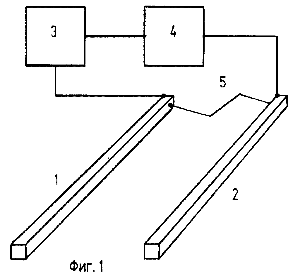 парой параллельных рельсов 1 и 2, изготовленных из материала с повышенным электрическим сопротивлением, входные концы которых подключены последовательно к внешней цепи, содержащей источник