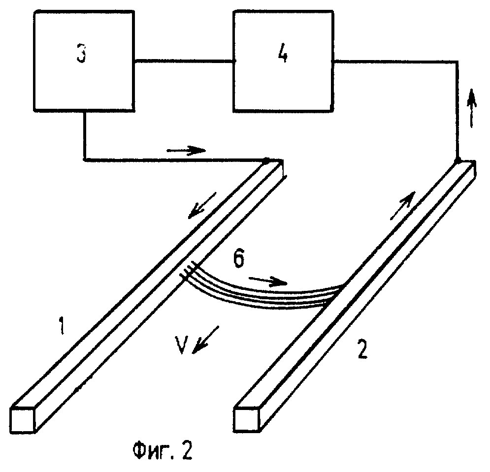 электрической энергии 3 и нагрузку 4. Вход рельсов шунтирован устройством для инициирования электрической дуги 5, а свободные концы замкнуты накоротко перемычкой 7. На фиг. 4 показана