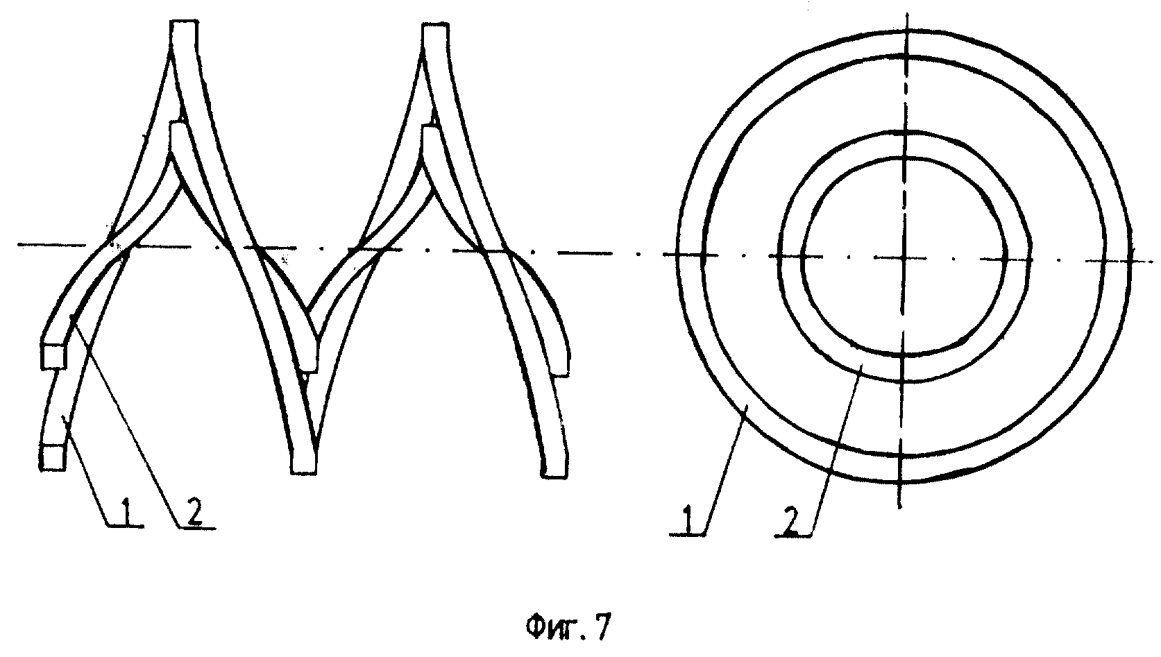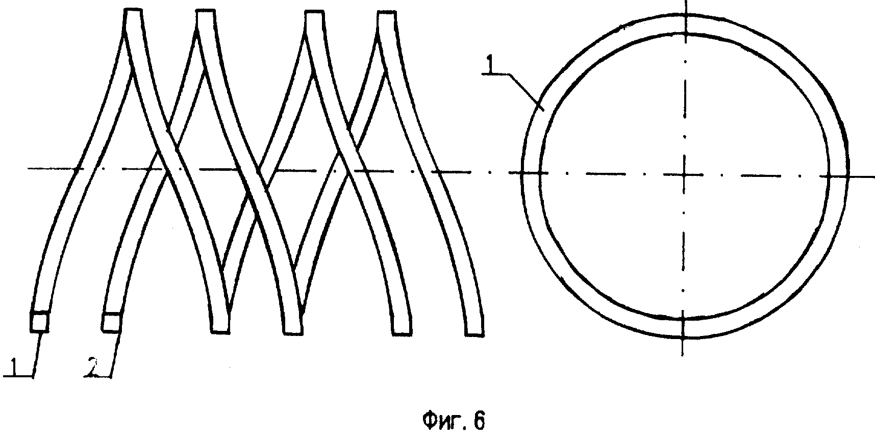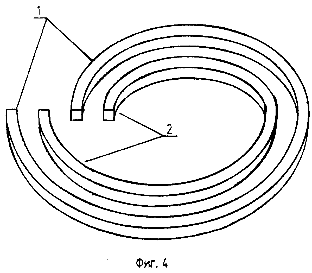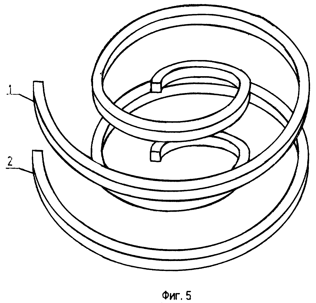 конструкция рельсов, в которой рельсы 1 и 2 свернуты в спираль, причем оба рельса 1 и 2 расположены в одной плоскости. На фиг. 5 показана конструкция рельсов, в которой рельсы 1 и 2