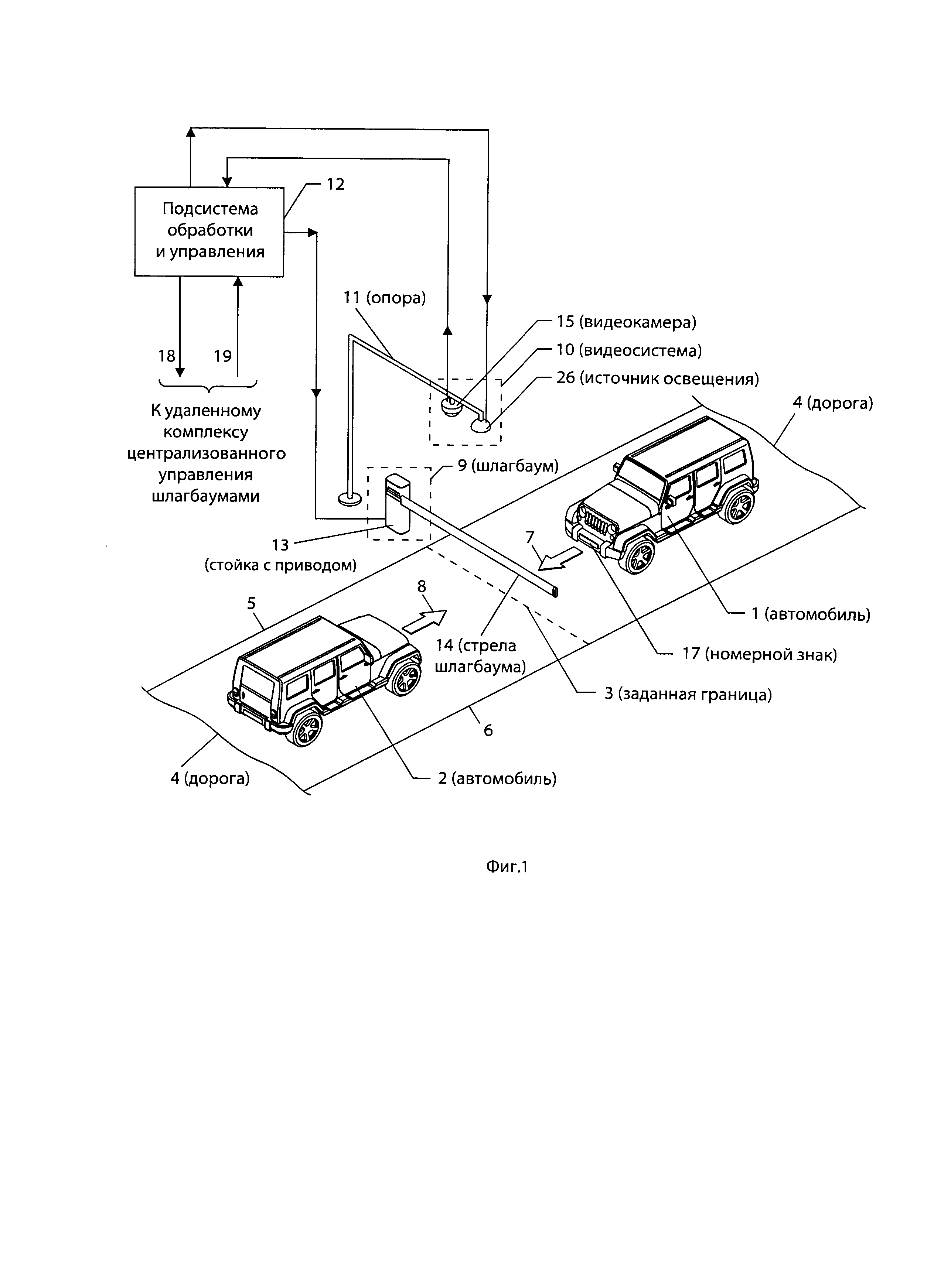 1. Способ управления пропуском автомобилей через заданную границу, находящуюся на их пути, при их движении в обоих направлениях, состоящий в том, что при помощи видеосистемы, ведущей наблюдение за движением автомобилей в обоих направлениях, до пересечения автомобилем этой границы получают изображение номерного знака этого автомобиля, являющегося кандидатом на это пересечение, затем при помощи узла обработки распознают регистрационный номер автомобиля, указанный на этом знаке, после чего формируют сигнал управления шлагбаумом, установленным на этой границе, для чего вычисляют критерий пропуска путем проведения сравнений полученного контролируемого регистрационного номера с контрольными номерами, хранимыми в базе данных, и подают блоку управления этим шлагбаумом сигнал управления, разрешающий пересечение автомобилем указанной границы, если его регистрационный номер удовлетворяет вычисленному критерию разрешения пропуска автомобиля, 2. Способ по п. 1, отличающийся тем, что предварительно перед началом работы задают автономный либо централизованный режим управления пропуском автомобилей через заданную границу, затем в централизованном режиме блокируют формирование сигнала управления шлагбаумом в указанном блоке обработки, передают полученный контролируемый регистрационный номер автомобиля из этого блока обработки в центральный комплекс управления шлагбаумами и принимают внешний сигнал управления шлагбаумом из этого комплекса в блок управления шлагбаума, установленного на указанной границе. 3. Способ по п. 1, отличающийся тем, что используют критерий разрешения пропуска автомобиля, который считается выполненным, если контролируемый номер не совпал ни с одним из запрещенных контрольных номеров, хранимых в базе данных. 4. Способ по п. 1, отличающийся тем, что используют критерий разрешения пропуска автомобиля, который считается выполненным, если контролируемый номер совпал с одним из разрешенных контрольных номеров, хранимых в базе данных. 5. Способ по п. 1, отличающийся тем, что при проверке контролируемого номера автомобиля, являющегося кандидатом на пересечение заданной границы в некотором направлении, в качестве разрешенных контрольных номеров используют номера автомобилей, ранее пересекших эту границу в обратном направлении. 6. Система управления пропуском автомобилей через заданную границу, находящуюся на их пути, при их движении в обоих направлениях, содержащая установленный на указанной границе шлагбаум с блоком управления, видеосистему для наблюдения за движением автомобилей в обоих направлениях и для получения изображения номерного знака автомобиля, являющегося кандидатом на пересечение этой границы, базу данных, хранящую контрольные номера автомобилей, соединенный с видеосистемой и блоком управления шлагбаумом узел обработки, который обеспечивает распознавание контролируемого регистрационного номера автомобиля, указанного на его номерном знаке, и формирование сигнала управления этим шлагбаумом, для чего вычисляет критерий разрешения пропуска путем проведения сравнений полученного контролируемого регистрационного номера с контрольными номерами, хранимыми в базе данных, и передает блоку управления шлагбаумом сформированный сигнала управления, разрешающий пересечение автомоб