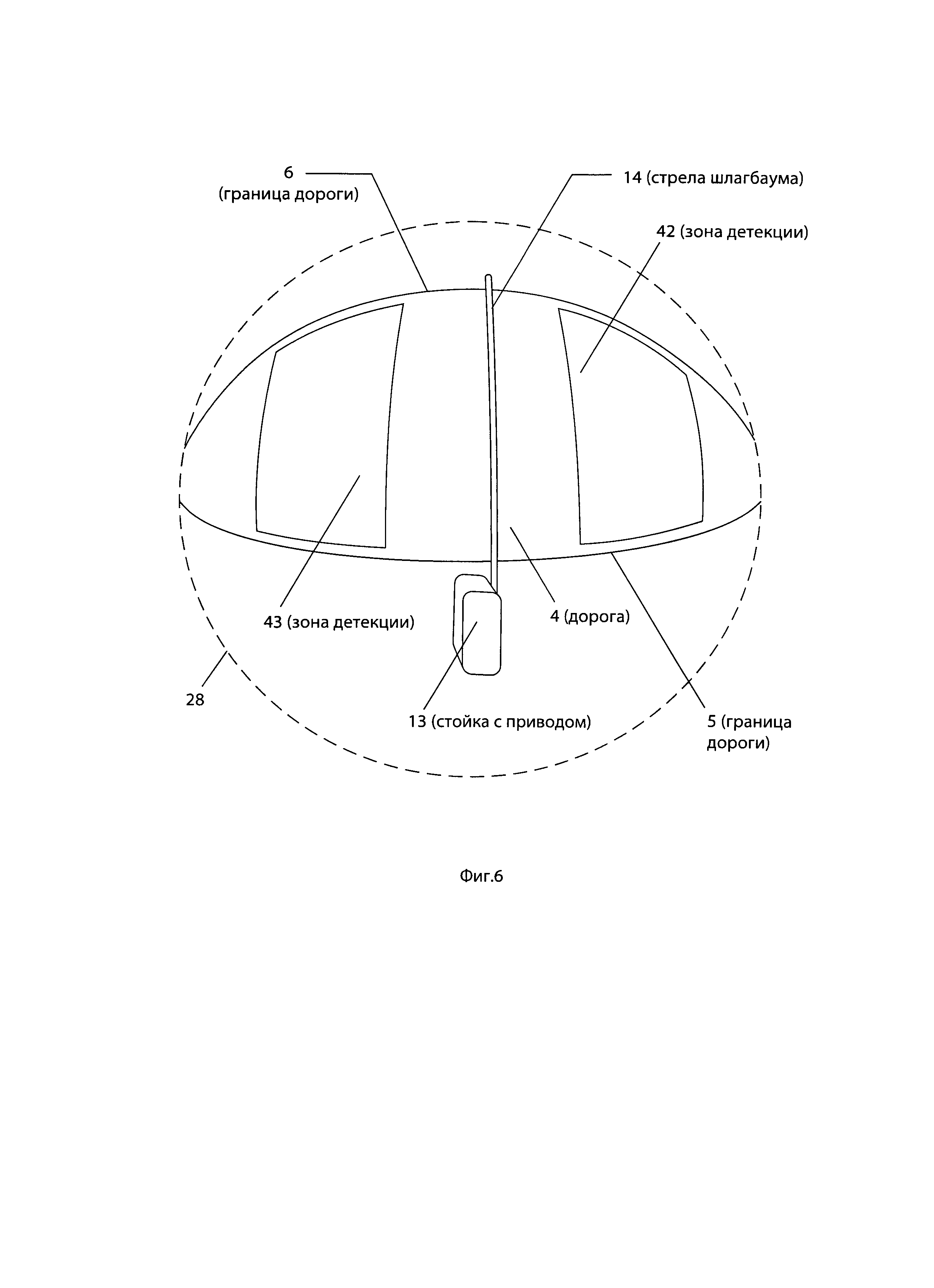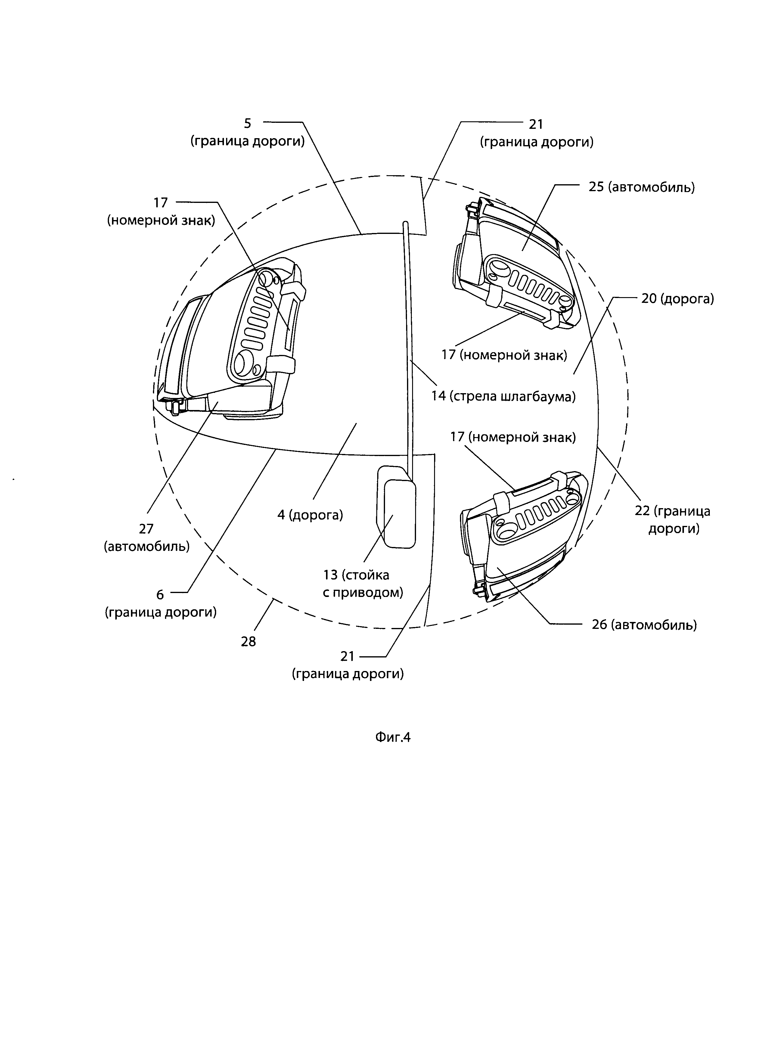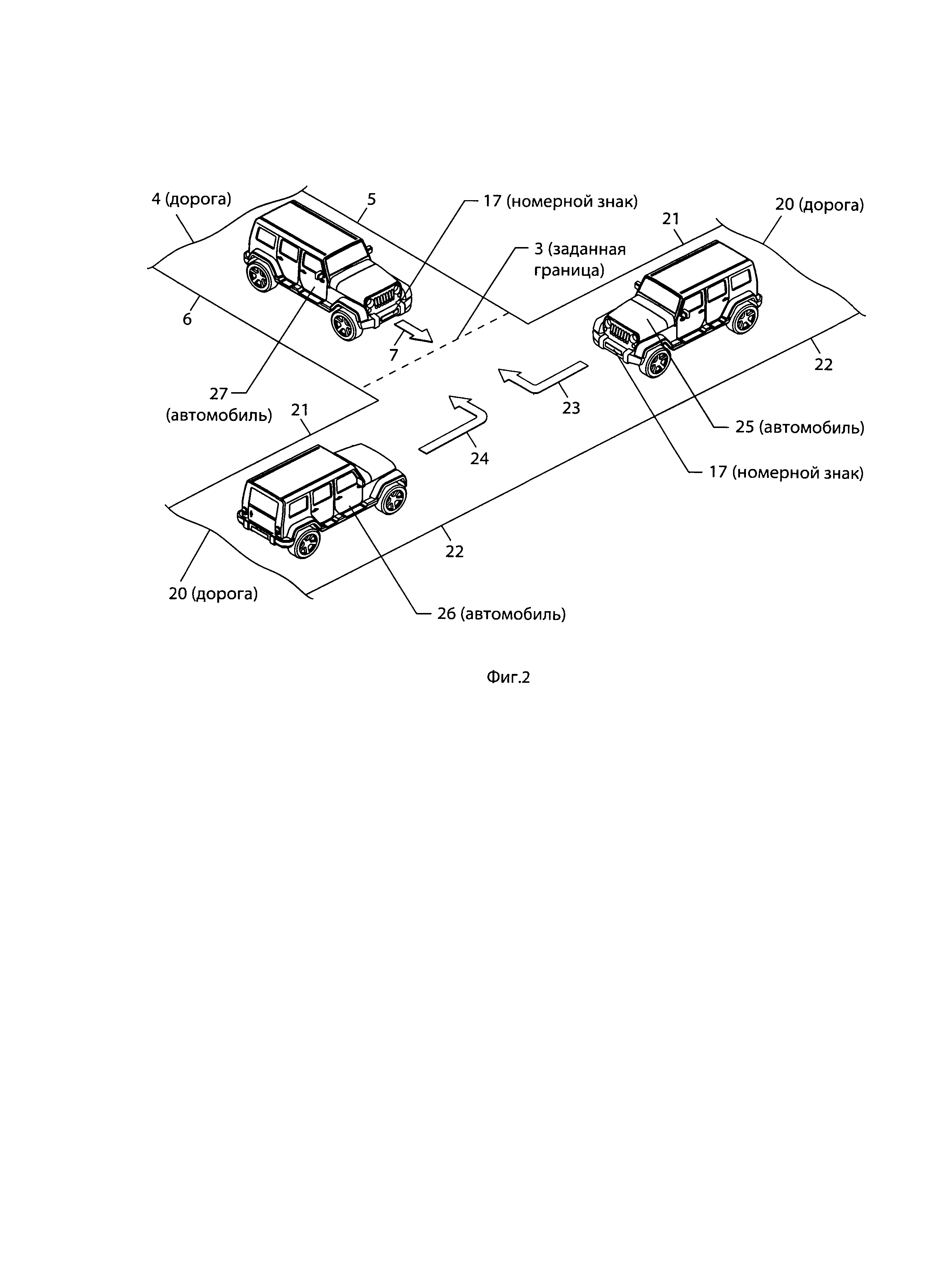 в ней указанная видеосистема содержит одну видеокамеру с объективом типа «рыбий глаз», которая установлена над указанной границей, пересекаемой автомобилями в обоих направлениях так, чтобы в сферическом изображении сцены на выходе этой видеокамеры находились одновременно заданные зоны, в которых появлялись бы номерные знаки автомобилей, пересекающих эту границу в противоположных направлениях, причем если номерные знаки этих автомобилей появляются в этих зонах одновременно, то очередность пересечения границы этими автомобилями обеспечена в указанном узле обработке, а в указанном узле обработки обеспечено преобразование сферического изображения заданных зон, полученного этой видеокамерой и содержащего номерной знак автомобиля, в плоское изображение и последующее использование его для распознавания регистрационного номера автомобиля, при этом узел обработки выполнен с возможностью подсоединения к нему вспомогательного процессора с дисплеем для предварительного задания на сферическом изображении сцены указанных зон, в которых может появляться номерной знак автомобиля.