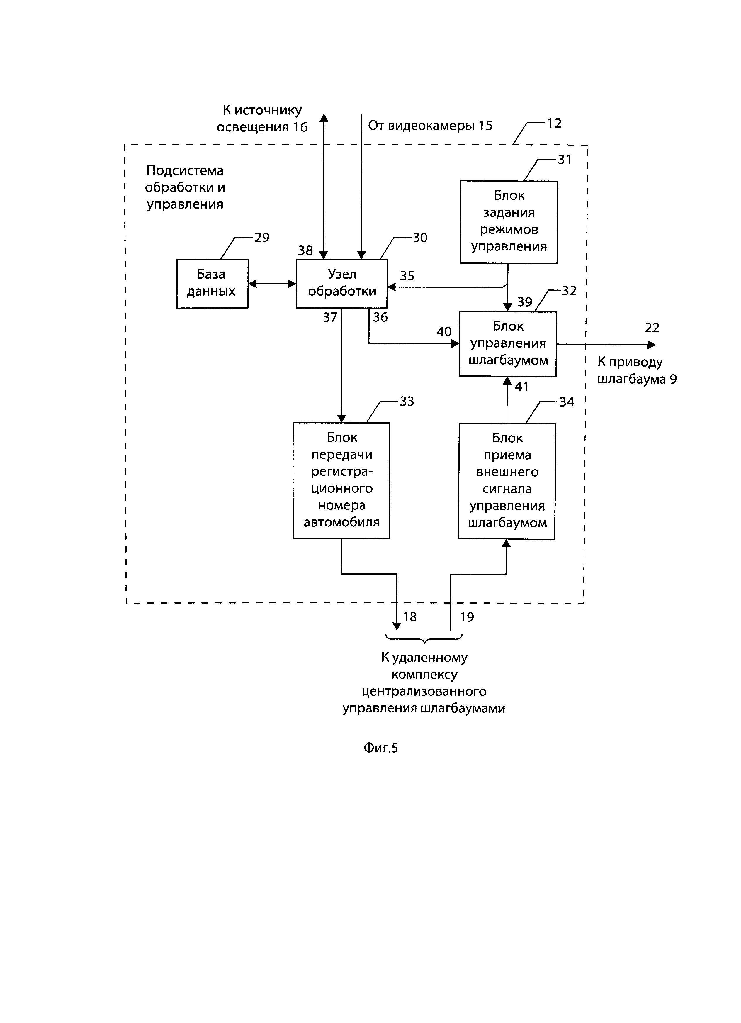 выход узла обработки, служащий для выдачи контролируемого регистрационного номера автомобиля, соединен с входом блока передачи этого регистрационного номера в указанный центральный комплекс, выход указанного блока приема соединен с информационным входом блока управления шлагбаумом, а в узле обработки обеспечена блокировка формирования сигнала управления указанным шлагбаумом.
