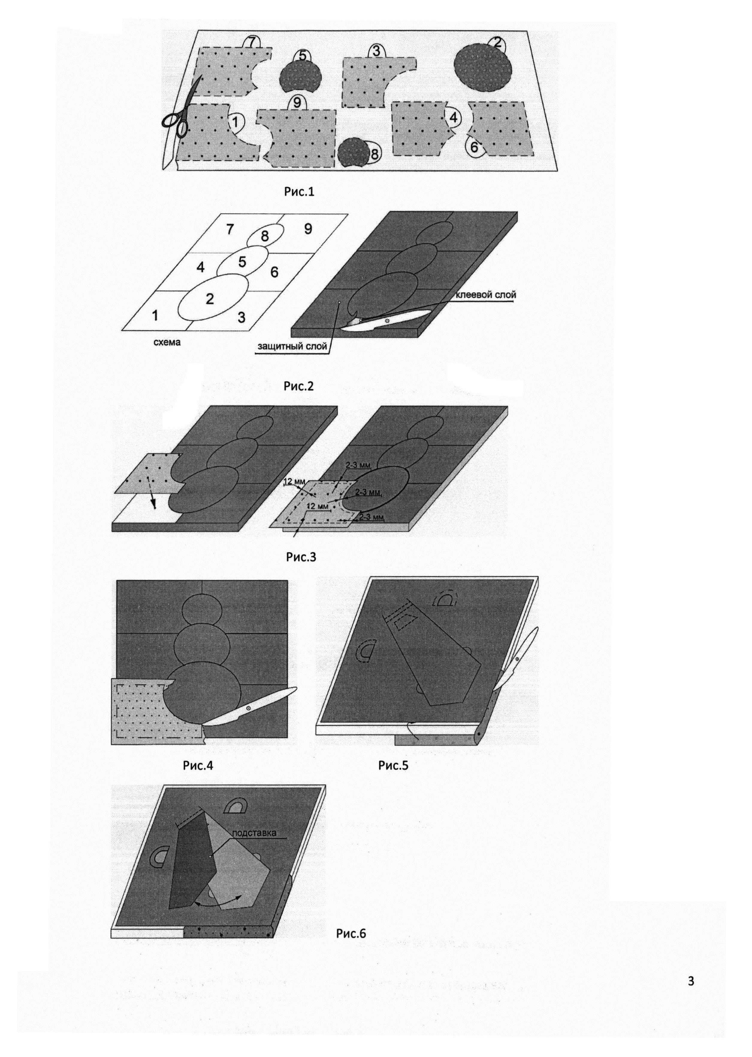 1. Способ изготовления декоративного изделия, по которому из ткани, на которой напечатаны линии, образующие замкнутые контуры, заполненные рисунком, необходимо вырезать детали; ориентируясь на номер детали на схеме, найти ее на основе; с основы, на верхний слой которой нанесен клеевой слой и прикрыт защитным слоем, а также на которой выполнены такие же линии, образующие замкнутые контуры, снять защитный слой; наложить вырезанную деталь на область с клеевым слоем так, чтобы края детали выходили за пределы области для фиксации; разгладить и зафиксировать ткань; плавными движениями заправить края детали в прорези основы, следуя контуру реза; повторить данные операции для каждой детали; после того как все детали будут закреплены в основу, перевернуть основу и заправить края боковых деталей под подложку. 2. Способ изготовления декоративного изделия по п. 1, характеризующийся тем, что фиксации ткани на основе с клеевым слоем необходимо провести стеком от центра деталей к краям. 3. Способ изготовления декоративного изделия по п. 1, характеризующийся тем, что для того, чтобы заправить края детали в основу, и для того, чтобы заправить края детали под подложку, необходимо использовать стек. 4. Способ изготовления декоративного изделия по п. 1, характеризующийся тем, что края детали должны выходить за пределы области для фиксации не менее чем на 1 мм, а по краям картины не менее чем на 8 мм. 5. Способ изготовления декоративного изделия по п. 1, характеризующийся тем, что основа может быть выполнена из пенокартона или любого другого вспененного материала, имеющего сверху твердое покрытие. 6. Способ изготовления декоративного изделия по п. 1, характеризующийся тем, что замкнутые контуры на основе вырезаются с помощью лазерного луча или ножа и их глубина составляет 0,4-0,6 от толщины основы, а ширина не более 0,5 мм. 7. Способ изготовления декоративного изделия по п. 1, характеризующийся тем, что толщина основы составляет 5-15 мм. 8. Способ изготовления декоративного изделия по п. 1, характеризующийся тем, что в качестве ткани используется микрофибра. 9. Способ изготовления декоративного изделия по п. 1, характеризующийся тем, что на ткани рядом с каждой фигурой (контуром) проставлен индивидуальный номер, соответствующий номеру детали на схеме. 10. Способ изготовления декоративного изделия по п. 1, характеризующийся тем, что контуры деталей нанесены на ткань с учетом припусков для фиксации деталей на основе 1-5 мм и на оформление (для деталей, которые располагаются по краю изделия) - минимум 8 мм. 11. Способ изготовления декоративного изделия по п. 1, характеризующийся тем, что к обратной стороне основы приклеена подложка, из которой можно выдавить подставку или крючки для фиксации готового изделия на стене. 12. Способ изготовления декоративного изделия по п. 1, характеризующийся тем, что после того, как все детали закреплены на основе, необходимо по краям картины заправить ткань с обратной стороны под подложку. 13. Способ изготовления декоративного изделия из ткани по п. 1, характеризующийся тем, что на основу, внутри каждого контура, нанесен порядковый номер, соответствующий номеру детали на ткани и на схеме.