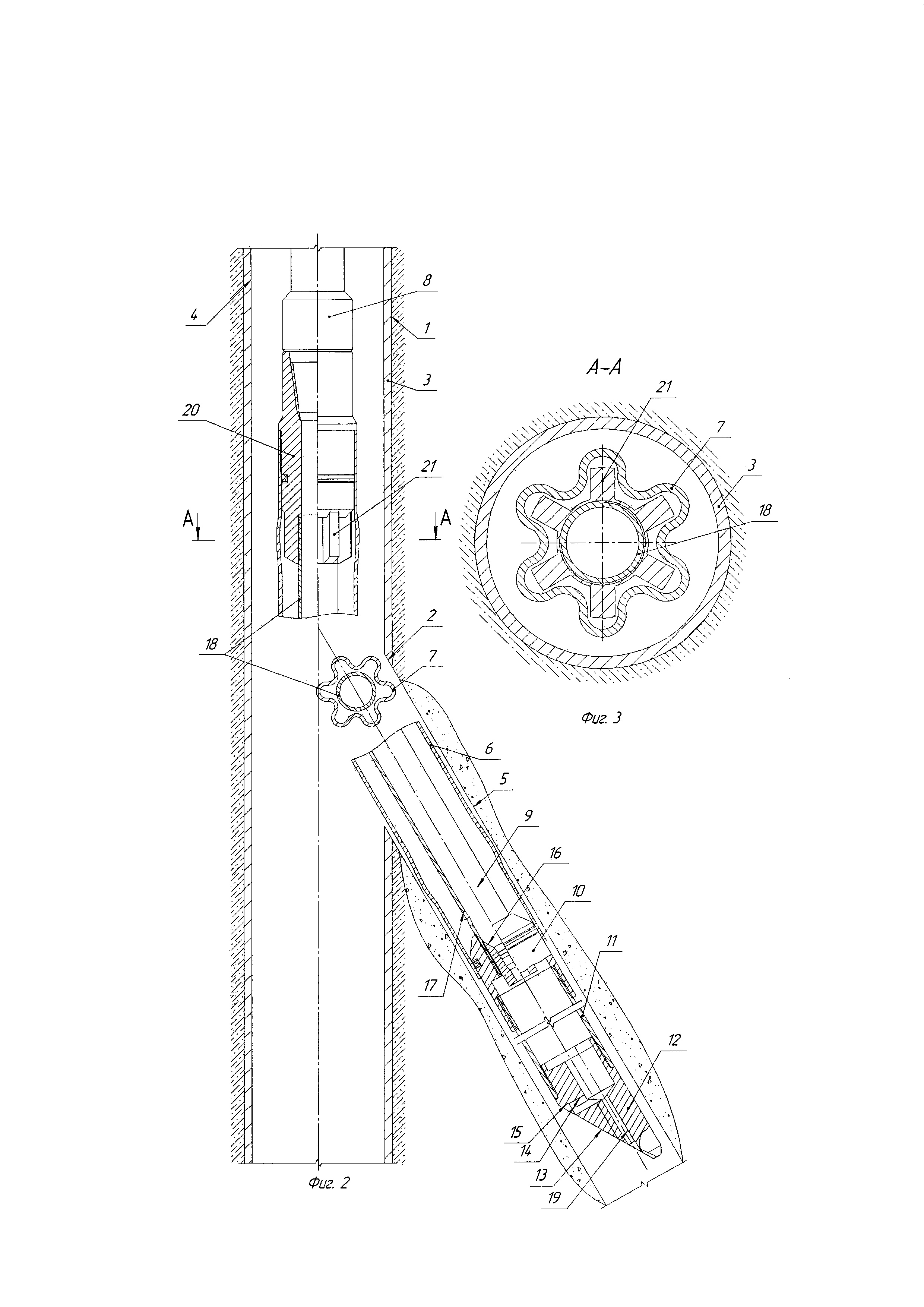 1. Способ строительства многоствольной скважины, включающий вскрытие окна в обсадной колонне первичного ствола скважины и бурение нового дополнительного ствола до проектной глубины с использованием извлекаемого клина-отклонителя, спуск хвостовика с обсадными трубами на устье нового дополнительного ствола скважины с последующей герметизацией дополнительного ствола скважины, обработку верхней части хвостовика для получения доступа в нижнюю часть первичного ствола, извлечение клина-отклонителя, причем внутренний диаметр обсадной колонны первичного ствола до спуска клина-отклонителя в зоне расположения окна и выше расширяют, клин-отклонитель с якорем извлекают до спуска хвостовика, который изготавливают в виде продольно-гофрированной трубы с увеличенным периметром в зоне расширения внутреннего диаметра обсадной колонны первичного ствола, хвостовик, спускаемый на колонне труб, размещают в дополнительном стволе при помощи прикрепленного снизу направляющего устройства, выправление гофрированных участков хвостовика осуществляют избыточным давлением с фиксацией развальцовыванием в дополнительном стволе, обработку верхней части хвостовика осуществляют в два этапа, на первом из которых производят вырезание направляющего окна в хвостовике для создания сообщения с первичным стволом, на втором - развальцовку верхней части хвостовика до прижатия его к расширению заподлицо к стенкам первичного ствола, отличающийся тем, что направляющий башмак вставлен в нижнюю часть хвостовика с возможностью герметичного продольного перемещения, хвостовик перед спуском оснащают изнутри с возможностью совместного вращения полой технологической колонной, сообщенной боковыми каналами с герметичной полостью хвостовика и соединенной снизу с направляющим башмаком, а сверху - с колонной труб, при этом ниже боковых каналов в технологической колонне размещают седло под бросовый с устья элемент, после сброса которого в скважину осуществляют выправление гофрированных участков хвостовика избыточным давлением с последующим отсоединением и извлечением направляющего башмака на поверхность. 2. Направляющее устройство для установки обсадной колонны в дополнительном стволе скважины, включающее направляющий башмак с цилиндрической частью и направляющей частью, оснащенной косым срезом, боковое отверстие с соплом для прохода жидкости со стороны среза, расположенные выше косого среза седло и боковые каналы, отличающееся тем, что цилиндрическая часть башмака герметично вставлена в нижнюю часть продольно-гофрированного хвостовика с возможностью продольного перемещения и жестко соединена внутри хвостовика с технологической колонной, направляющая часть оснащена продольным отверстием меньшего диаметра, чем диаметр бокового отверстия, седло расположено в нижней части технологической колонны под боковыми каналами, при этом технологическая колонна сверху снабжена переводником, соединенным герметично с верхней частью хвостовика с возможностью отсоединения после расширения, переводник снизу оснащен выступами, выполненными с возможностью взаимодействия для совместного вращения с продольно-гофрированной трубой хвостовика.