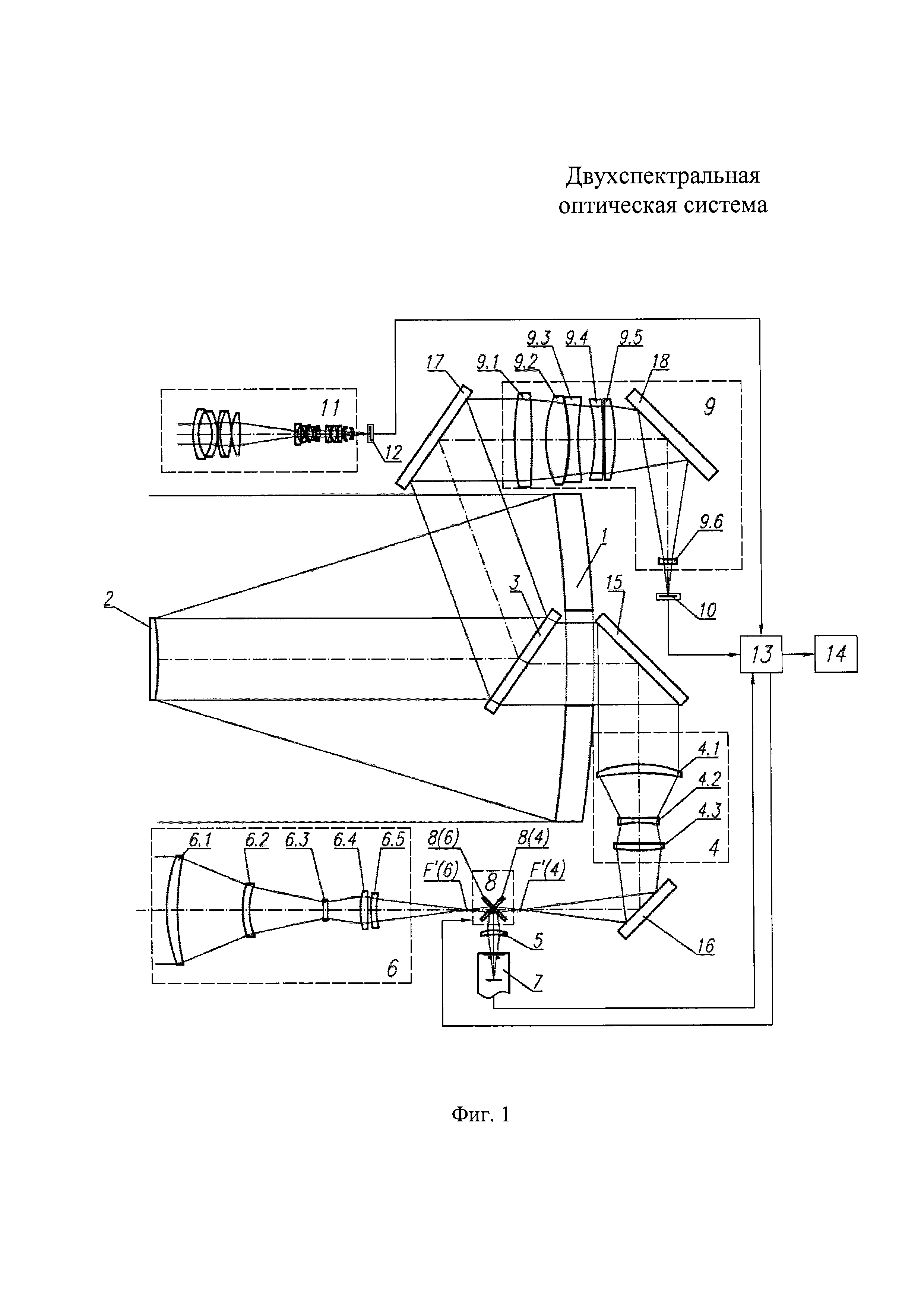 1. Двухспектральная оптическая система, содержащая расположенные по ходу лучей главное вогнутое асферическое зеркало с центральным отверстием, вторичное выпуклое асферическое зеркало, спектроделитель, тепловизионный канал с первым объективом и фотоприемным устройством и первый телевизионный канал с объективом и фотоприемным устройством, при этом выходы фотоприемных устройств тепловизионного и первого телевизионного каналов подключены к входам устройства управления и обработки информации, отличающаяся тем, что введен второй телевизионный канал с объективом, выполненным с возможностью плавного изменения фокусного расстояния и расположенным в параллельном пучке лучей от бесконечно удаленного объекта, и фотоприемным устройством, выход которого подключен к соответствующему входу устройства управления и обработки информации, в тепловизионном канале дополнительно введены сопряженные с фотоприемным устройством второй объектив и третий объектив, выполненный с возможностью плавного изменения фокусного расстояния и расположенный в параллельном пучке лучей от бесконечно удаленного объекта, при этом передняя фокальная плоскость второго объектива совпадает с задними фокальными плоскостями первого и третьего объективов, а также устройство переключения потоков излучения, сопряженное с первым, вторым и третьим объективами и подключенное к управляющему выходу устройства управления и обработки информации. 2. Система по п. 1, отличающаяся тем, что главное вогнутое и вторичное выпуклое асферические зеркала образуют афокальную насадку. 3. Система по п. 1, отличающаяся тем, что спектроделитель выполнен в виде установленной под углом к оптической оси плоскопараллельной пластины и расположен в параллельном пучке лучей после вторичного зеркала афокальной насадки. 4. Система по п. 1, отличающаяся тем, что первый объектив тепловизионного канала выполнен в виде последовательно установленных положительной выпукло-вогнутой, двояковогнутой и плоско-выпуклой линз. 5. Система по п. 1, отличающаяся тем, что второй объектив тепловизионного канала выполнен в виде положительной выпукло-вогнутой линзы. 6. Система по п. 1, отличающаяся тем, что третий объектив тепловизионного канала выполнен в виде последовательно установленных неподвижной положительной выпукло-вогнутой линзы, подвижных отрицательной выпукло-вогнутой и двояковогнутой линз, установленных с возможностью перемещения вдоль оптической оси, двух неподвижных выпукло-вогнутых линз, из которых первая выполнена положительной, а вторая - отрицательной. 7. Система по п. 1, отличающаяся тем, что объектив первого телевизионного канала выполнен в виде последовательно установленных двух двояковыпуклых, двояковогнутой, отрицательной вогнуто-выпуклой, плоско-выпуклой и двояковогнутой линз. 8. Система по п. 1, отличающаяся тем, что объектив второго телевизионного канала выполнен в виде последовательно установленных первой неподвижной группы, содержащей отрицательные выпукло-вогнутую и вогнуто-выпуклую линзы, склейку из отрицательной выпукло-вогнутой и двояковыпуклой линз и двояковыпуклую линзу, второй подвижной группы, содержащей отрицательную выпукло-вогнутую линзу, склейку из положительной вогнуто-выпуклой и двояковогнутой линз и положительную выпукло-вогнутую линзу, и т