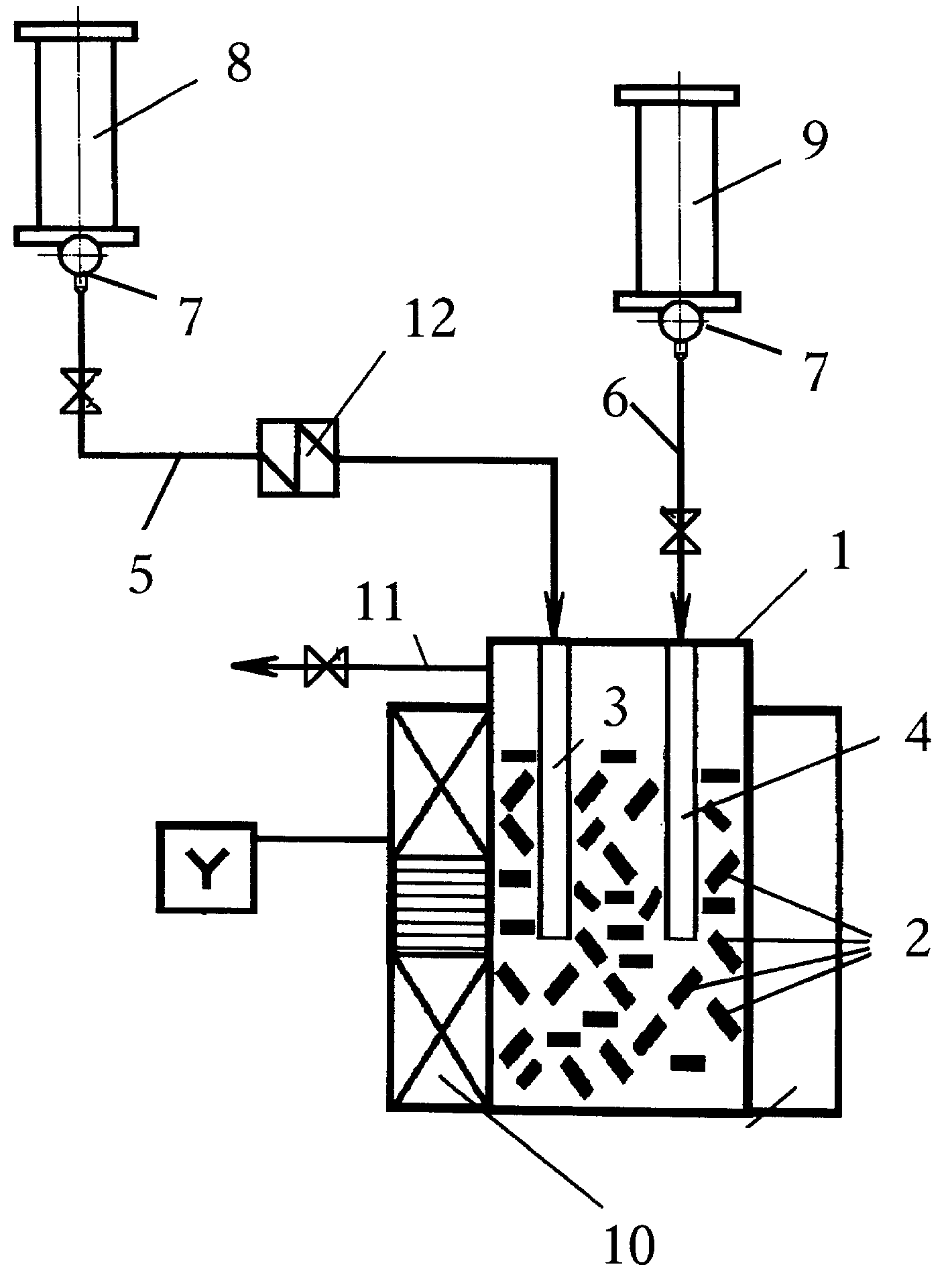 Изобретение относится к области прикладной биотехнологии и может быть использовано в медицине, косметологии, ветеринарии, растениеводстве и т.п. для повышения эффективности приготовления липосомальных препаратов с высокой степенью гомогенизации и дисперсности. Из уровня техники известно устройство для получения липосомальных препаратов, включающее камеру смешения - гомогенизатор, который выполнен с мешалкой (RU 2104691 С1, А61К 9/127, 1998). При простоте конструктивного выполнения данное устройство не обеспечивает высокой степени гомогенизации и дисперсности полученного продукта. Известно также устройство для получения липосомальных препаратов, включающее емкости с водной средой и с липидным компонентом - раствором липидов в водорастворимом органическом растворителе, которые подсоединены к камере смешения с распыливающим соплом на выходе, при этом водная среда и/или липидный компонент - раствор липидов в водорастворимом органическом растворителе содержат биологически активное вещество (GB 2145107 A, A61J 3/00, 1985). В данном устройстве оба компонента подаются в камеру смешения из соответствующих емкостей под давлением, создаваемым в емкостях преимущественно пропеллантом (нейтральным газом) с последующим их распылением в аэрозольном потоке, что при сложности конструктивного выполнения не обеспечивает возможность получения устойчивой однородной структуры и длительного хранения полученных липосомальных препаратов. Изобретение направлено на создание эффективного устройства для приготовления липосомальных препаратов с высокой степенью гомогенизации и дисперсности. Решение поставленной задачи обеспечивается тем, что в устройстве для получения липосомальных препаратов, включающем камеру смешения, к входным патрубкам которой посредством трубопроводов подсоединены емкость с водной средой и емкость с липидным компонентом - раствором липидов в водорастворимом органическом растворителе, отличающееся тем, что камера смешения содержит корпус из немагнитного материала, внутри которого размещены рабочие элементы из магнитного материала, суммарный объем которых составляет 0,5÷4,0% от объема камеры смешения, а снаружи корпуса установлена система электромагнитных катушек, подключенных к источнику переменного тока, при этом входные патрубки выполнены из немагнитного материала и введены в нижнюю часть корпуса камеры смешения, а выходной патрубок расположен в верхней части корпуса. При этом рабочие элементы выполнены в виде объемных продольных тел, поперечный размер которых в 10÷70 раз меньше продольного размера, составляющего 1÷5 мм. Кроме того, рабочие элементы могут быть выполнены в виде цилиндрических тел, диаметр которых в 10÷70 раз меньше их длины, составляющего 1÷5 мм. Кроме того, рабочие элементы могут быть выполнены в виде шарообразных тел, диаметр которых составляет 100÷200 мкм. При этом на трубопроводах между камерой смешения и емкостями с водной средой и с липидным компонентом - раствором липидов в водорастворимом органическом растворителе включены насосы. Причем на трубопроводе, соединяющим емкость с водной средой с входным патрубком камеры смешения, установлен теплообменник. Кроме того, система электромагнитных катушек выполнена в виде трех симметрично расположенных электромагнитных катушек, подключенных к трехфаз